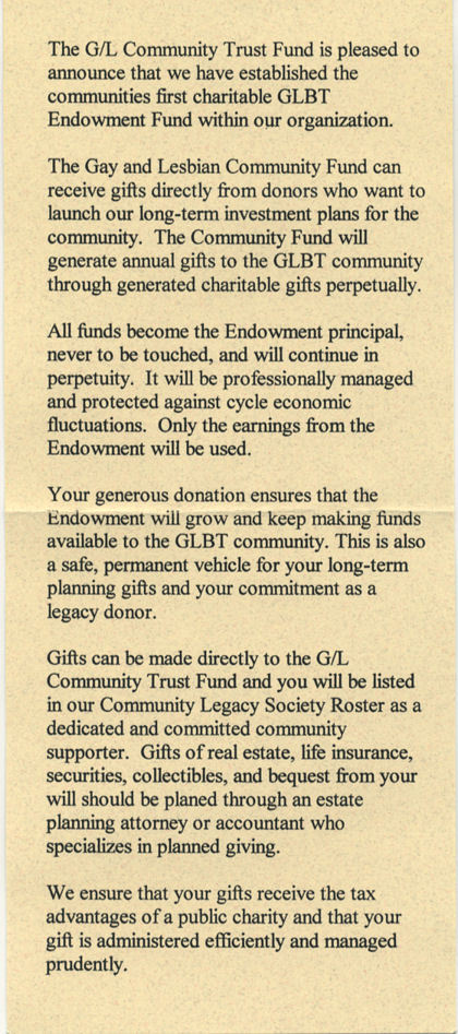 Our long term goals for the LGBT community consist of the G/L Community Endowment Fund and the Building Fund. The G/L Community Fund is operated by volunteers with no paid staff or expensive overhead."