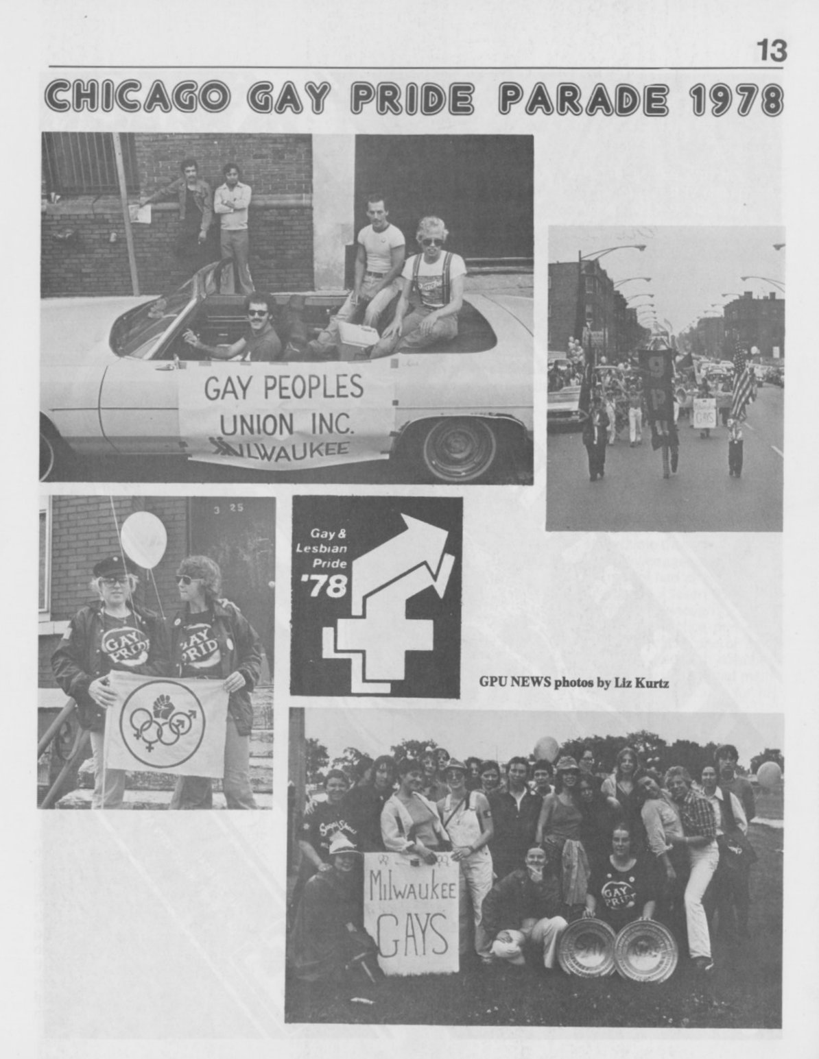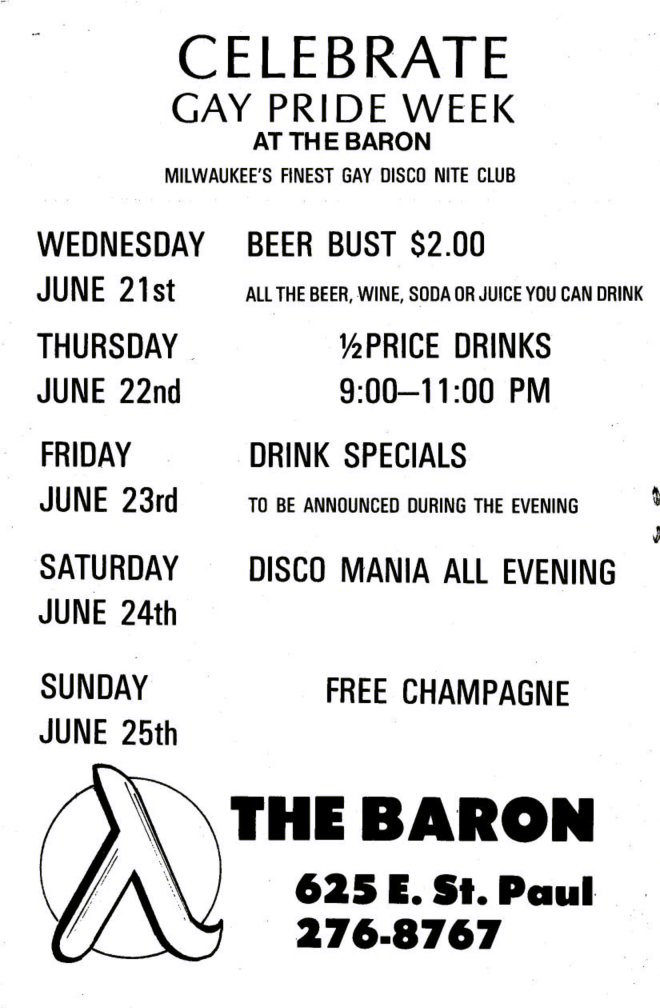 Although there are indications that the GPU (Gay People's Union) was at the forefront of Pride celebrations in Milwaukee beginning in the late 1970's until about 1981, we have not yet found information about any particular organized or coordinated events in Milwaukee in 1978. However, one of the then-popular dance bars (The Baron, or Red Baron) did advertise their "Pride Week" specials, and there is an article on the GPU's participation in Chicago's gay pride parade that year. |