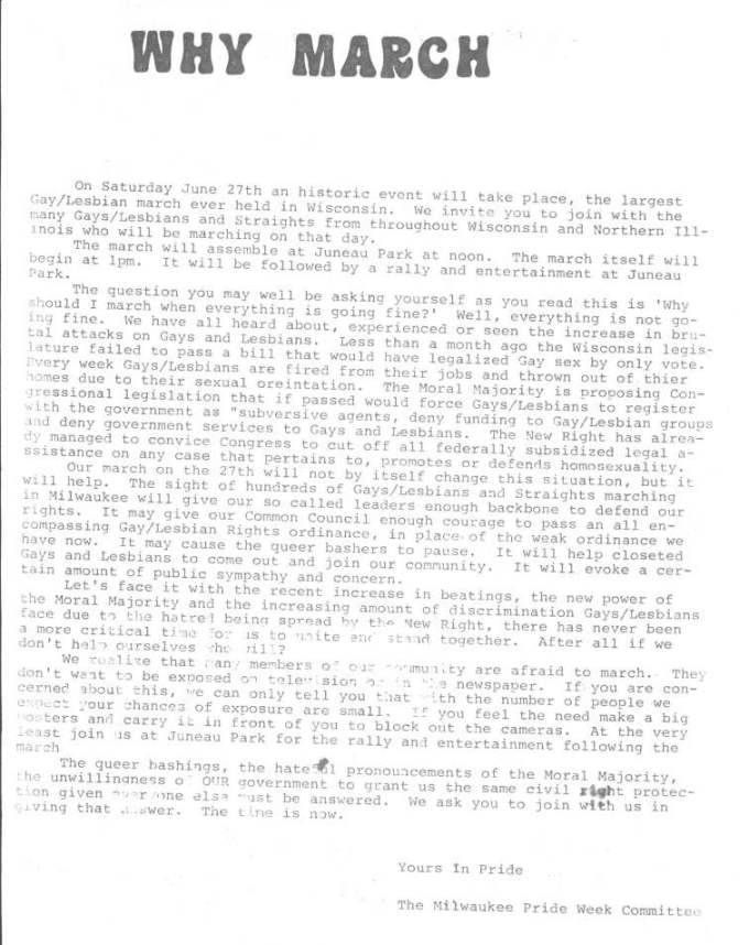 The GPU (Gay People's Union) was at the forefront of Pride celebrations in Milwaukee beginning in the late 1970's. By 1981, a subgroup of the GPU, the Milwaukee Pride Week Committee, began coordinating activities of various organizations and also organized a parade and rally. Flyer from 1981: "Why March"-- "On Saturday June 27th an historic event will take place, the largest Gay/Lesbian march ever held in Wisconsin. We invite you to join with the many Gays/Lesbians and Straights from throughout Wisconsin and Northern Illinois who will be marching on that day. "The march will assemble at Juneau Park at noon. The march itself will begin at 1pm. It will be followed by a rally and entertainment at Juneau Park. "The question you may well ask yourself as you read this is 'Why should I march when everything is going fine?' Well, everything is not going fine. We have all heard about, experienced or seen the increase in brutal attacks on Gays and Lesbians. Less than a month ago the Wisconsin legislature failed to pass a bill that would have legalized Gay sex by (one) vote. Every week Gays/Lesbians are fired from their jobs and thrown out of their homes due to their sexual orientation. The Moral Majority is proposing Congressional legislation that if passed would force Gays/Lesbians to register with the government as "subversive agents, deny funding to Gay/Lesbian groups and deny government service to Gays and Lesbians." The New Right has already managed to convince Congress to cut off all federally subsidized legal assistance on any case that pertains to, promotes or defends homosexuality. "Our march on the 27th will not by itself change this situation, but it will help. The sight of hundreds of Gays/L:esbians and Straights marching in Milwaukee will give our so called leaders enough backbone to defend our rights. It may give our Common Council enough courage to pass an all-encompassing Gay/Lesbian rights ordinance, in place of the weak ordinance we have now. It may cause the queer bashers to pause. It will help closeted Gays and Lesbians come out and join our community. It will evoke a certain amount of public sympathy and concern. "Let's face it- with the recent increase in beatings, the new power of the Moral Majority and the increasing amount of discrimination Gays/Lesbians face due to the hatred being spread by the New Right, there has never been a more critical time for us to united and stand together. After all, if we don't help ourselves, who will? "We realize that many members of our community are afraid to march. They don't want to be exposed on television or in the newspaper. If you are concerned about this, we can only tell you that with the number of people we expect your chances of exposure are small. If you feel the need make a big poster and carry it in front of you to block out the cameras. At the very least join us in Juneau Park for the rally and entertainment following the march. "The queer bashings, the hateful pronouncements of the Moral Majority, the unwillingness of OUR government to grant us the same civil right protectisons given everyone else must be answered. We ask you to join with us in giving that answer. The time is now." Yours in Pride