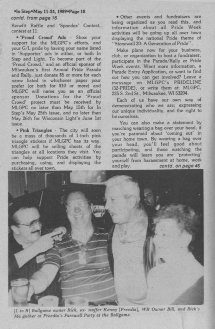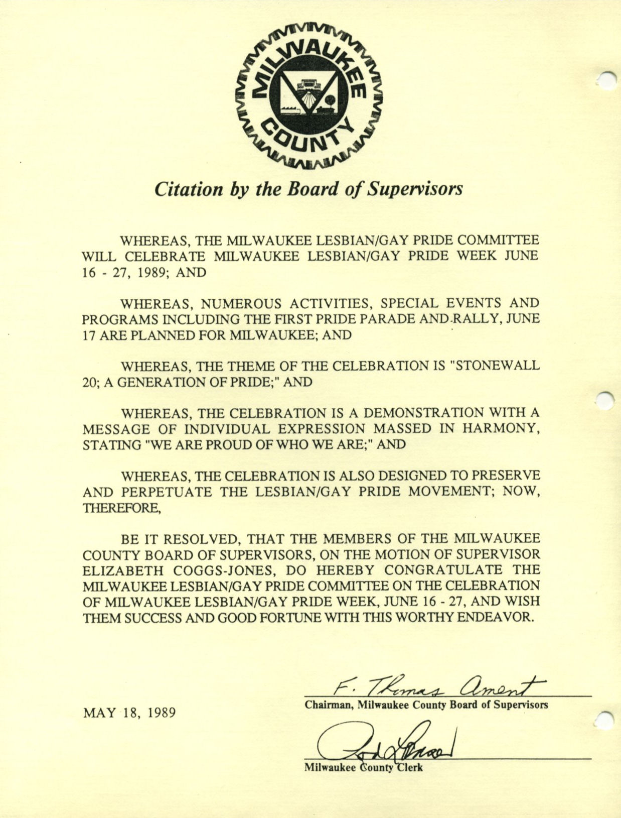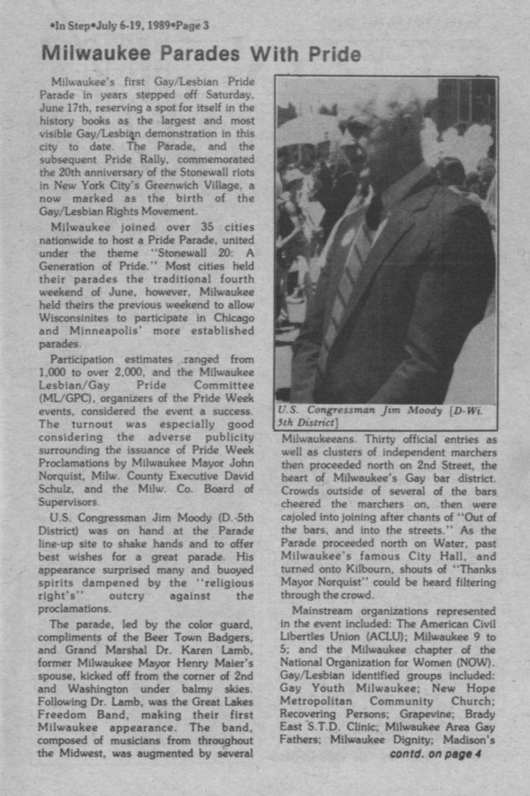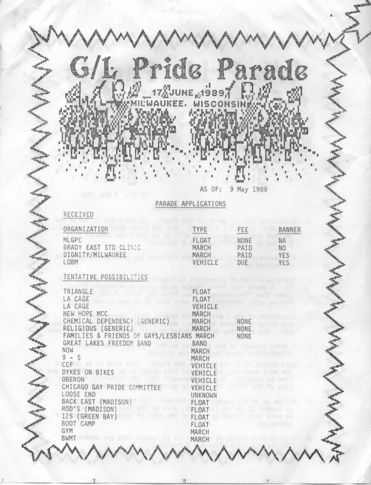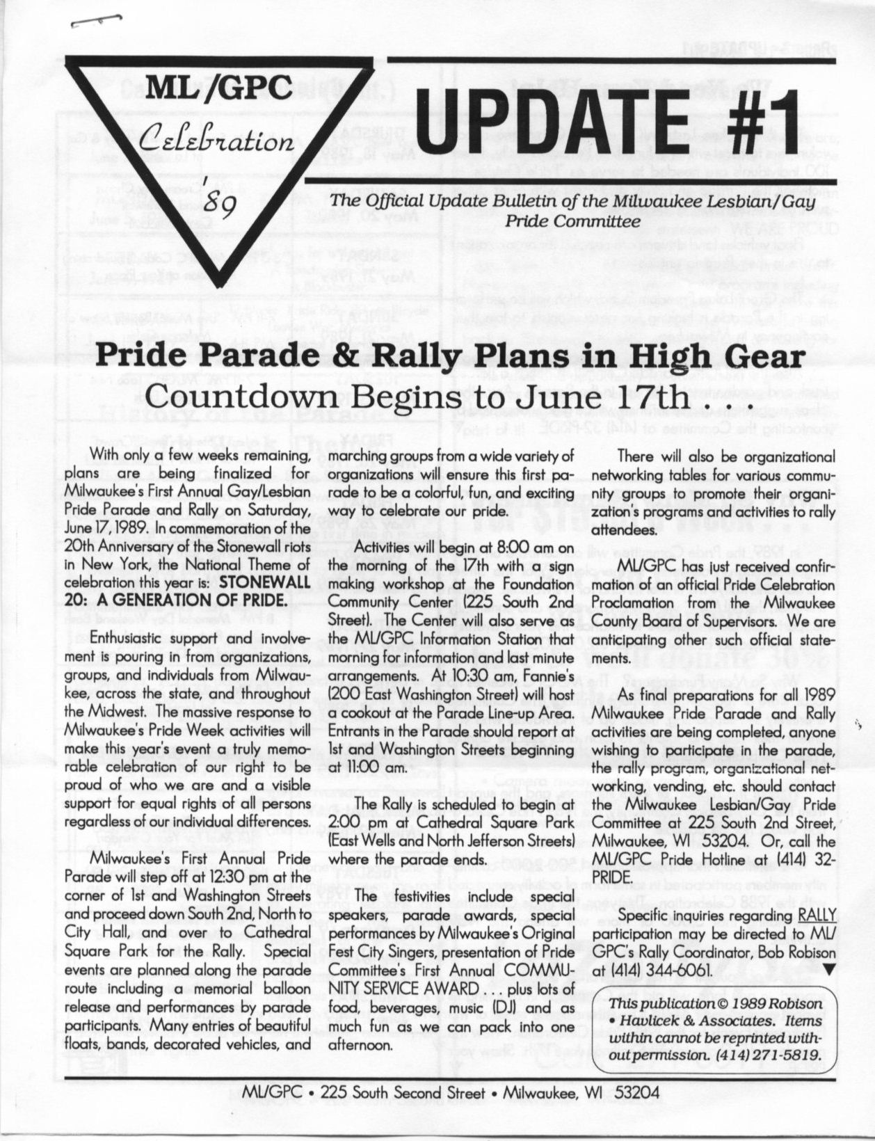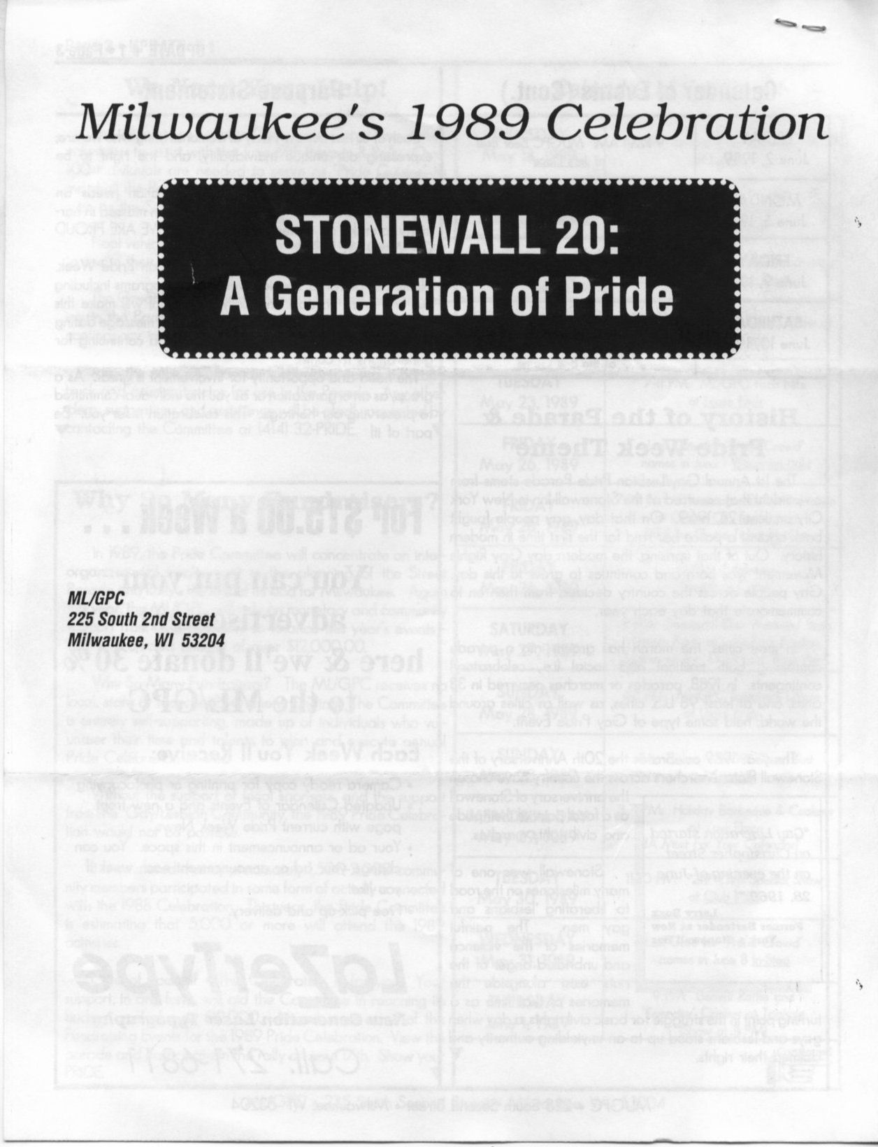 1989 was the second year of operation of the new Milwaukee Lesbian/Gay Pride Committee (MLGPC). In June of 1989, approximately 500 people marched the two miles from the Walker's Point bar district, past City Hall, and to Cathedral Square for a rally where another 500 people had gathered. This particular event generated a great deal of controversy in the City of Milwaukee, especially when the proclamation from Mayor John Norquist ended with the words, “We are proud of who you are.” Both the mayor and county executive were threatened with recall campaigns initiated by religious-based conservative groups. By the end of the day, the MLGPC march and rally was the opening story on all three major news telecasts and featured on the front page of the Sunday Milwaukee Journal. However, the experience did not deter planners for the following year. In fact, the experience turned out to be a rallying point for many people in the LGBT community, spurring more people to get involved with the community. The city could not ignore its LGBT citizens because the LGBT community would no longer allow it. The Board of Directors for 1989 Pride was (in the order they were listed in the Pride Guide):