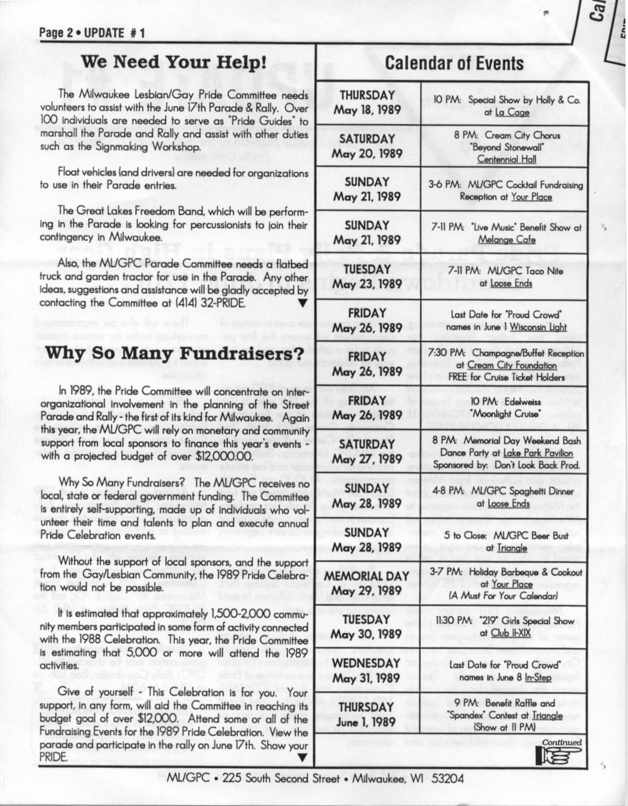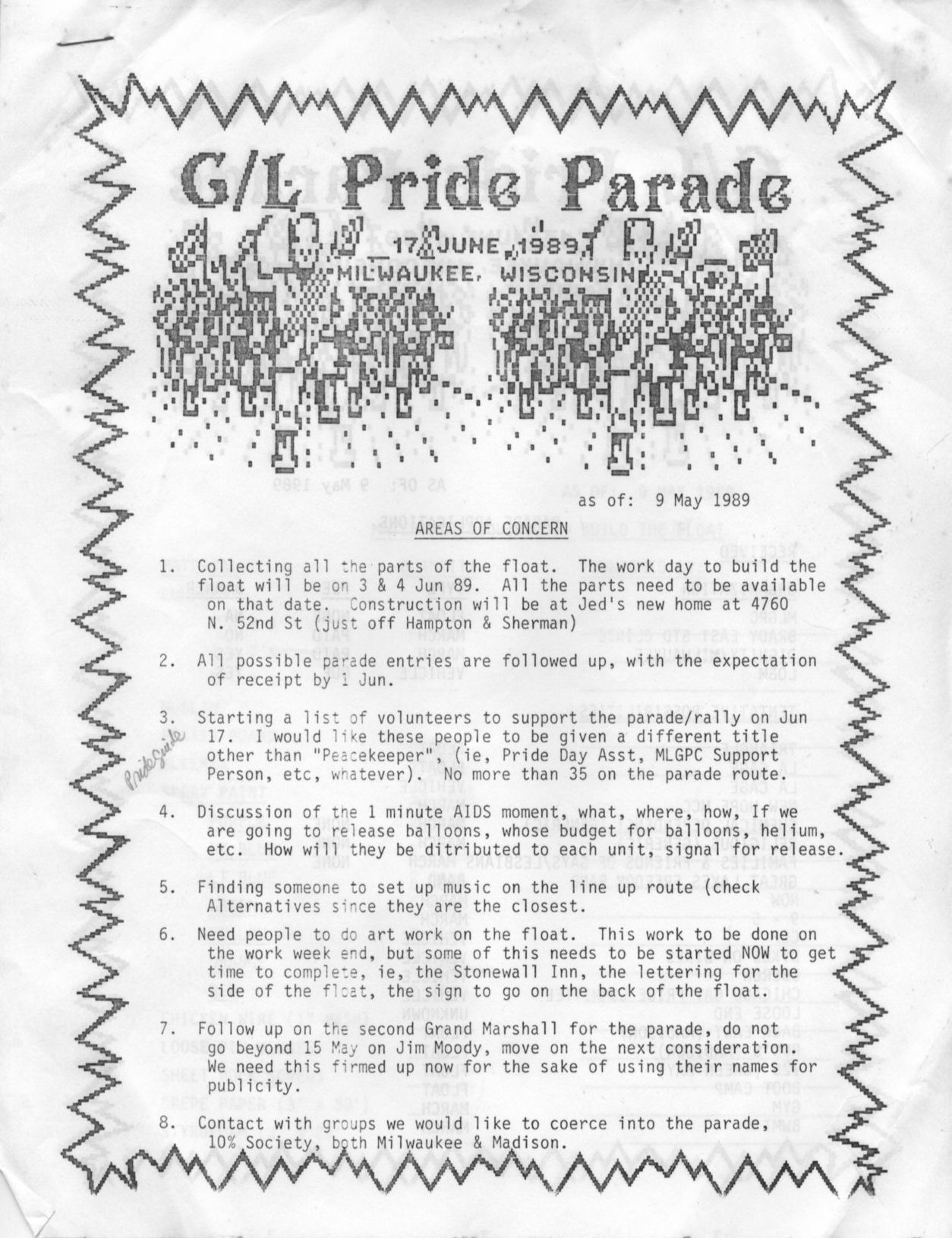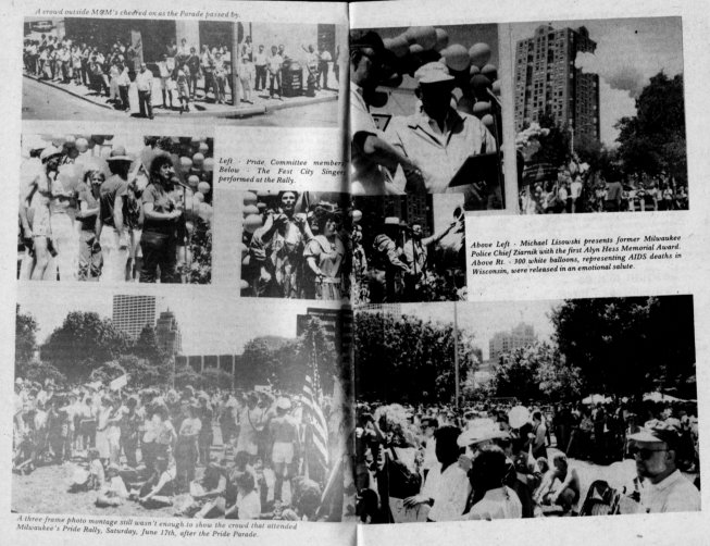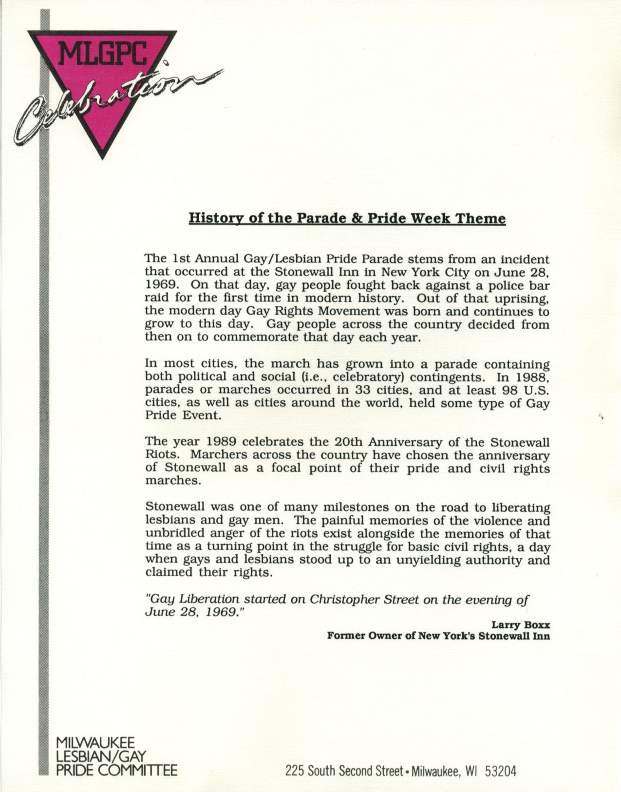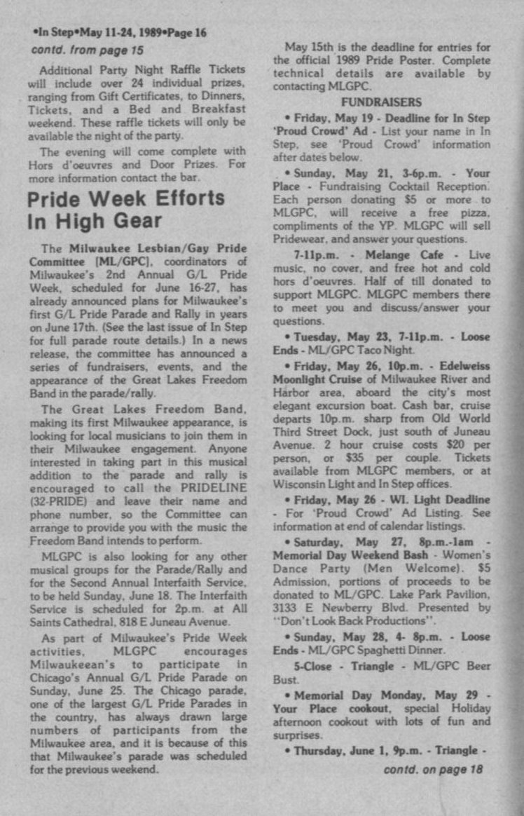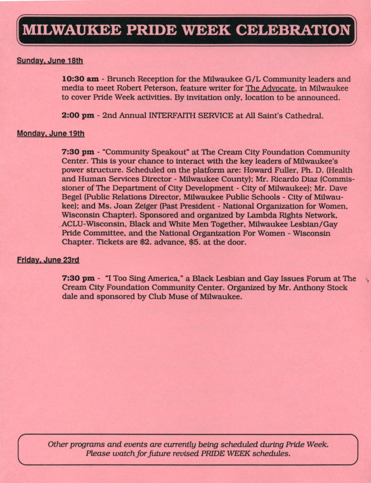 1989 was the second year of operation of the new Milwaukee Lesbian/Gay Pride Committee (MLGPC). In June of 1989, approximately 500 people marched the two miles from the Walker's Point bar district, past City Hall, and to Cathedral Square for a rally where another 500 people had gathered. This particular event generated a great deal of controversy in the City of Milwaukee, especially when the proclamation from Mayor John Norquist ended with the words, “We are proud of who you are.” Both the mayor and county executive were threatened with recall campaigns initiated by religious-based conservative groups. By the end of the day, the MLGPC march and rally was the opening story on all three major news telecasts and featured on the front page of the Sunday Milwaukee Journal. However, the experience did not deter planners for the following year. In fact, the experience turned out to be a rallying point for many people in the LGBT community, spurring more people to get involved with the community. The city could not ignore its LGBT citizens because the LGBT community would no longer allow it. The Board of Directors for 1989 Pride was (in the order they were listed in the Pride Guide):