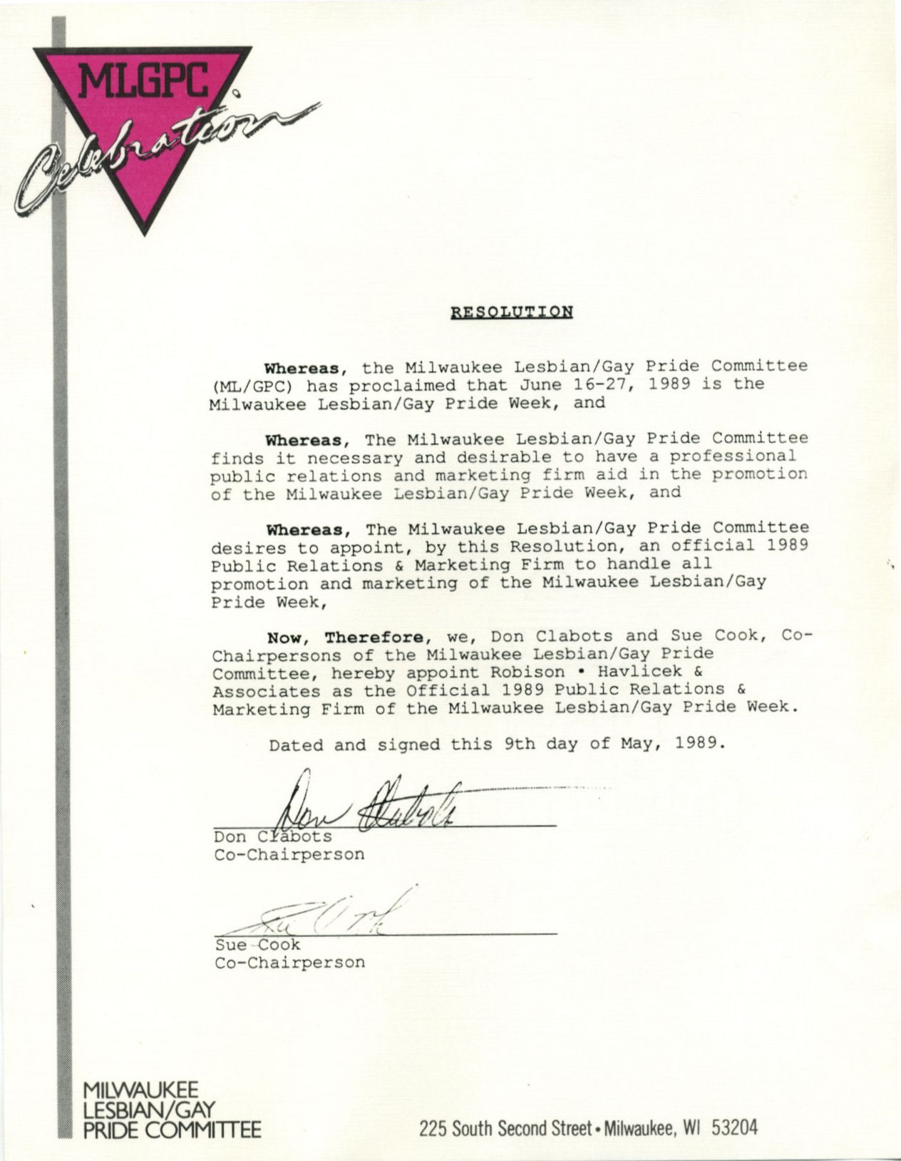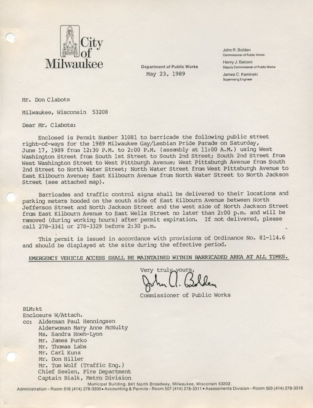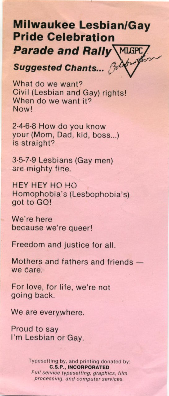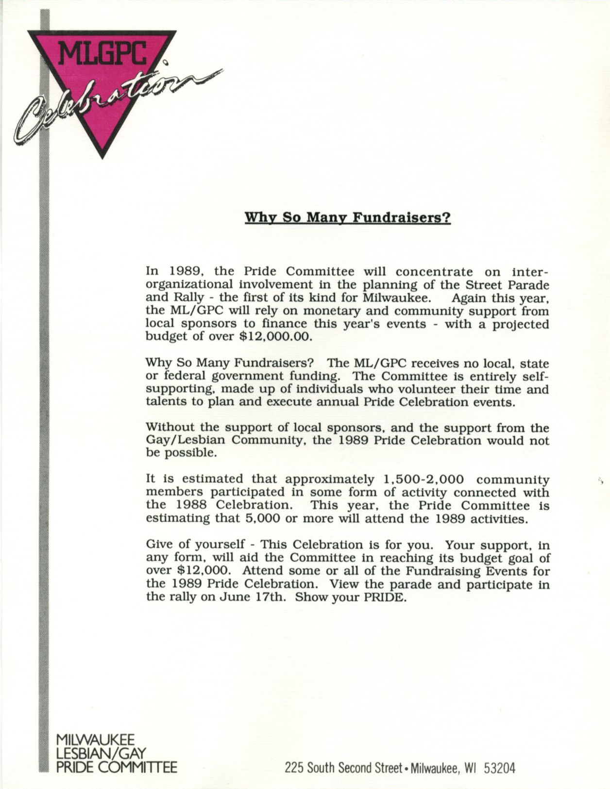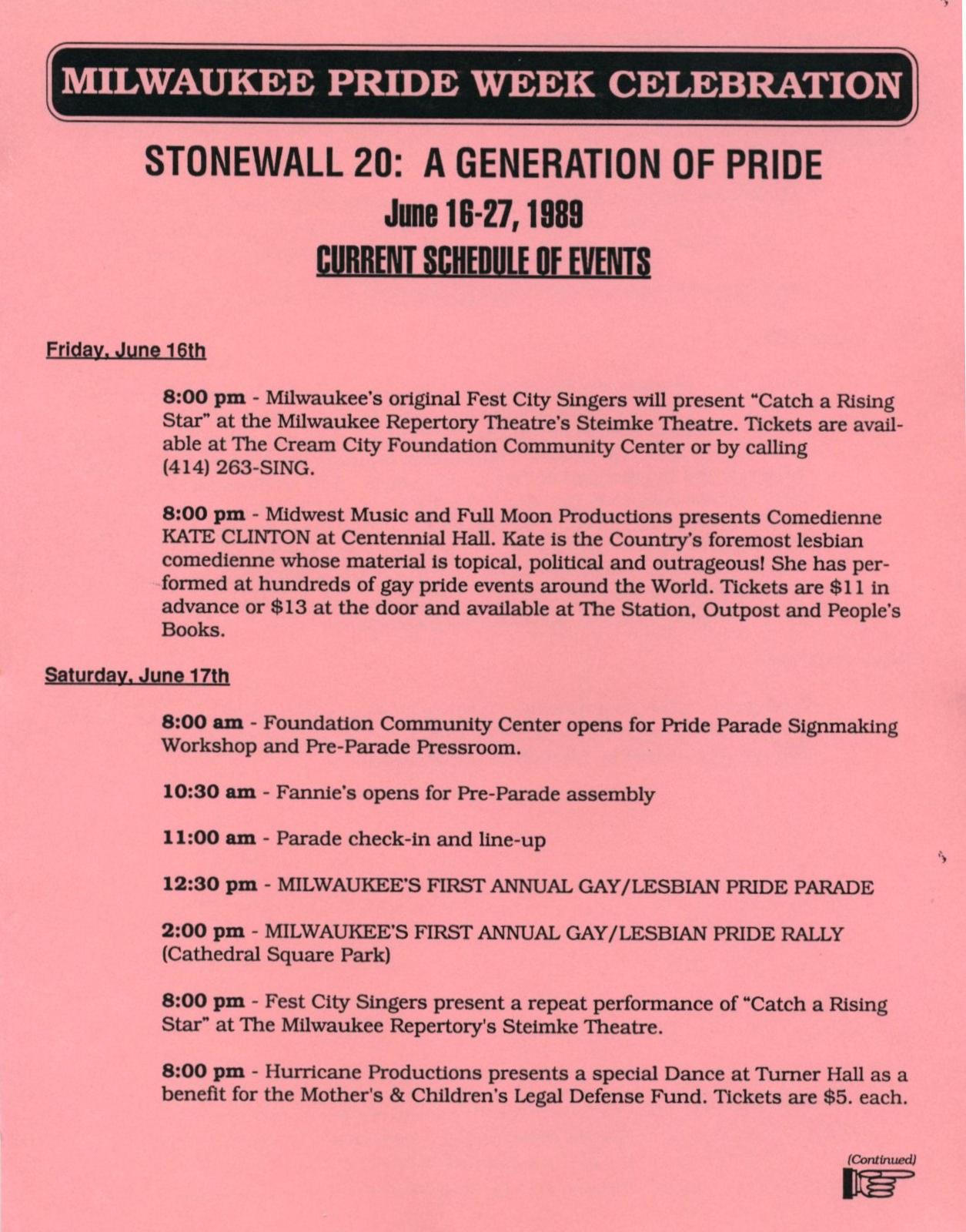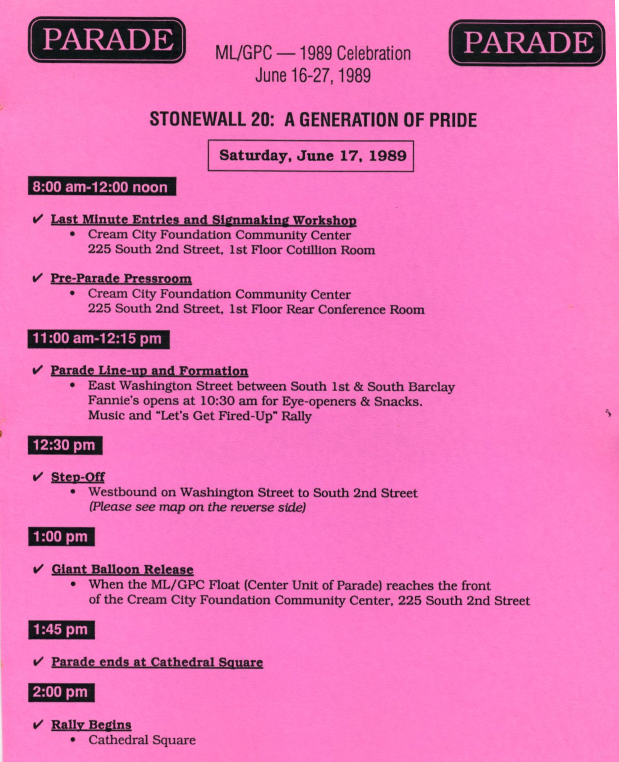 1989 was the second year of operation of the new Milwaukee Lesbian/Gay Pride Committee (MLGPC). In June of 1989, approximately 500 people marched the two miles from the Walker's Point bar district, past City Hall, and to Cathedral Square for a rally where another 500 people had gathered. This particular event generated a great deal of controversy in the City of Milwaukee, especially when the proclamation from Mayor John Norquist ended with the words, “We are proud of who you are.” Both the mayor and county executive were threatened with recall campaigns initiated by religious-based conservative groups. By the end of the day, the MLGPC march and rally was the opening story on all three major news telecasts and featured on the front page of the Sunday Milwaukee Journal. However, the experience did not deter planners for the following year. In fact, the experience turned out to be a rallying point for many people in the LGBT community, spurring more people to get involved with the community. The city could not ignore its LGBT citizens because the LGBT community would no longer allow it. The Board of Directors for 1989 Pride was (in the order they were listed in the Pride Guide):