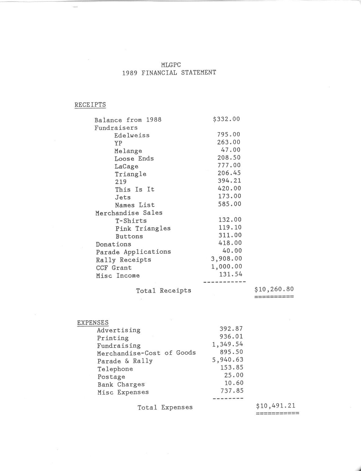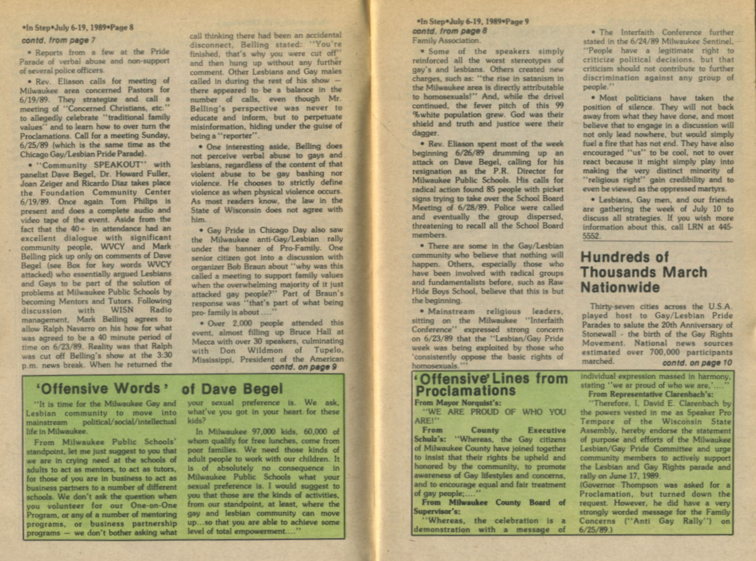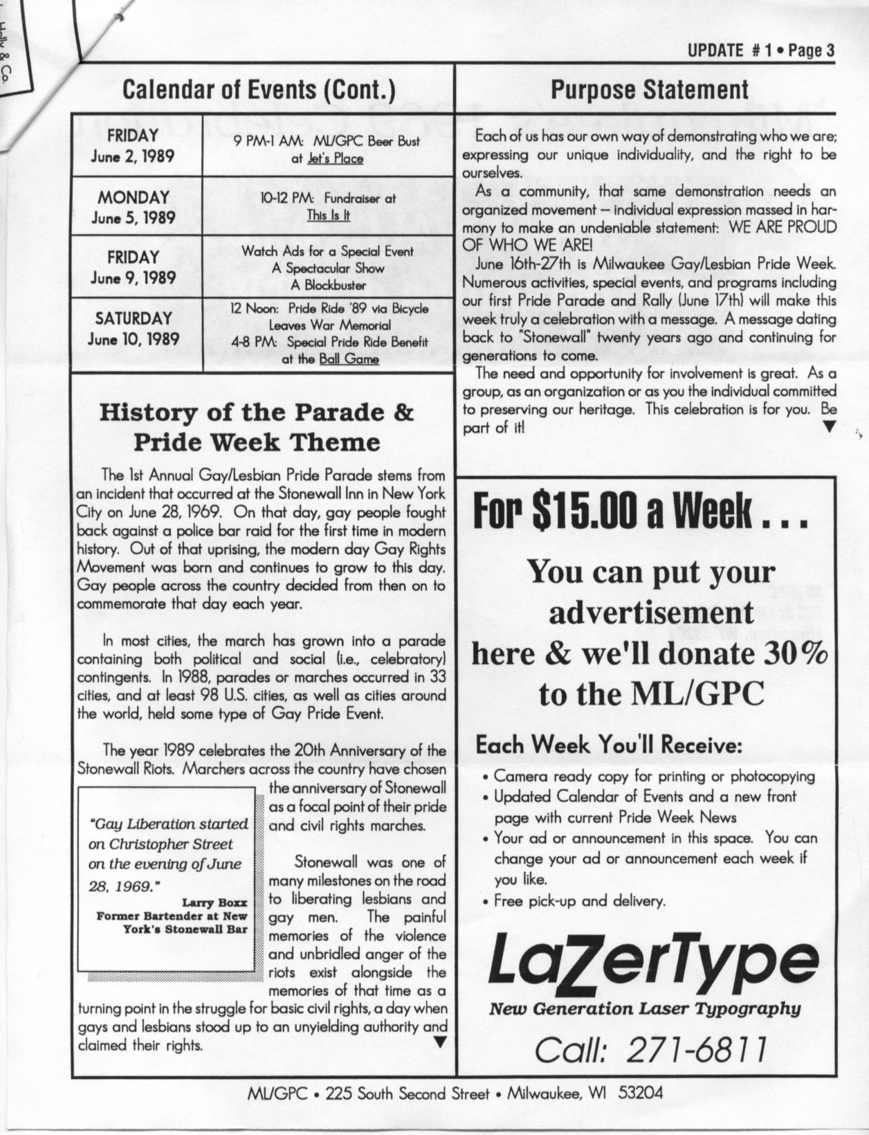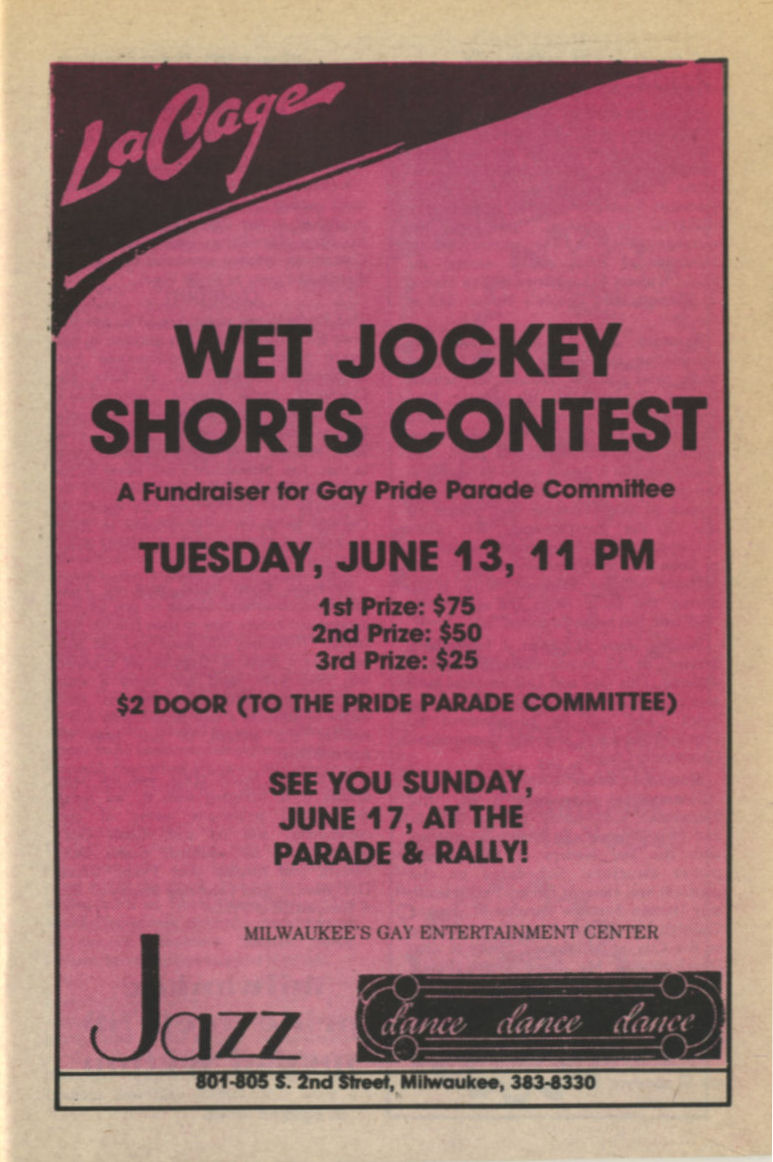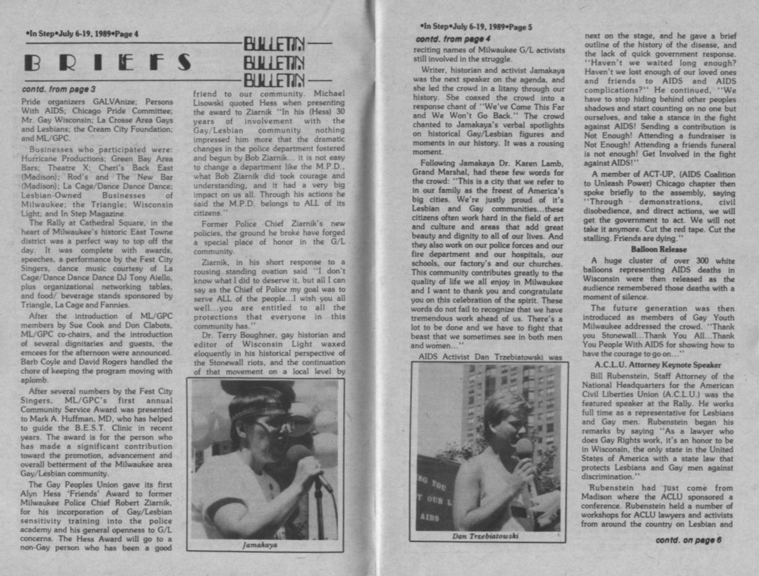 1989 was the second year of operation of the new Milwaukee Lesbian/Gay Pride Committee (MLGPC). In June of 1989, approximately 500 people marched the two miles from the Walker's Point bar district, past City Hall, and to Cathedral Square for a rally where another 500 people had gathered. This particular event generated a great deal of controversy in the City of Milwaukee, especially when the proclamation from Mayor John Norquist ended with the words, “We are proud of who you are.” Both the mayor and county executive were threatened with recall campaigns initiated by religious-based conservative groups. By the end of the day, the MLGPC march and rally was the opening story on all three major news telecasts and featured on the front page of the Sunday Milwaukee Journal. However, the experience did not deter planners for the following year. In fact, the experience turned out to be a rallying point for many people in the LGBT community, spurring more people to get involved with the community. The city could not ignore its LGBT citizens because the LGBT community would no longer allow it. The Board of Directors for 1989 Pride was (in the order they were listed in the Pride Guide):