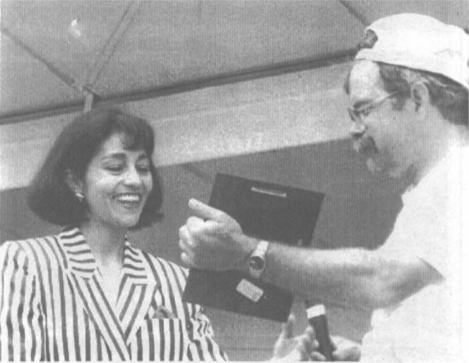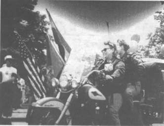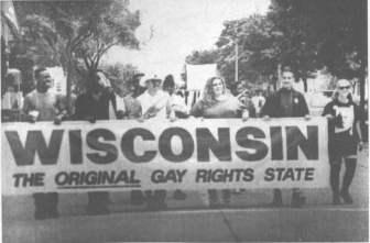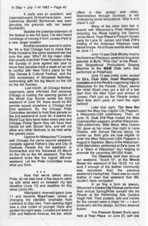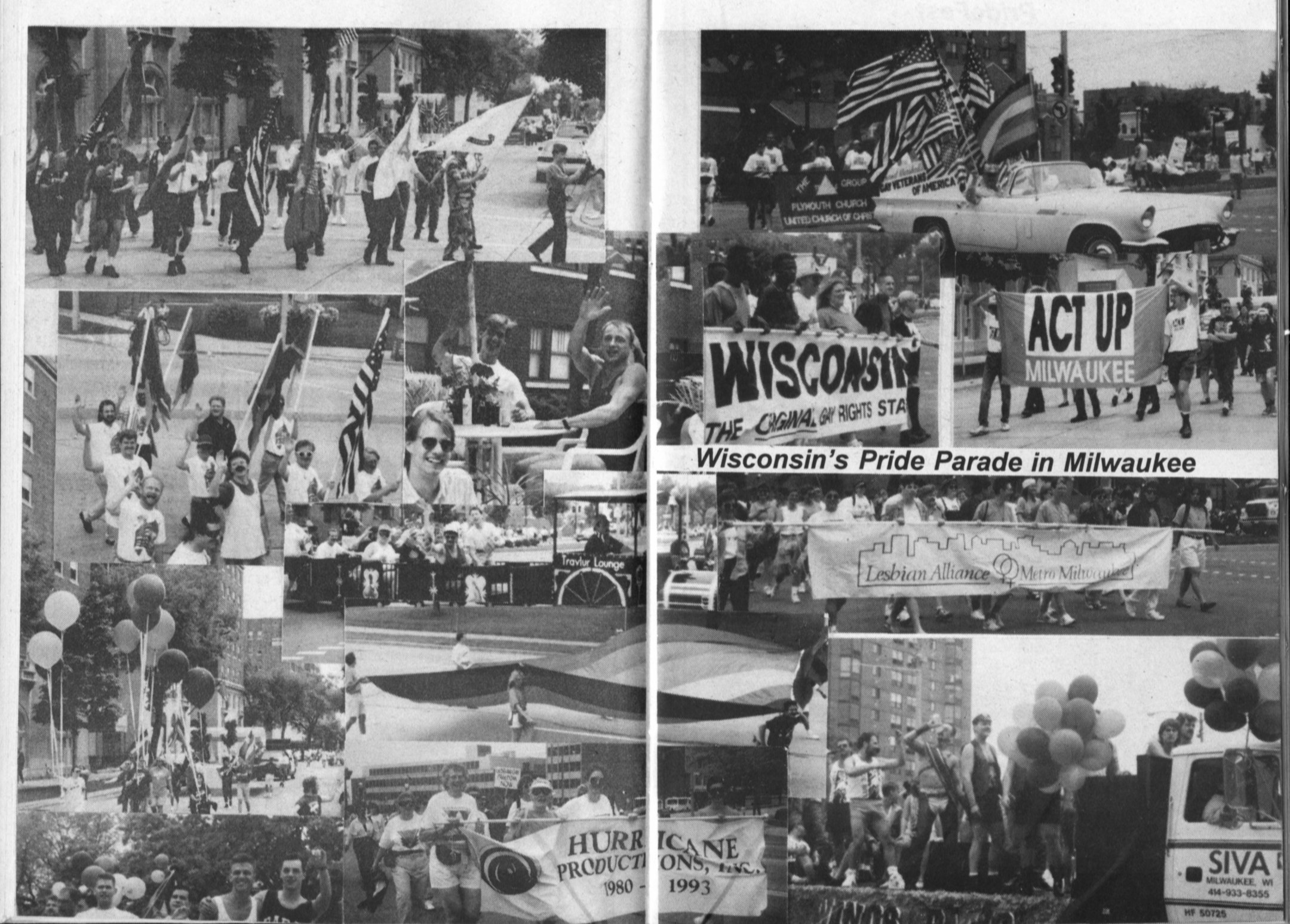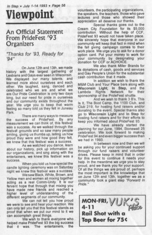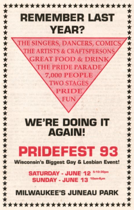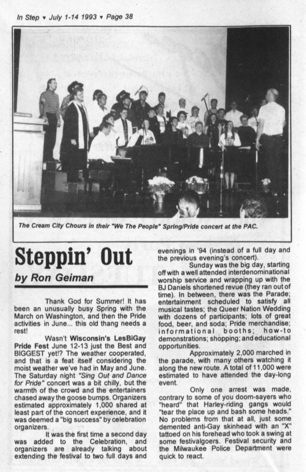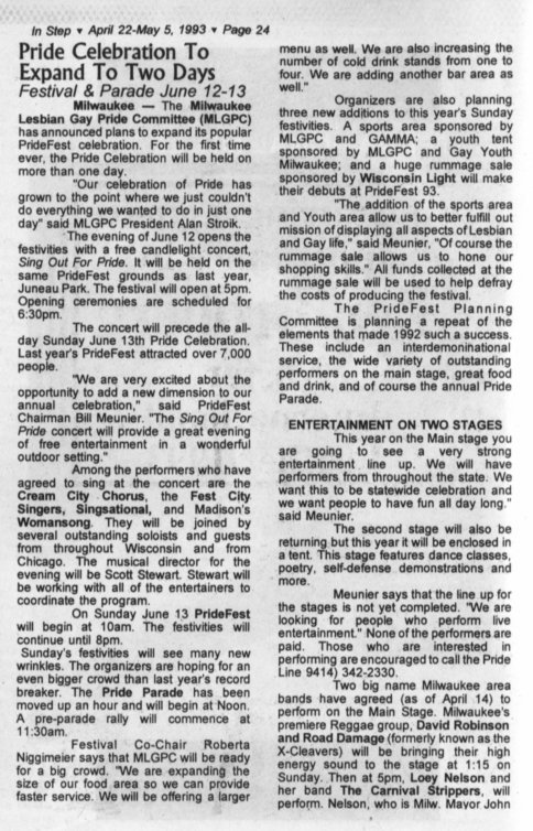 From 1991 through 1993, the Milwaukee Pride Rally was held to Juneau Park along the lakefront, an area that could accommodate the growing crowds. After the previous year's record attendance of about 7,000, the food areas and cold drink stands were expanded. Instrumental this year was a $5,000 grant from the Cream City Foundation, without which the 1993 PrideFest would not have been possible. 1993, with the motto "Forward in Pride", marked the first time ever that Milwaukee's main pride celebration was held over two days. (While in some previous years, various events were held on different days, the main rally or celebration was always a one-day event.) Saturday June 12 was a candelight concert, "Sing Out For Pride", free to all attendees. Performers included Cream City Chorus, Fest City Singers, Singsational, and Madison's Womansong. They were joined by several soloists and guests from throughout Wisconsin, all under the direction of musical director Scott Stewart. 1,000 people were estimated to attend the concert. On Sunday June 13, PrideFest started at 10:00 am, continuing until 8:00 pm. A pre-parade rally was held at 11:30 and the parade kicked off at noon. An estimated 2,000 people participated in the Parade, with many others watching. After the parade, the parade floats were put on display at one end of the festival grounds. The festival featured new additions: a sports area (in cooperation with GAMMA), a youth tent (in cooperation with Gay Youth Milwaukee), and a rummage sale (sponsored by Wisconsin Light). The festival also included successful events from the previous year, such as an interdenominational service, two entertainment stages, and the parade. 11,000 people were estimated to attend the Festival on Sunday, plus those participating in and waatching the Parade. There was one arrest reported over the weekend: according to in Step, "a demented anti-Gay skinhead with an "X" tatooed on his forehead, who took a swing at some festivalgoers. Festival secruity and the Milwaukee Police Department were quick to react.". The Board of Directors for 1993 Pride was (as far as can be determined):