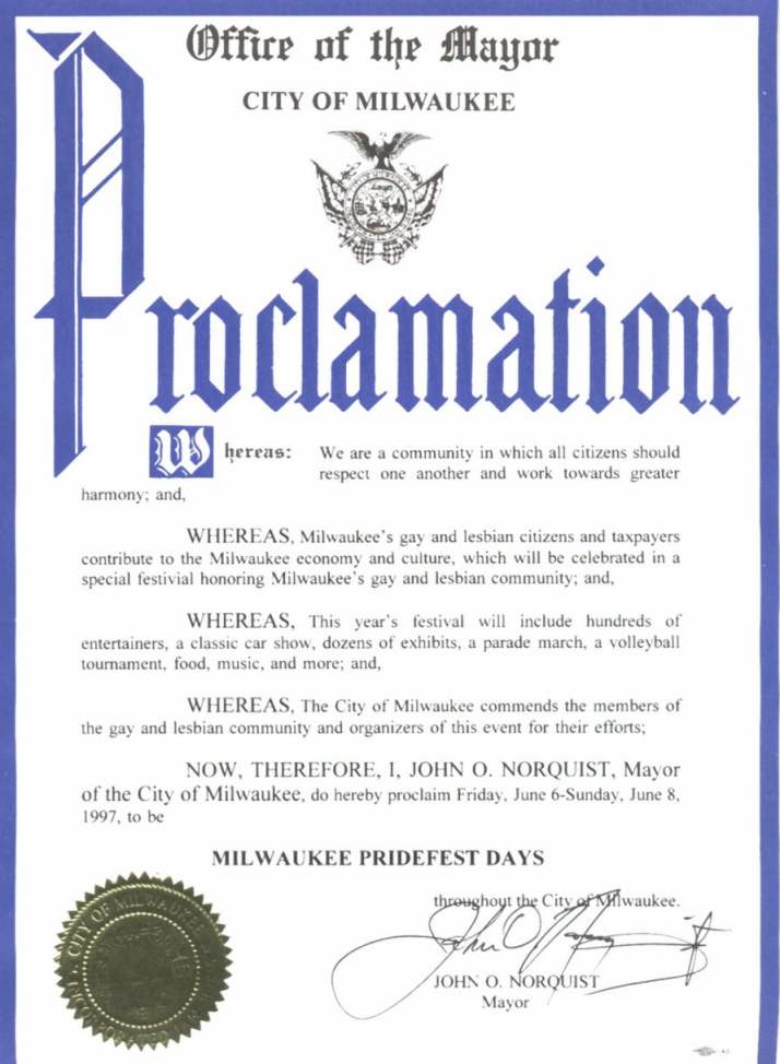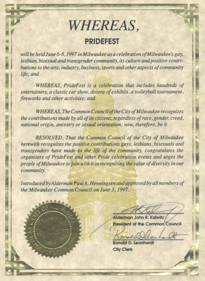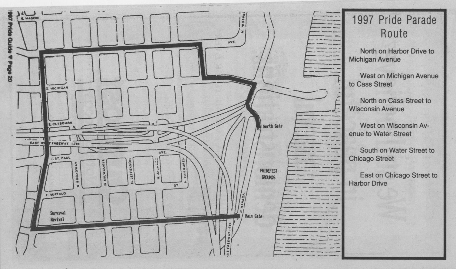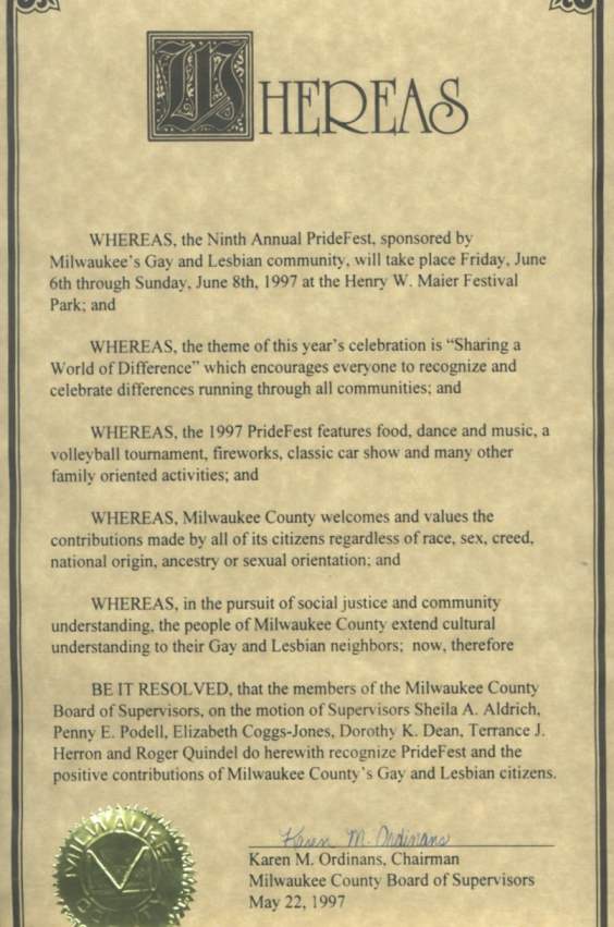 Set for the second year in Henry W. Maier Festival Park (also known as "the Summerfest grounds"), PrideFest 1997 was hosting entertainment on four stages, presentations and lectures in two activity areas, the Miller Lite Volleyball Tournament, the Pride Parade, a religious ceremony on Sunday, a mass wedding/commitment ceremony, and a fireworks show. In addition, over 100 vendors sold merchandise or promoted the services of their organizations. A huge piece of canvas was raised to create PrideFest's largest dance tent ever, covering over 600 people at any one time. At the Miller Stage, friends, family members and lovers danced to the music of tribute band, "Bjorn Again," leaving the festival with a sense of fulfillment. More than once people hesitated to exit through the gates from the fantasy-land come true. It was a family reunion for 12,278 people. The Board of Directors for 1997 Pride was (in the order they were listed in the Pride records):