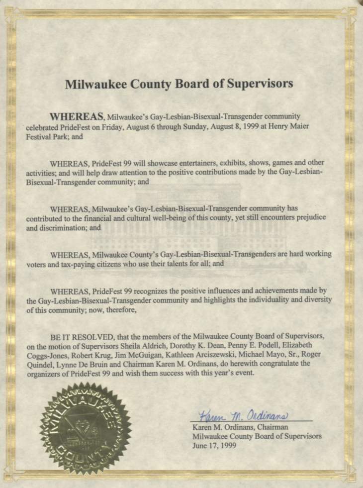 PrideFest was fortunate again in 1999 to have August dates. This time it was due to the five weekends that fell during the month of July. African World Festival, one of the other festivals that used the grounds, opted to take late July dates rather than their traditional first weekend in August, giving PrideFest the opportunity to have another late summer celebration. Despite thunderstorms in surrounding counties, only a few showers fell on the festival on Saturday, with the weather clearing again in time for the Sunday parade. 13,455 attendees passed through the gates and enjoyed three days of camaraderie. The headliner for the festival was Kathy Sledge and her "We Are Family" echoed in the community for many months thereafter. The Board of Directors for 1999 Pride was (in the order they were listed in Pride records):