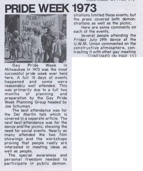 Gay People's Union hosted the Midwest Homophile Conference at the Marc Plaza Hotel in April, which brought national advocates Dr. Frank Kameny, Barbara Gittings and Troy Perry to Milwaukee for the first time. There was no 'Pride' event in 1972. |