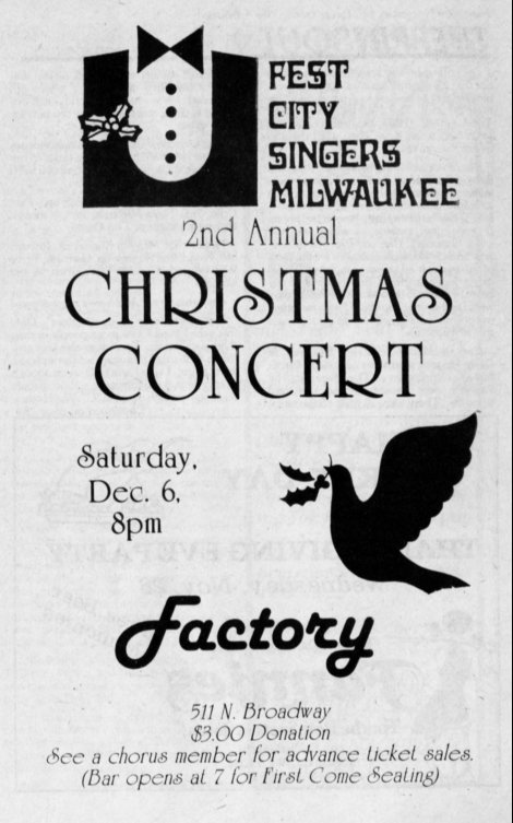 Ad for 2nd Annual Christmas Concert at the Factory, Dec. 1986