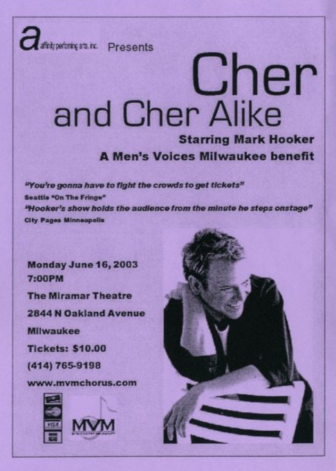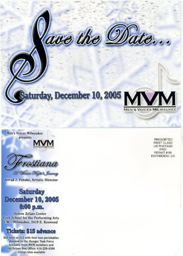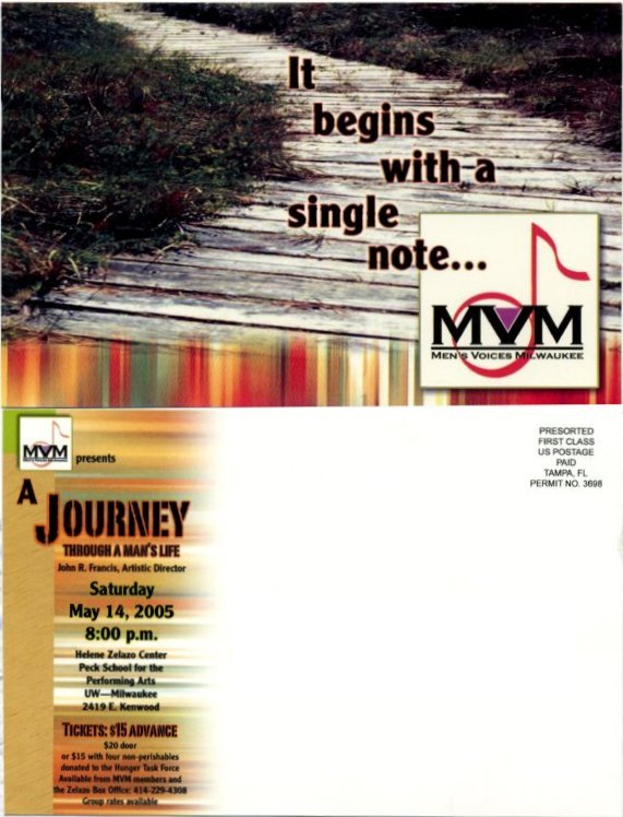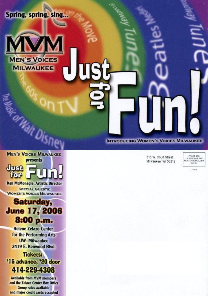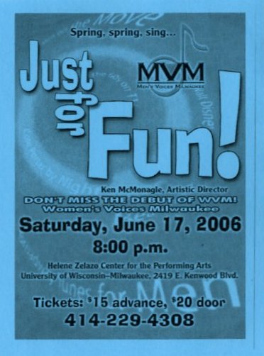Men's Voices Milwaukee (Affinity Performing Arts) was formed in June 2001 and performs three to four times a year in addition to benefit appearances. A tennant of the Milwaukee LGBT Center, they bring musical diversity to the host of organizations found there. In late 2005, the Affinity began to work on a complementary women's chorus, with a fundraiser in October 2005. In June 2006 the Men's Voices concert featured "special guests" the debut performance of the new "Women's Voices Milwaukee" chorus. |