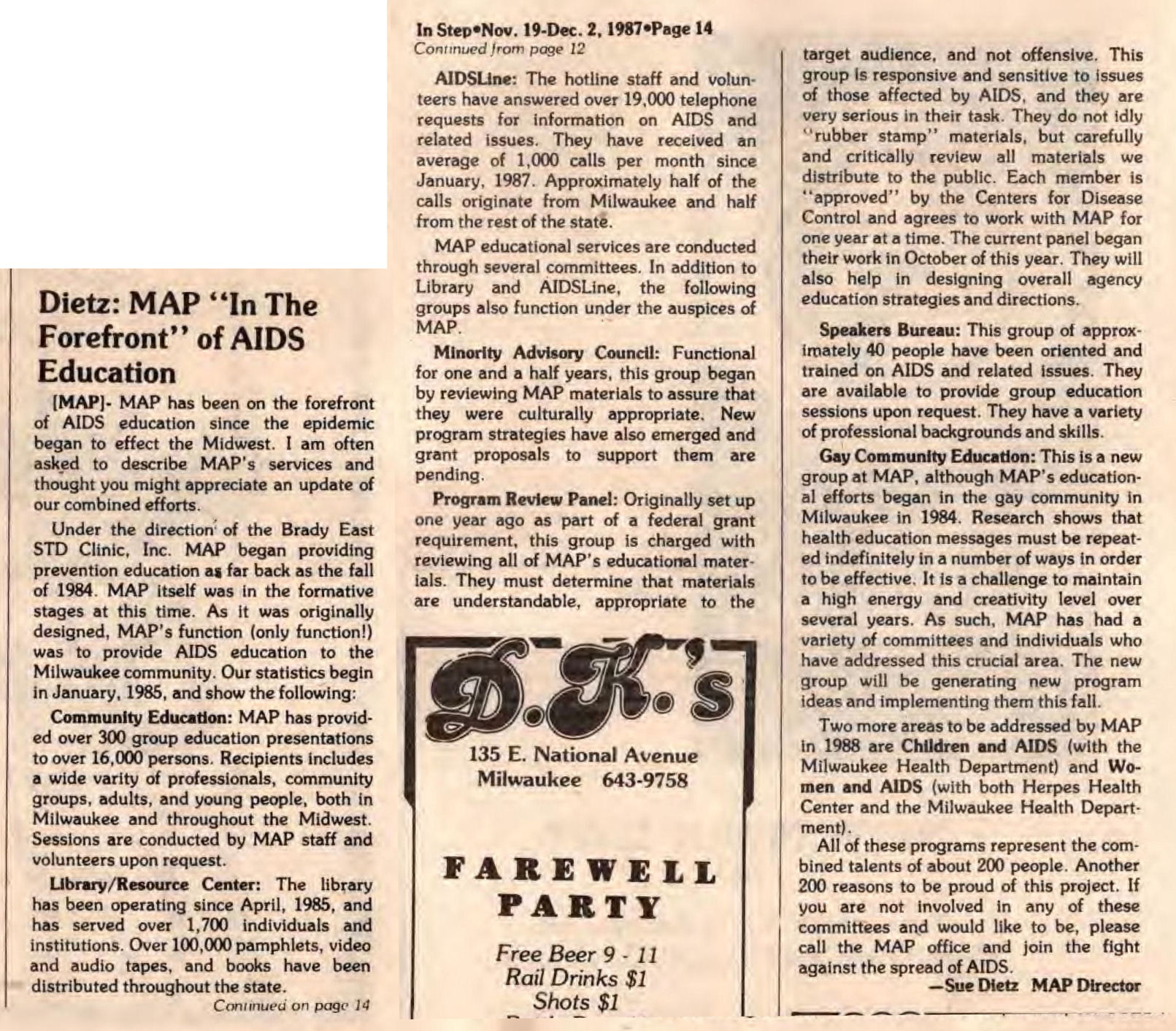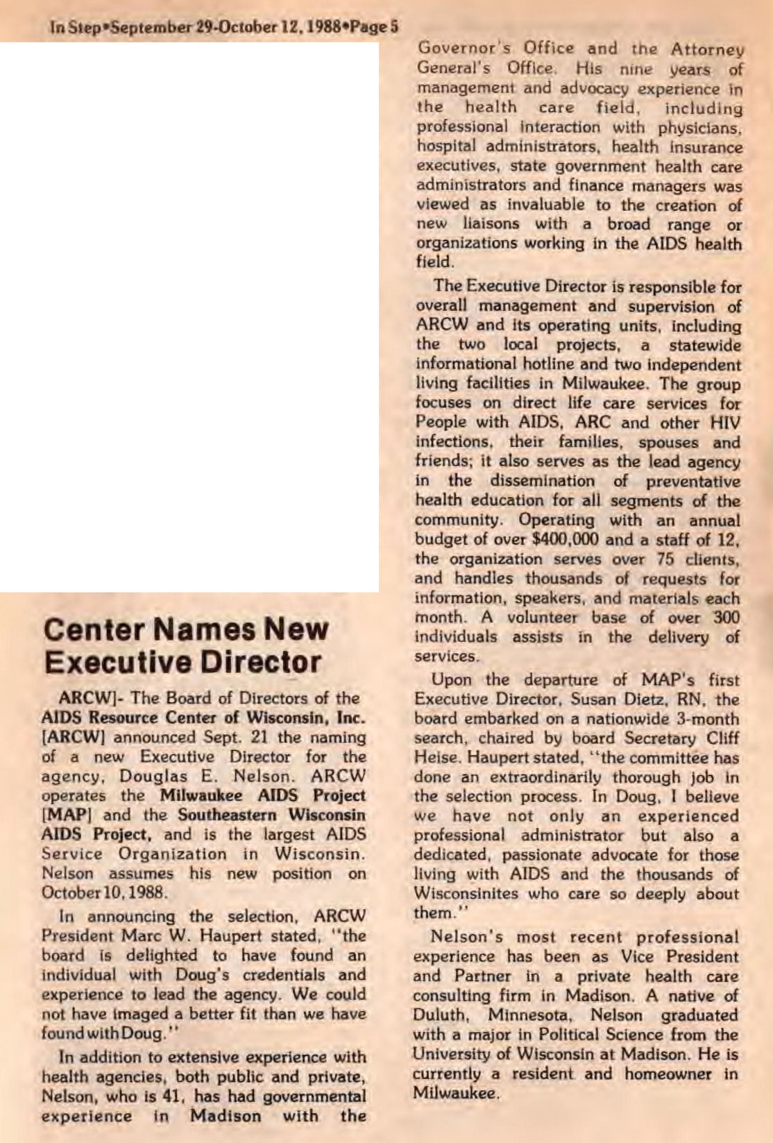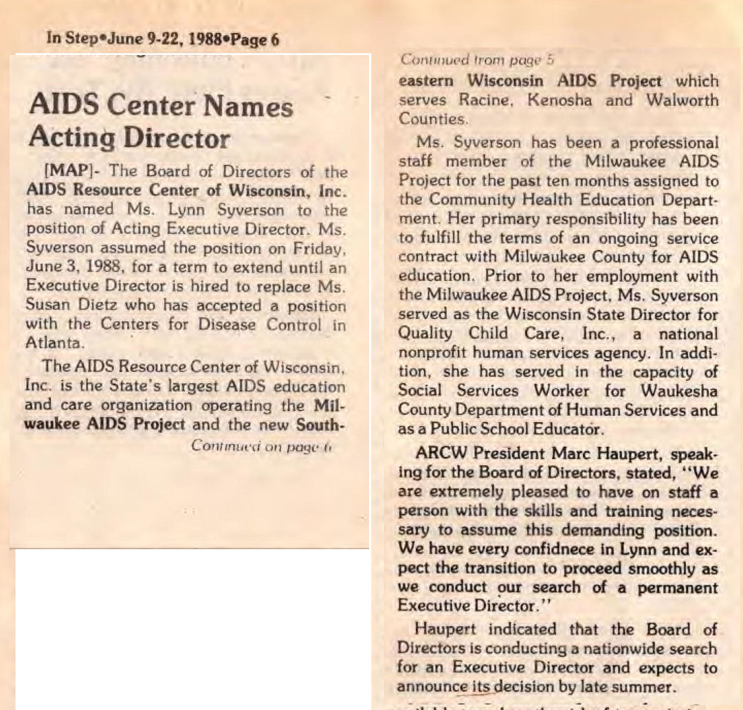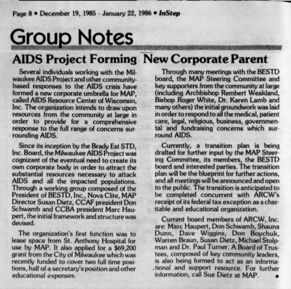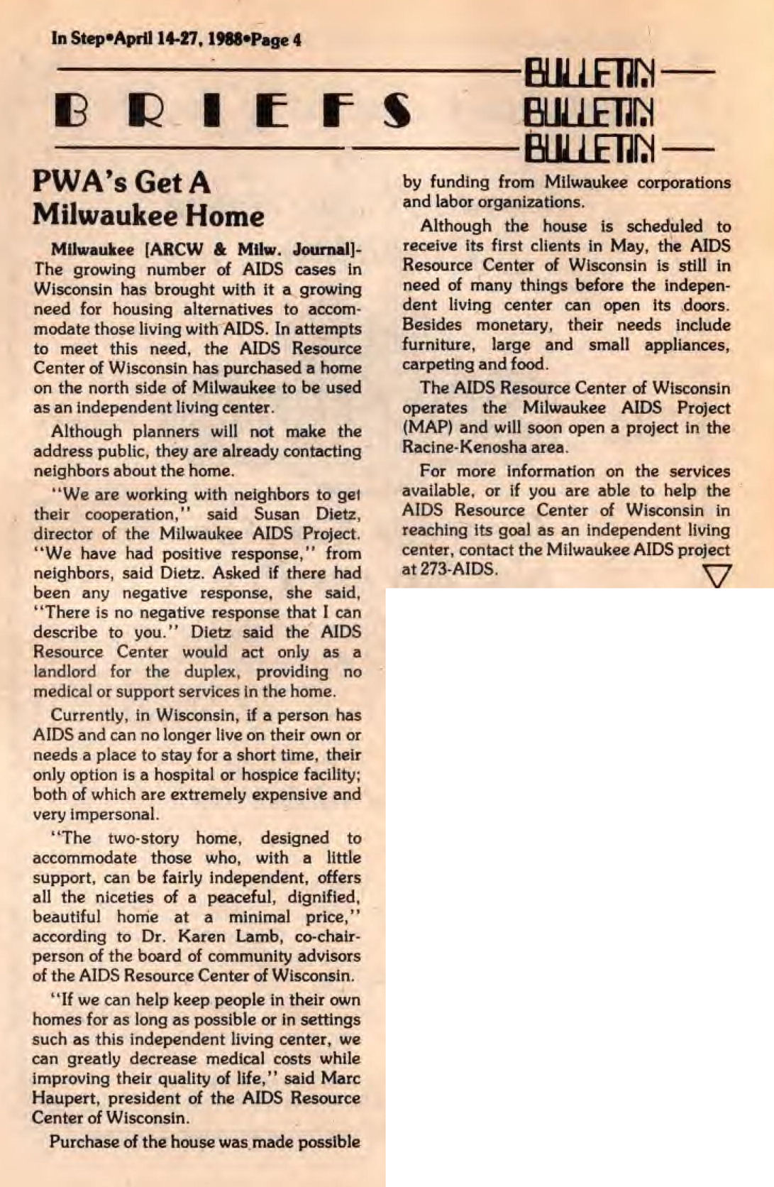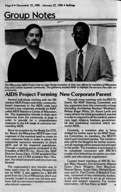 In the early 1980's, with the discovery of a new infection targeting primarily the gay community, the The Brady East STD Clinic (BESTD Clinic) formed a special project, called MAP, or Milwaukee AIDS Project, to address the crisis. As the crisis became more of a threat, it became obvious to the general community that this new disease needed broad community support, and the sad truth was that no "gay" organization could get the recognition that would be required to take advantage of government grants to address the crisis. A task force made up of the BESTD Clinic President, Nova Clite; MAP Director, Sue Dietz; the president of the Cream City Business Association, Marc Haupert; and the president of the Cream City Foundation (CCF) and GAMMA, Don Schwamb, was formed to find a solution. The result was the formation of a new organization, to be spun off from BESTD Clinic's MAP/ Milwaukee AIDS Project- that new organization being named the AIDS Resource Center of Wisconsin. Marc Haupert became ARCW's founding President, Don Schwamb its founding Vice President, and Sue Dietz its first/ paid Executive Director. Incorporated in 1985, ARCW had modest beginnings, with one staff person (Sue Dietz) and primarily focused on addressing needs in the greater Milwaukee area. ARCW was based first in an old residence a block from what was then St. Anthony Hospital near the Milwaukee Police Headquarters building; it later moved to a location at 315 W. Court St., just west of the old Schlitz Brewery complex (the same building that would years later house the Milwaukee LGBT Community Center). During these early years a critical need became a residence for people with AIDS who had no other place to live, and an early major fundraising effort was directed toward finding and renovating a house in the Sherman Park neighborhood, near Sherman and Hadley. Over time the organization continued to grow, becoming truly state-wide in service, with headquarters moving to a building in downtown Milwaukee, and finally to 820 N. Plankinton/ N. 2nd (just south of Kilbourn). By the time of its 20th anniversary in 2005, it had full time staff of over 100 people, presided over by long-time Executive Director Doug Nelson, and with presence in 7 offices throughout the state. "20 giving 20" was one of the ways the AIDS Resource Center of Wisconsin commemorated its first 20 years in the battle against AIDS in Wisconsin. They selected 20 individuals or organizations who were key contributors to the cause throughout those first 20 years, and honored them at the annual Make A Promise dinner and extravaganza. The 19th annual Make A Promise Dinner, Dance & Silent Auction was held on April 9th, 2005 at the Calatrava-designed addition of the Milwaukee Art Museum. Guests enjoyed Milwaukee's best silent auction, delicious food, fireworks and dancing. Landmark events in ARCW's history include the following: