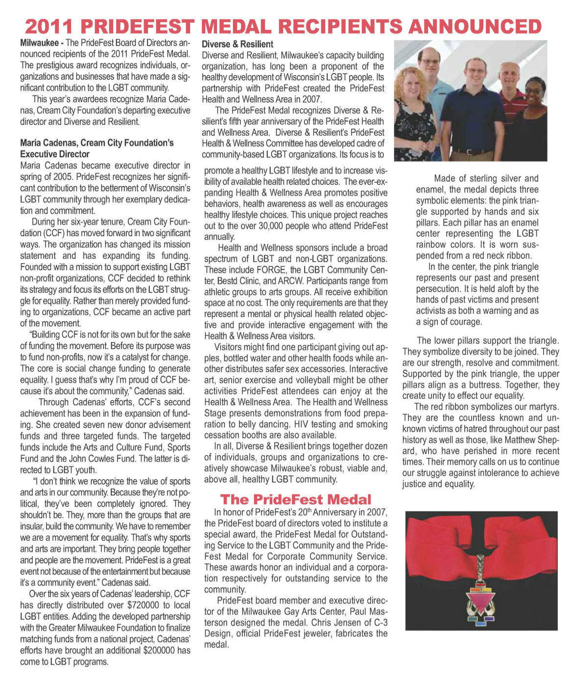 D&R named recipient of 2011 PrideFest Medal for organizing and running PrideFest's Health & Wellness Area for past 5 years