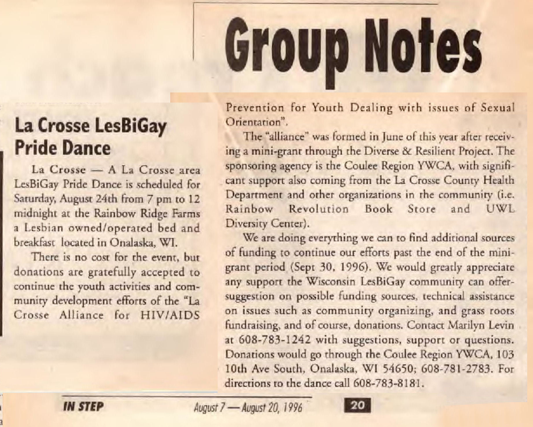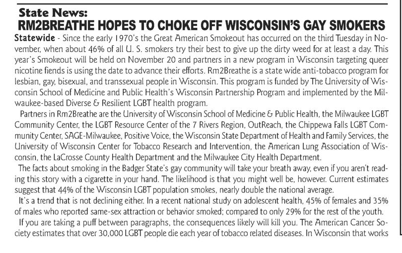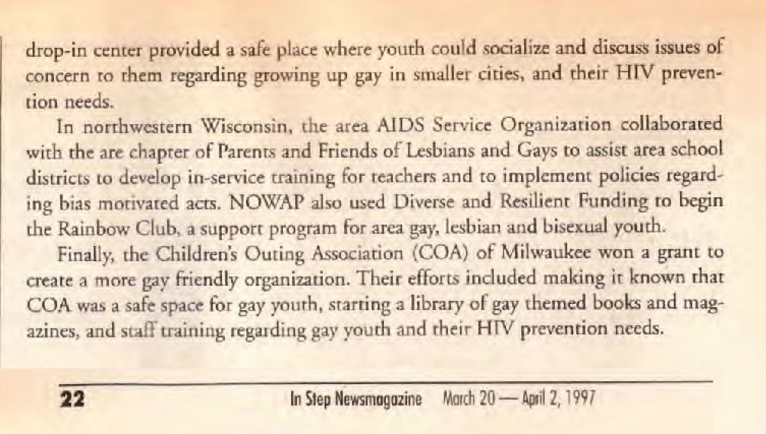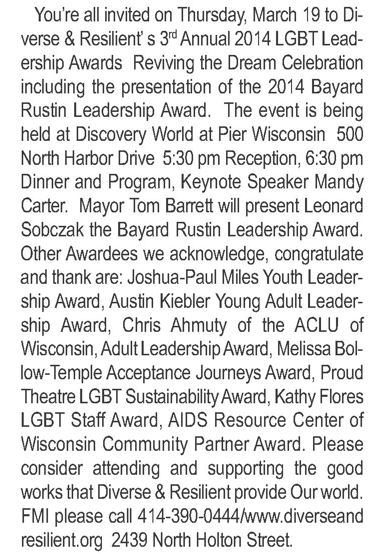Awarded the Nonprofit Organization of the Year award from the Wisconsin LGBT Chamber of Commerce.