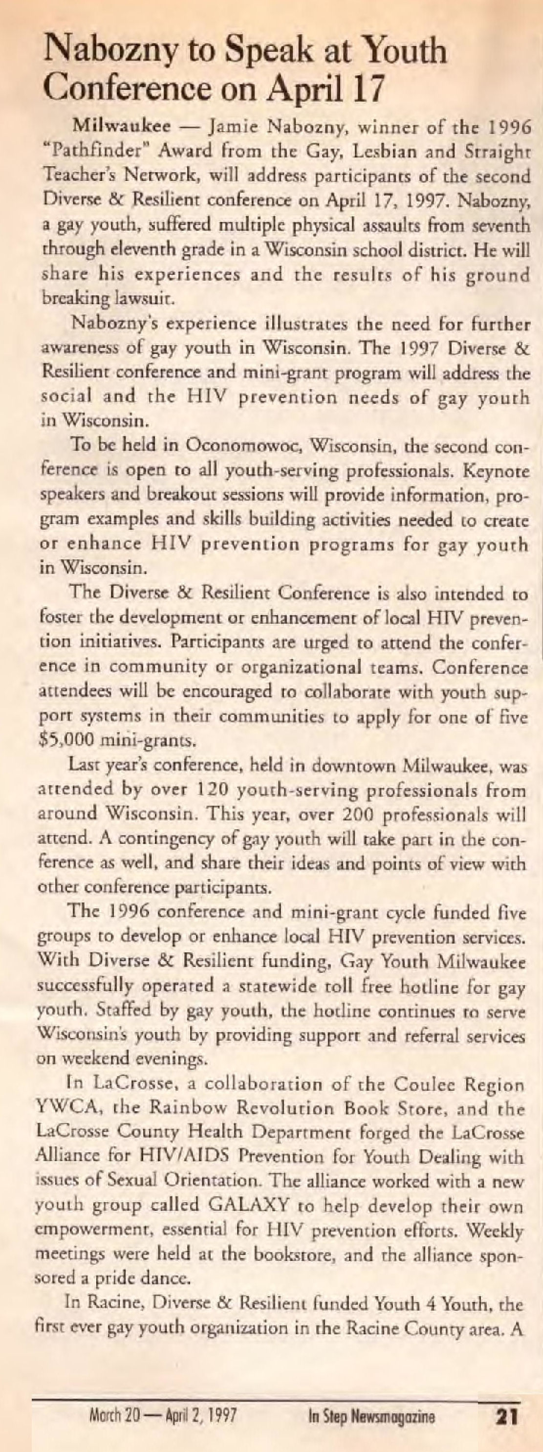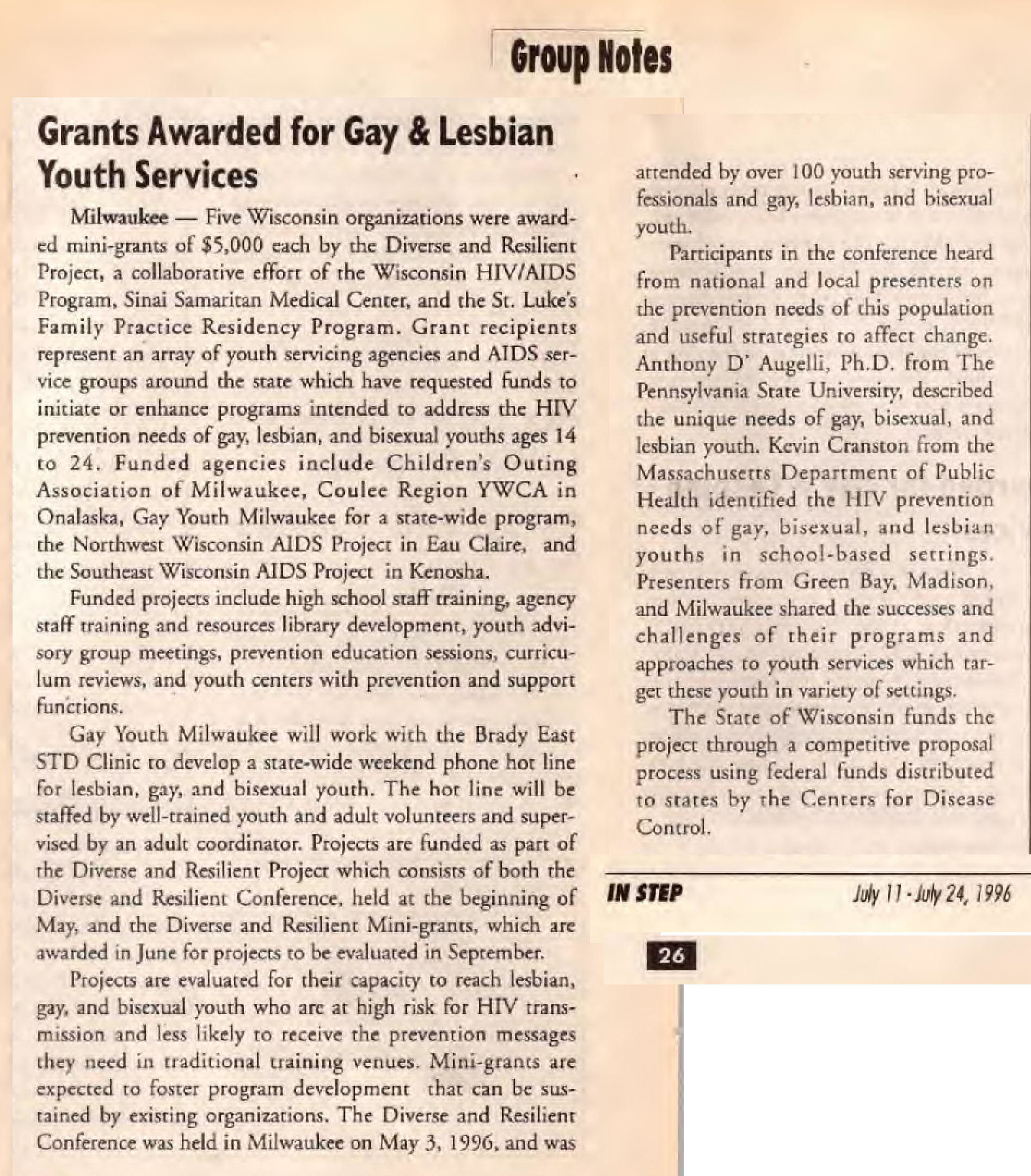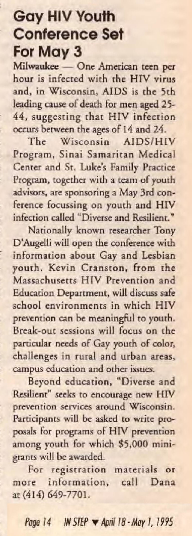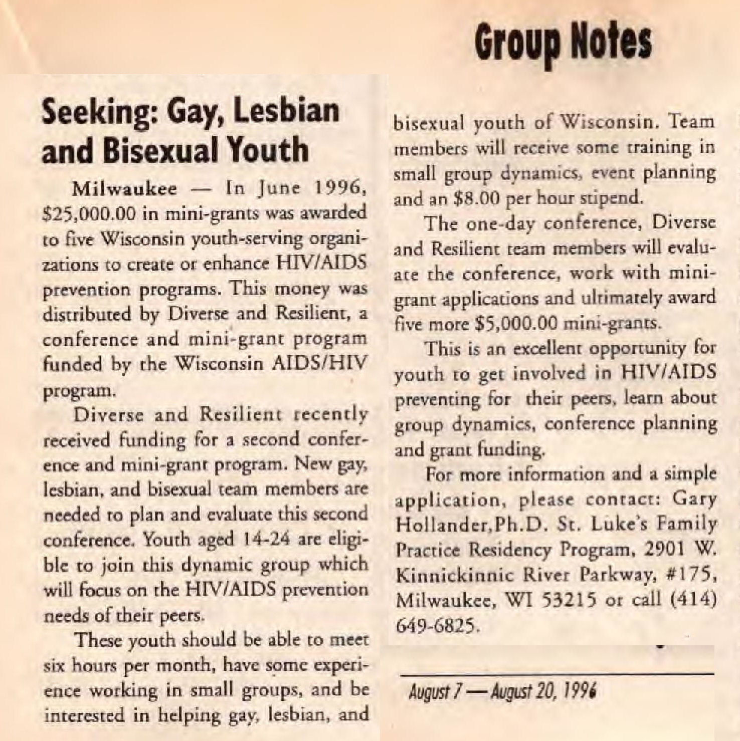 Gay HIV Youth Conference planned by Wis. AIDS/HIV Program, Sinai Samaritan Medical Center and St. Luke's Family Practice Program, establishing "Diverse & Resilient"