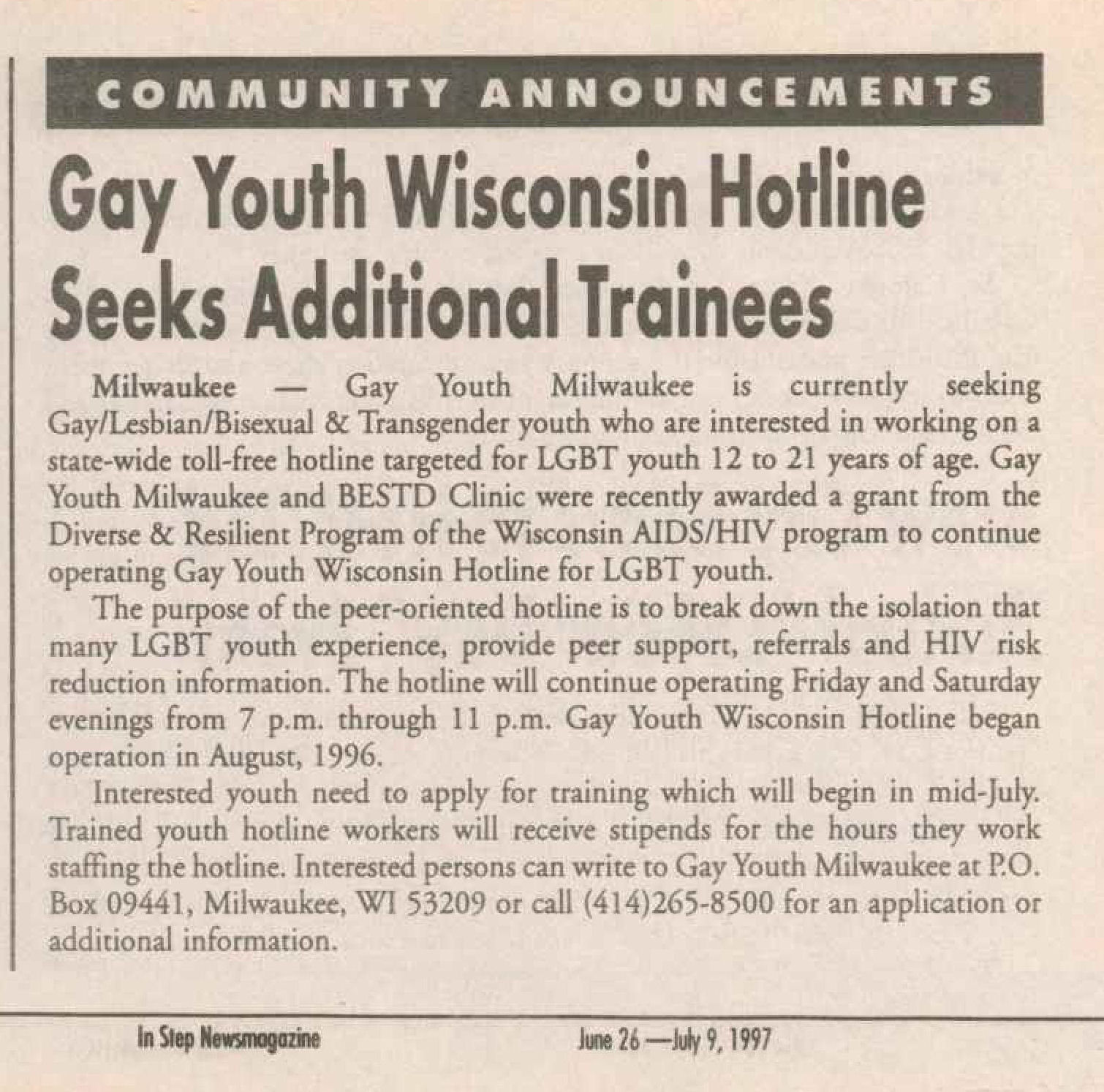 The Rainbow Alliance for Youth (RAY) is launched to create and support LGBT youth groups across the state.