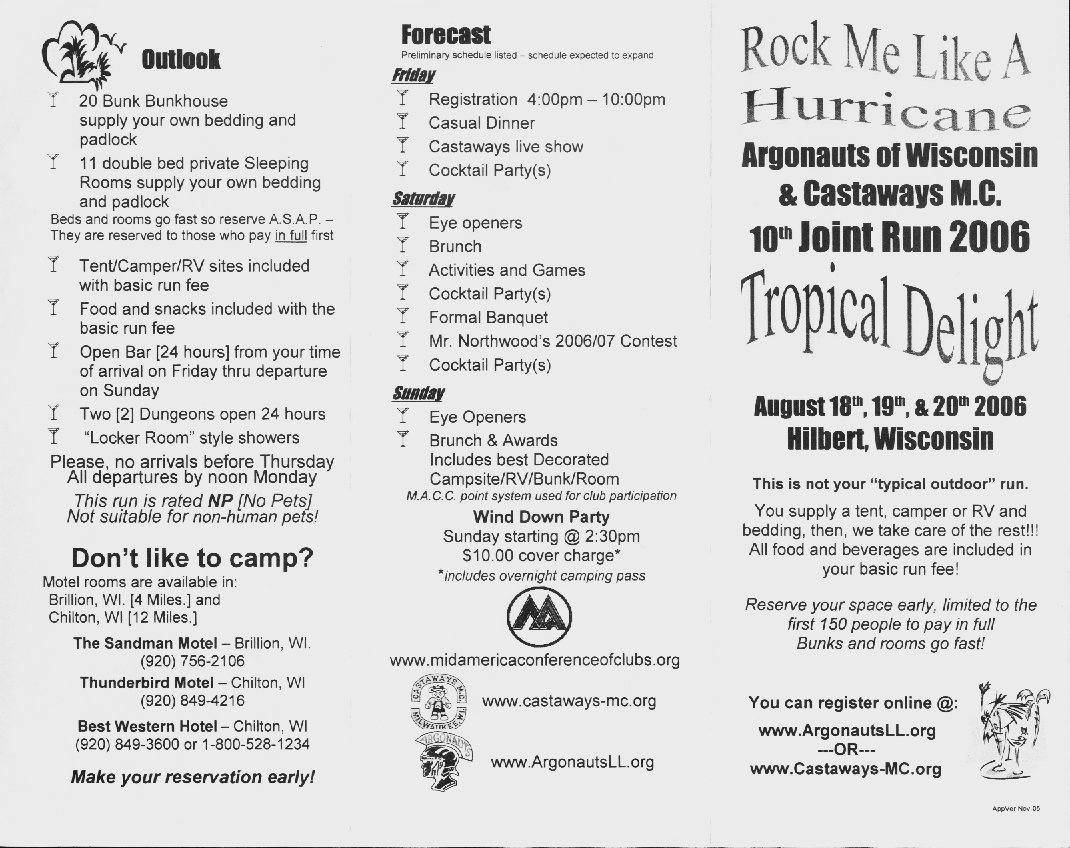 The Argonauts annual run started as Winterfest before moving to August. Some of the early outdoor runs were nicknamed Typhoon 1 and Typhoon 3 due to torrential downpours. In about 1989, the event began to include the annual contest for a title, Mr. Northwoods. The Run has been held at various locations over the years. These included: