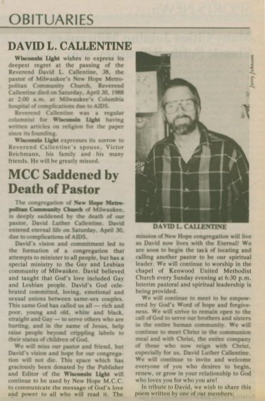 According to their website in August 2021: "Milwaukee Metropolitan Community Church has a long tradition of welcoming those who are searching for a spiritual place where they can feel welcomed and accepted. We hope when you worship with us, you will find an environment of loving hospitality and Christian love within our community of faith. As a loving, inclusive Christian community of faith, we serve the diverse religious population of the Greater Milwaukee Area and beyond." "Metropolitan Community Church is a denomination founded in the Lesbian, Gay, Bisexual, and Transgender (LGBT) community in 1968. As a member of this international denomination known globally as the Human Rights Church, we work to “Tear Down Walls” of injustice and oppression." (webmaster note: While the denomination was founded in 1968, the Milwaukee congregation was formed in 1971.) "Metropolitan Community Churches originally started to provide a place for LGBTQI+ persons to worship, who were either rejected or oppressed from their faith tradition. However, today, we are a Vibrant, Inclusive, Progressive (VIP) Community of Faith that welcomes EVERYONE, with a unique call to the LGBTQI+ community. Our worship is a blend of many traditions and styles. You will find a variety of music, scriptures, prayers and Communion (Holy Eucharist) that is offered at every worship service. You will also find that our worship is not very formal or filled with rituals, but instead offers a relaxed, opened and inviting worship environment. "We believe God made us the way we are and God loves us the way we are. We celebrate the diversity of God’s creation and work for the inclusion and acceptance of ALL God’s people in the church and community life." Milwaukee's Metropilitan Community Church (abbreviated on this site at times as 'MCC') has been known by various names over the years: The following history adapted from MCC website, as revised 7/30/2020. Copied and edited by Wis LGBT History Project webmaster August 2021. On November 30, 1971, Milwaukee Metropolitan Community Church began as Prince of Peace Metropolitan Community Church, under the leadership of Pastor Paul W. Sydman. Services were held at 2024 West Highland Avenue, in Milwaukee, Wisconsin 53233. The church's first mailing address was 1114 North 21st Street, Milwaukee, Wisconsin 53233, which was right around the corner. The church early on became a part of the Global Movement of Metropolitan Community Churches. In February 1977, Reverend Valerie Bouchard was hired as the senior pastor, and the church took the official name of Metropolitan Community Church of Milwaukee, holding services at 1107 North Jackson Street, Sundays at 2:00pm. Later in 1977 Metropolitan Community Church of Milwaukee moved its worship services to 2647 Stowell Avenue, still having worship on Sundays at 2:00 pm. Reverend Valerie remained senior pastor until 1981, when she resigned, and Reverend Steve Stahl was hired as the new senior pastor. In the summer of 1985, Metropolitan Community Church of Milwaukee began to see a decline of membership and presence. By the Fall of 1985, the church was operating on bare minimal and holding worship services when they were able to get enough people. The congregation unofficially started a reorganization, with the hopes of a bright new future. It was at this time that Reverend Steve Stahl stepped down as senior pastor, just prior to this restructuring starting. During the Fall of 1986, restructuring had been completed and the church began operating under the new name of New Hope Metropolitan Community Church, in Milwaukee, Wisconsin, and was officially chartered by the Universal Fellowship of Metropolitan Community Churches on November 30, 1986, under the new pastorate of Reverend David Callentine. Services were held Sundays at 7:00 pm at the Kenwood United Methodist Church Chapel. Concurrently, Angels of Hope Metropolitan Community Church in Green Bay, Wisconsin was also chartered by UFMCC, also under the Pastorate of Reverend David Callentine. Services there were held Sundays at 11:00 am. Reverend Callentine would hold both Sunday worships, first at Angels of Hope in Green Bay, and then drive the distance to New Hope in Milwaukee to conduct services there. But on April 30, 1988, Reverend David Callentine died at Milwaukee's Columbia Hospital with complications due to HIV/AIDS at 38 years of age. The church continued to hold worship, but changed worship time to 6:30 pm, still on Sunday evenings, with visiting clergy and laity helping to fulfill leadership while a new pastor was being sought out. The church continued to hold worship services at Kenwood United Methodist Church Chapel. In 1989 New Hope Metropolitan Community Church hired new Dual Senior Pastors: Reverend Christine Pasinki, and Reverend Nancy Smiegowski. The congregation continued to hold services on Sunday evenings at 6:30 pm at Kenwood United Methodist Church Chapel. In January of 1993, both Reverend Christine Pasinski and Reverend Nancy Smiegowski resign as co-pastors of the church. From January to April 1993, worship services continued under the Lay Leadership within the congregation while a new Senior Pastor was sought. In April 1993, Reverend Lou Broyles is hired as the new Senior Pastor. The church once again officially changes it name, but this time to Milwaukee Metropolitan Community Church. Under Reverend Lou's pastorate, services are moved to the Bach Room at the Astor Hotel in downtown Milwaukee. Services were conducted Sundays at 11:00 am. Later that year, MCC became one of the first LGBTQI+ organizations to own property in the City of Milwaukee or the entire state of Wisconsin-- when Milwaukee Metropolitan Community Church purchased its own building, at 1239 West Mineral Street. A grand dedication service was help in the early part of spring. (The only other Wisconsin LGBTQ organization known to own property at the time was the BESTD Clinic. (added by webmaster)) About the same t