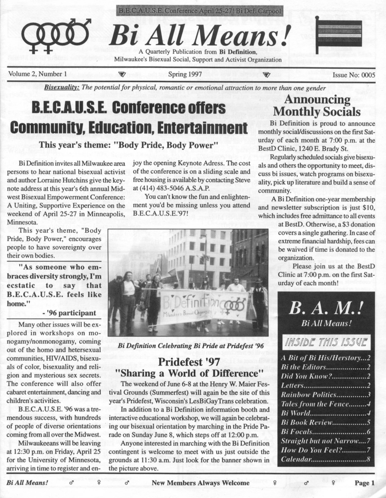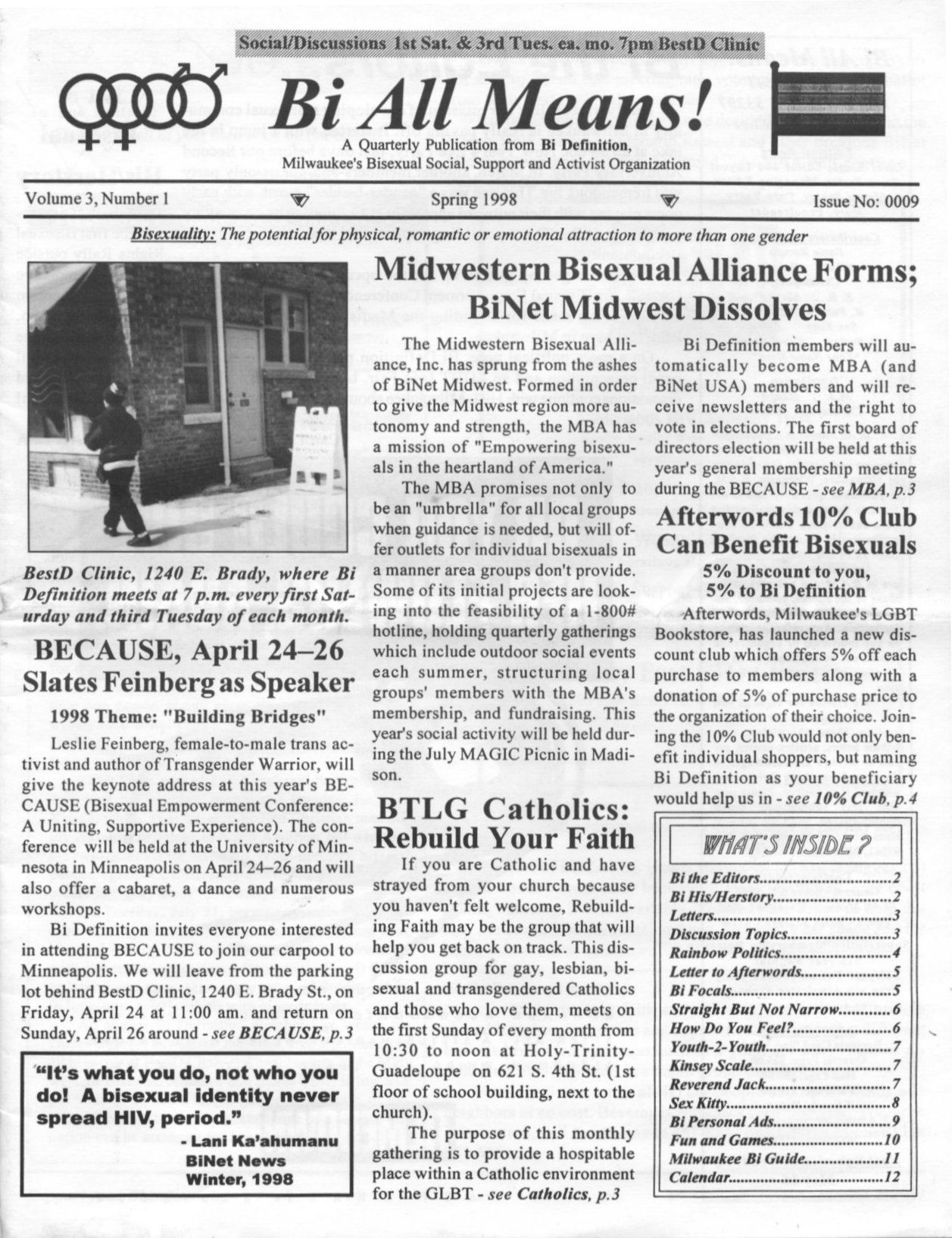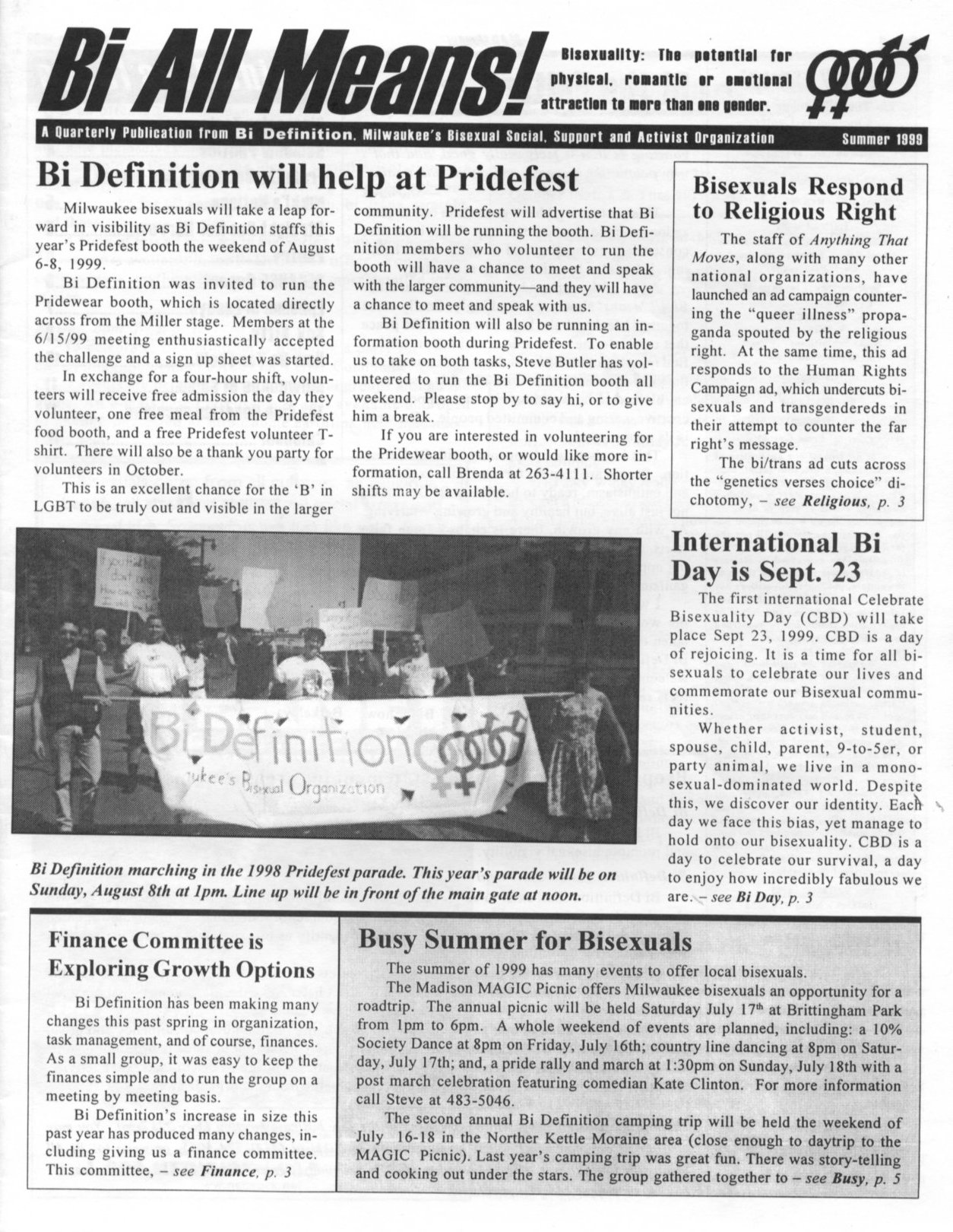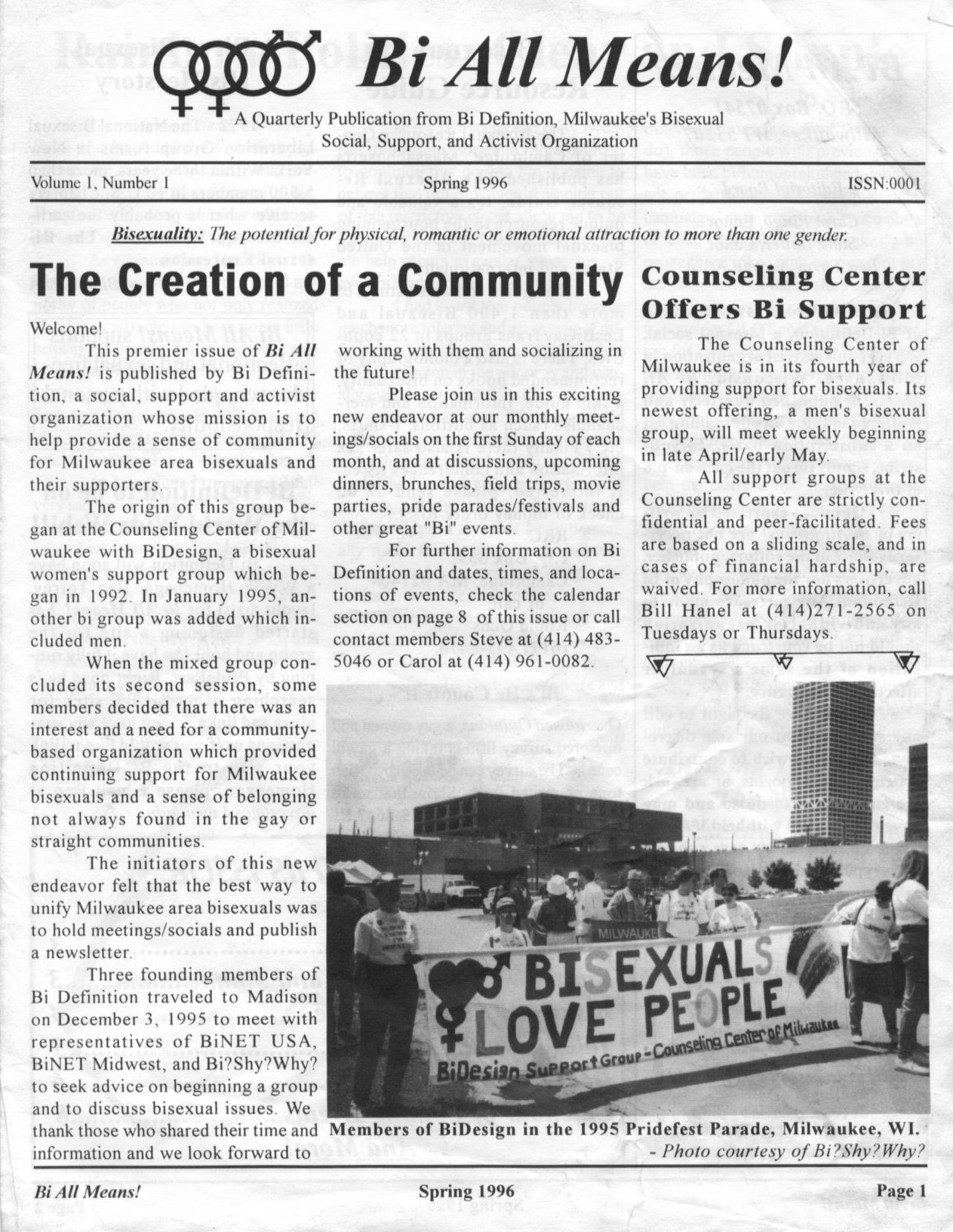 Bi Definition formed in 1995 from the merging of two other bisexual support groups that met at the Counseling Center of Milwaukee, BiDesign (a women's group) and an unnamed men's group. Bi Definition exists to provide members with a sense of belonging not always found in the gay or straight communities. Members hold social gatherings and participate in local events such as PrideFest. In response to declining attendance at business meetings and dwindling financial resources, Bi Definition voted to discontinue its print newsletter and regular meetings in 2004. The group said they would continue to meet socially and maintained a Web site, but all activity soon died out, and the web site was taken down. Around 2018, a new group started, calling itself Bi+ Pride, with a placeholder website and primarily a presence on Facebook. See that organization's page here for more information. The following purpose statement of Bi Definition is from the Group's web site. Mission Statement Vision Statement Governance Statement The UWM Archives LGBT Collection holds some of the Bi Definition's papers, including newsletters from 1996-2004. |