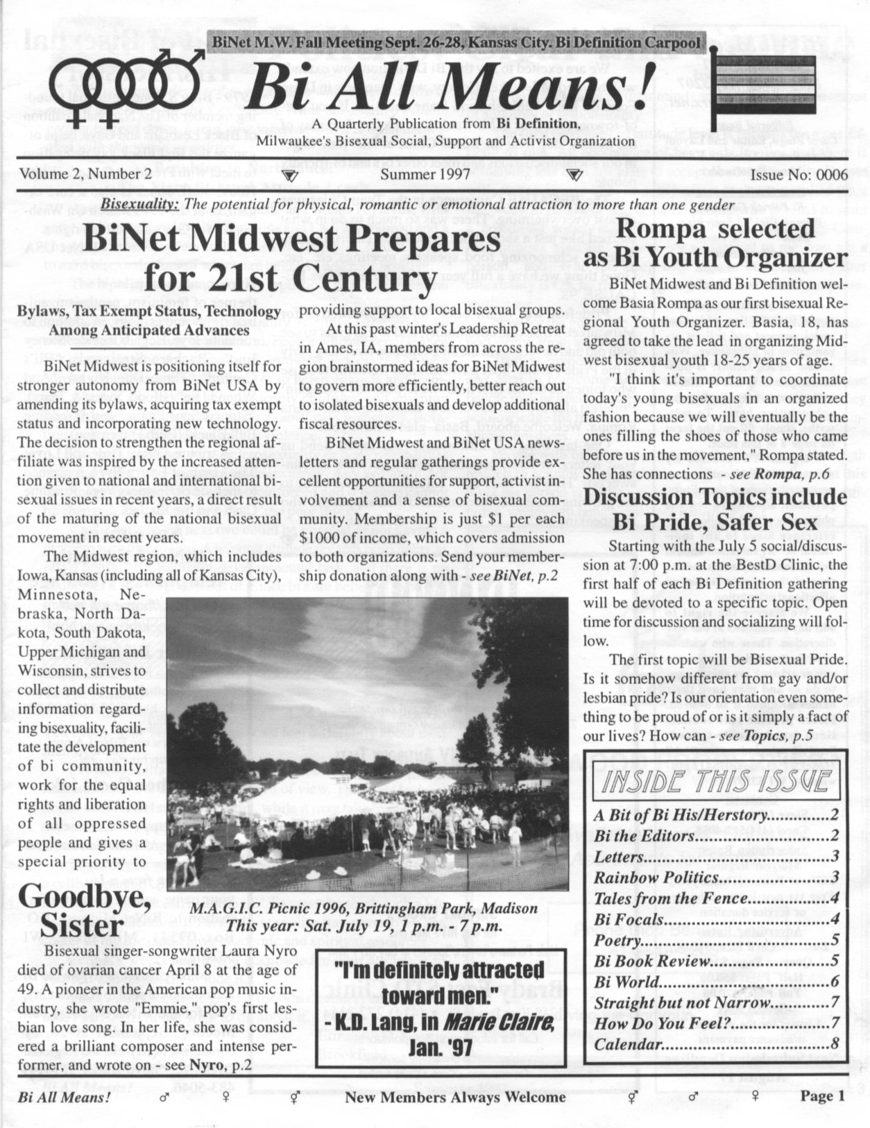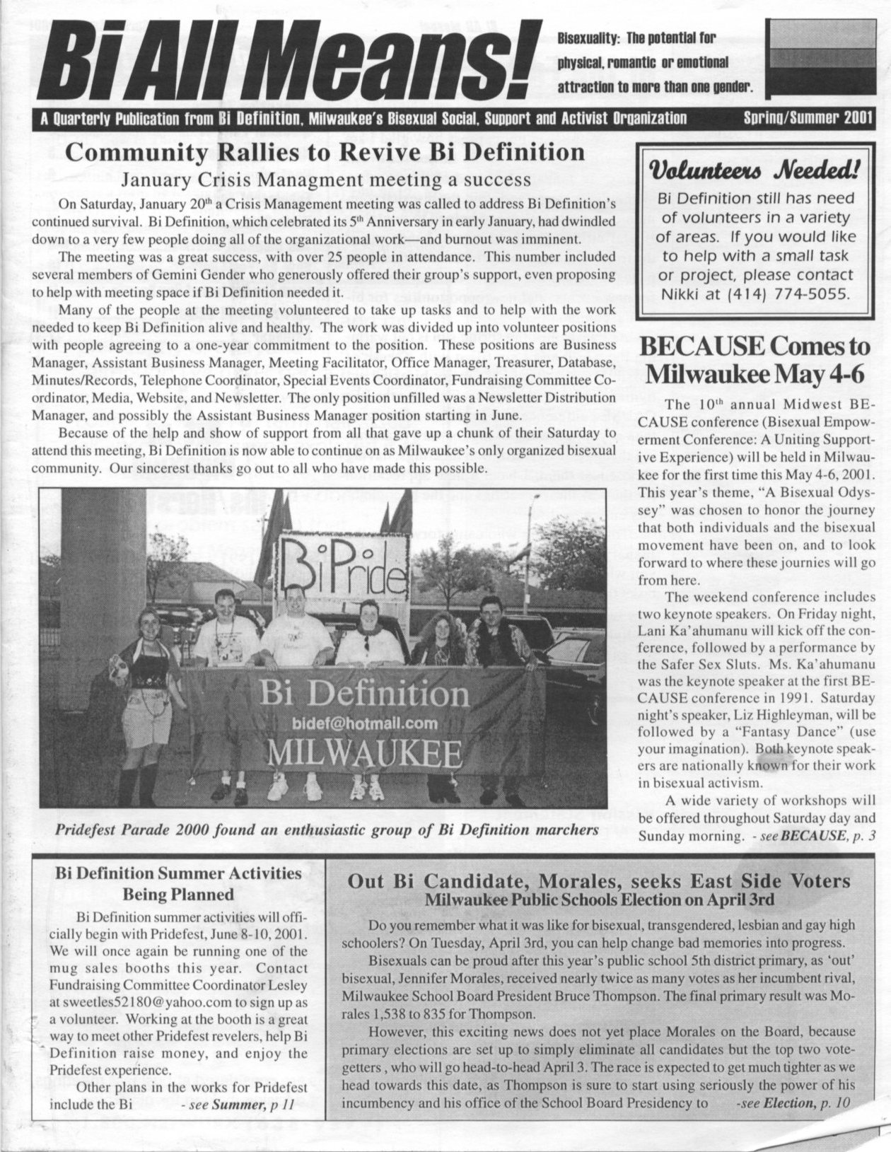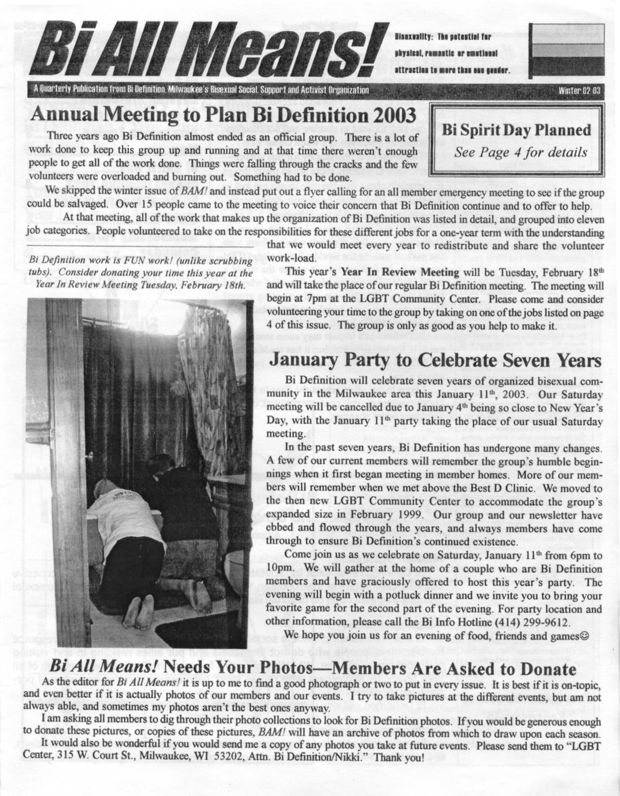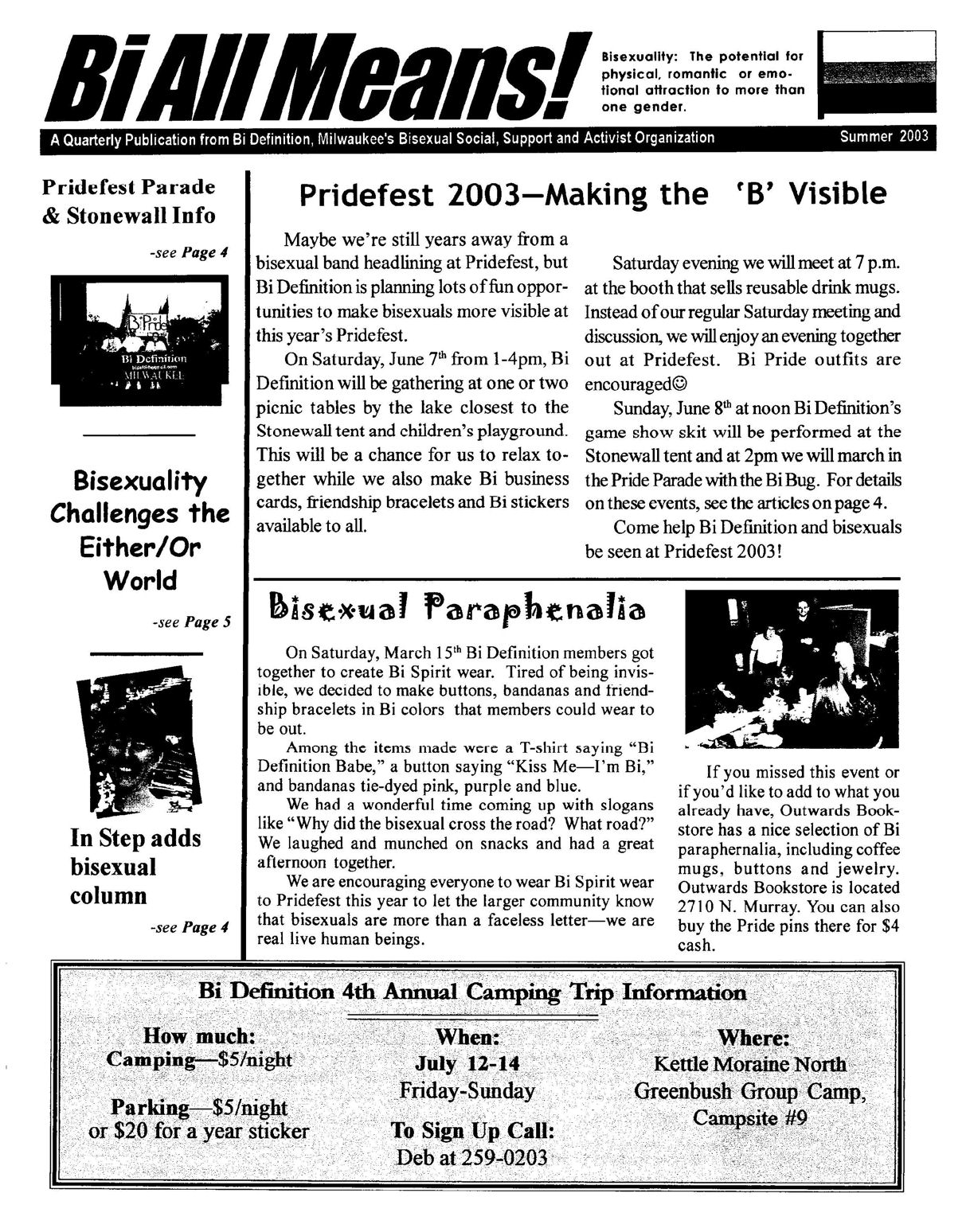Bi Definition formed in 1995 from the merging of two other bisexual support groups that met at the Counseling Center of Milwaukee, BiDesign (a women's group) and an unnamed men's group. Bi Definition exists to provide members with a sense of belonging not always found in the gay or straight communities. Members hold social gatherings and participate in local events such as PrideFest. In response to declining attendance at business meetings and dwindling financial resources, Bi Definition voted to discontinue its print newsletter and regular meetings in 2004. The group said they would continue to meet socially and maintained a Web site, but all activity soon died out, and the web site was taken down. Around 2018, a new group started, calling itself Bi+ Pride, with a placeholder website and primarily a presence on Facebook. See that organization's page here for more information. The following purpose statement of Bi Definition is from the Group's web site. Mission Statement Vision Statement Governance Statement The UWM Archives LGBT Collection holds some of the Bi Definition's papers, including newsletters from 1996-2004. |