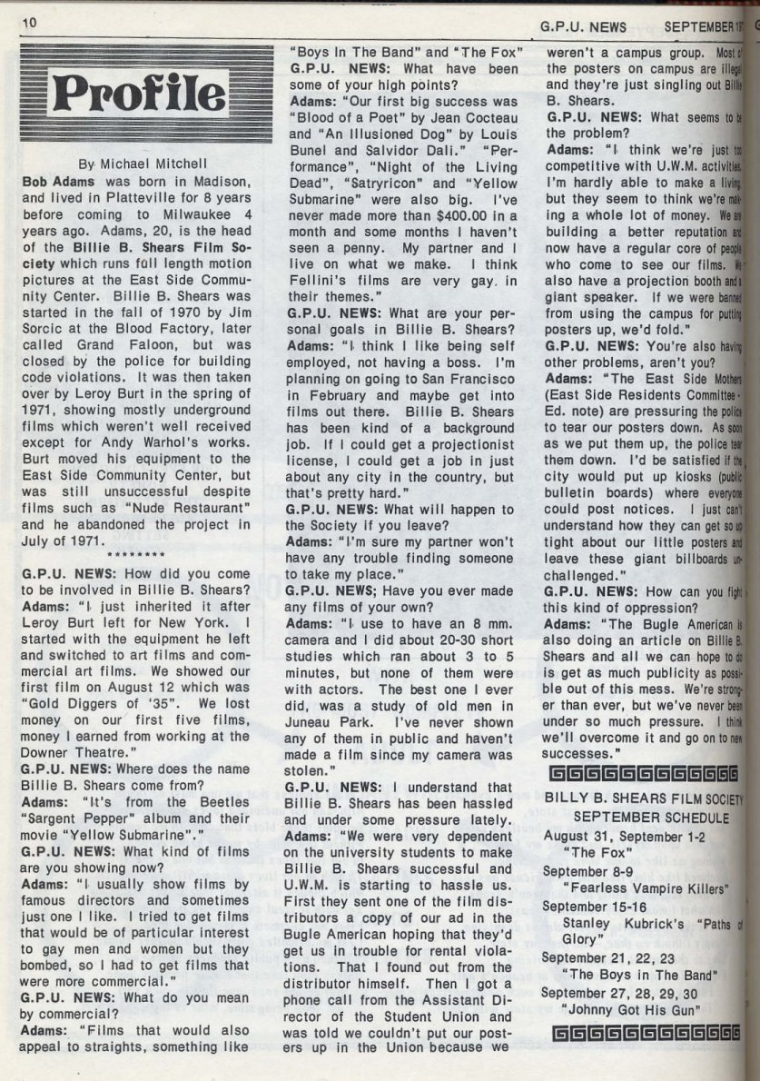 Bob Adams was born in Madison, and lived in Platteville for 8 years until moving to Milwaukee in 1968. In 1972, at the age of 20, Adams was the head of the Billie B. Shears Film Society, showing mostly underground films. He was proud of his work with underground and gay films, but planned to move to San Francisco shortly after his interview with GPU News. |