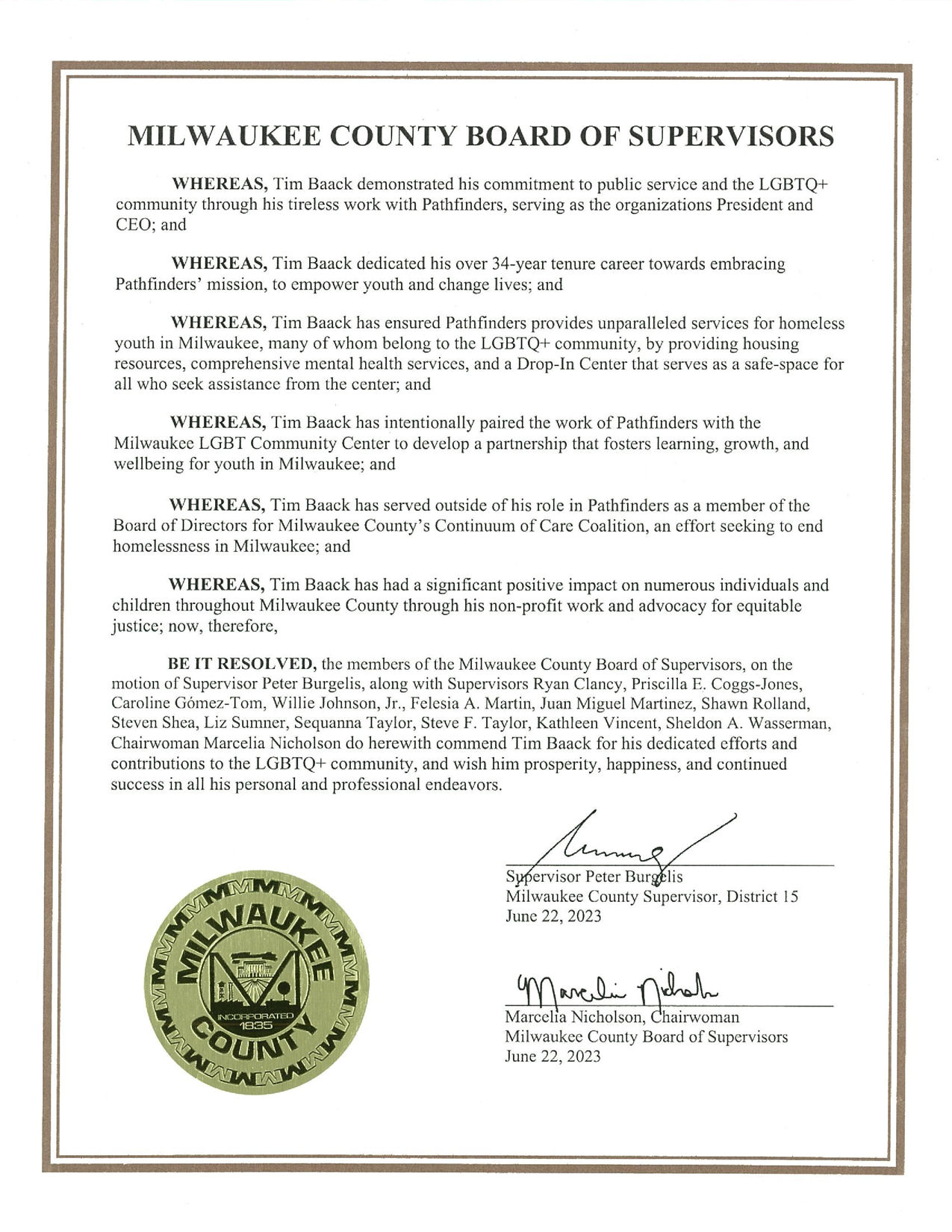 - BE IT RESOLVED, the members of the Milwaukee County Board of Supervisors, on the motion of Supervisor Peter Burgelis, along with Supervisors Ryan Clancy, Priscilla E. Coggs-Jones, Caroline Gomez-Tom, Willie Johnson, Jr., Felesia A. Martin, Juan Miguel Martinez, Shawn Rolland, Steven Shea, Liz Sumner, Sequanna Taylor, Steve F. Taylor, Kathleen Vincent, Sheldon A. Wasserman, Chairwoman Marcelia Nicholson do herewith commend Tim Baack for his dedicated efforts and contributions to the LGBTQ+ community, and wish him prosperity, happiness, and continued success in all his personal and professional endeavors.