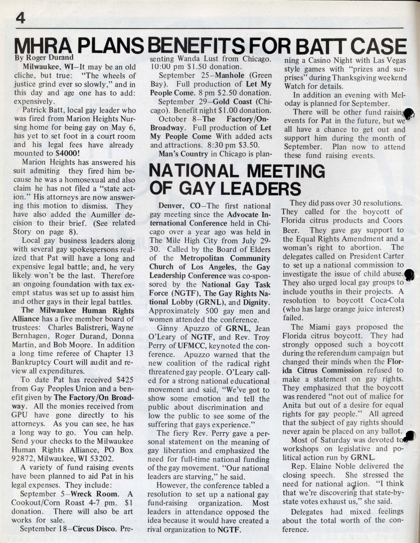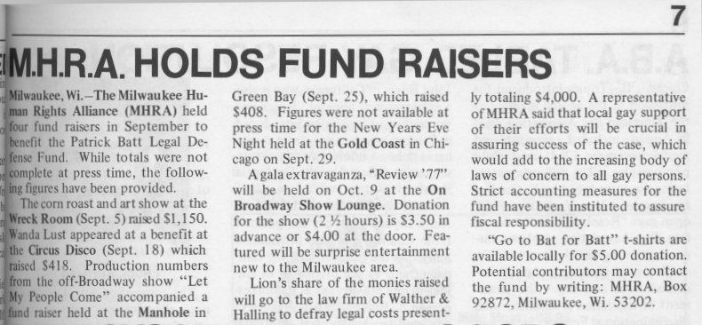 Milw. Human Rights Alliance (MHRA) formed to handle Batt discrimination case; benefits planned
