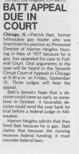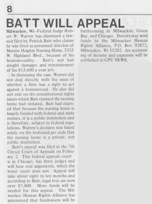 Patrick Batt, chairperson of GPU, fired on May 6, 1977 because he is gay