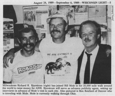 Milwaukean Richard Bjurstrom joined Bill Mole in his 25,000 mile walk around the world to raise money for AIDS. Bjorstrum served as advance publicity agent in 1990, setting up interviews in advance of Mole's visit to each city.