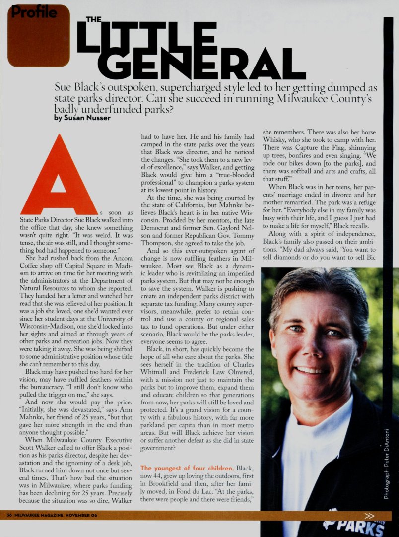 Sue Black gained the spotlight as an open lesbian figure with her appointment first as State Parks Director, and then as Director of the Milwaukee County Park System.