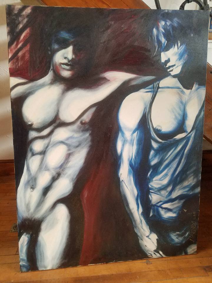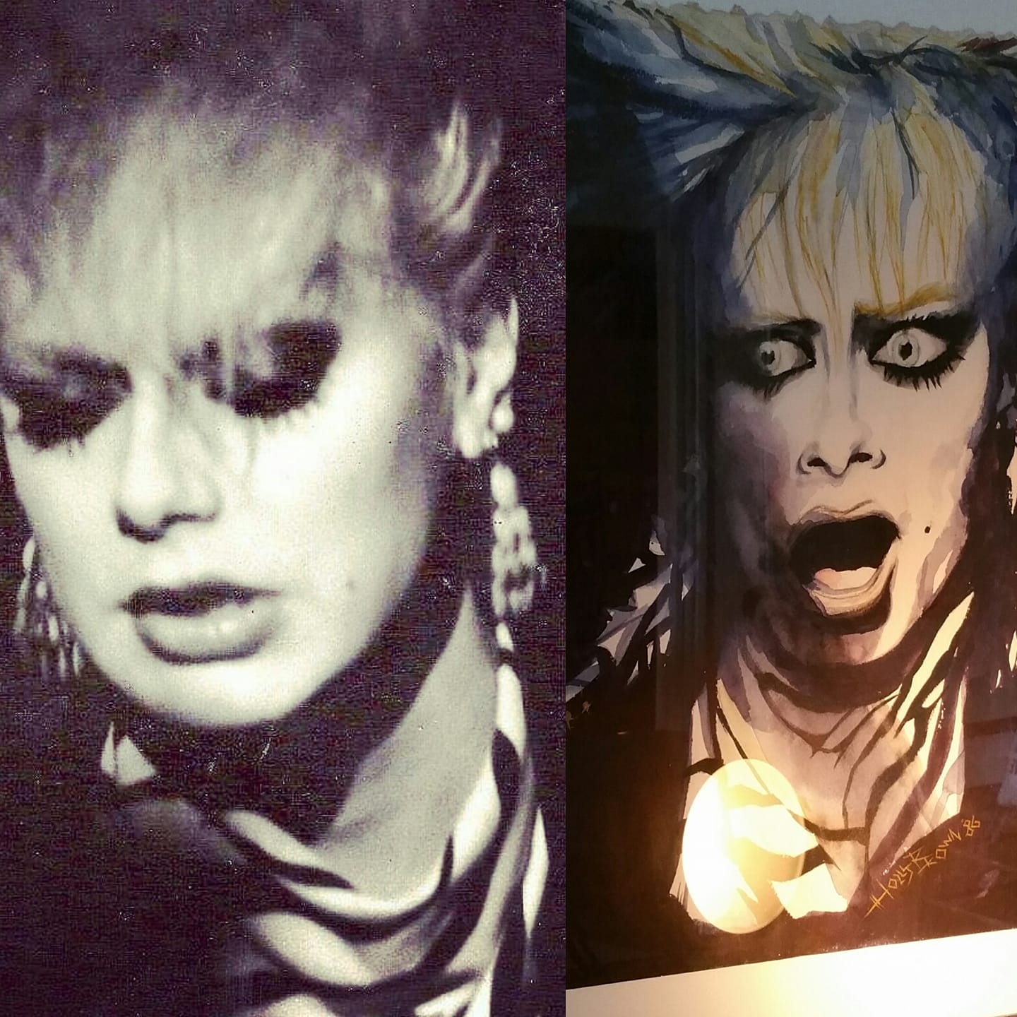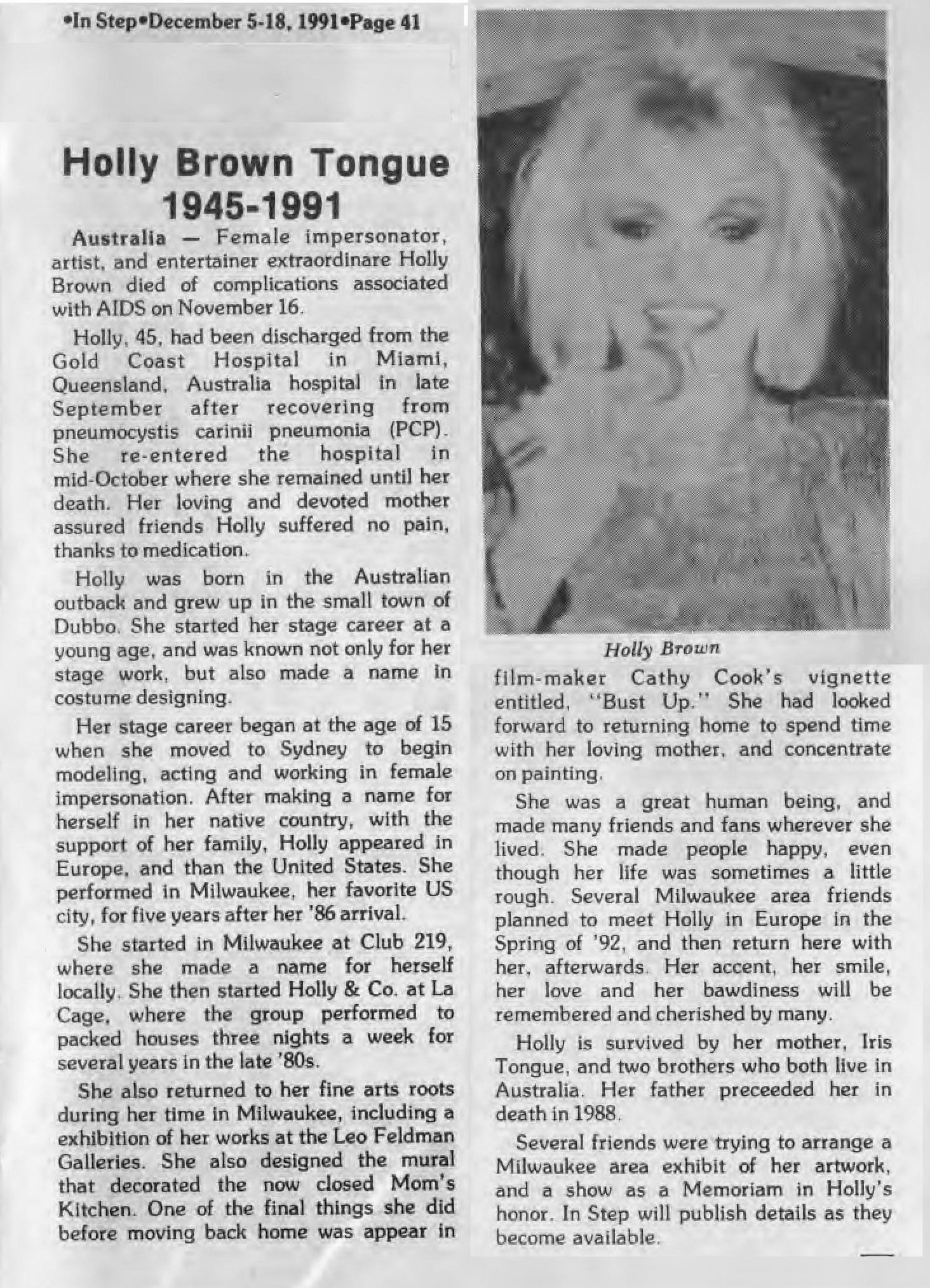 Holly Brown Tongue was known as Holly Brown in Milwaukee. The singer, comedienne, and dancer Holly Brown started out performing at Club 219, then headed up "Holly and Company", a troupe whose shows at La Cage in the 1980's gained for them an enthusiastic following among both the Gay/Lesbian and straight communities. See the Obituary below for more about her early life, career, and time in Milwaukee. Holly Brown bid an emotional farewell to Milwaukee in April, 1990 with a gala performance at La Cage as she prepared to leave for her native Australia. In several moving performances, Brown thanked the people she has known, "the ones who made all this possible". Holly and Company put on a show to their usual high standards, with Brown appearing as Bette Davis and Shirley MacLaine, among others. Also well received was Goldie Adams; Adams lip-synched to "Changes" while she removed her make-up and costume to metamorphize into a male softball player. The distress on Adams' face at this, the final curtain, was evident. Holly Brown died of complications of AIDS on November 16, 1991 in a Queensland, Australia hospital. Her obituary appeared in the 'In Step' issue of December 5-18, 1991, and read as follows: Australia - Female impersonator, artist, and entertainer extraordinare Holly Brown died of complications asscoiated with AIDS on November 16. Holly, 45, had been discharged from the Gold Coast Hospital in Miami, Queensland, Australia hospital ln late September after recovering from pneumocystis carinii pneumonia (PCP). She re-entered the hospital in mid-October where she remained until her death. Her loving and devoted mother assured friends Holly Suffered no pain, thanks to medication. Holly was born in the Australlan outback and grew up in the small town of Dubbo. She started her stage career at a young age, and was known not only for her stage work, but also made a name in costume designing. Her stage career began at the age of 15 when she moved to Sydney to begin modeling, acting and working in female impersonation. After making a name for herself in her native country, with the support of her family, Holly appeared ln Europe, and than the United States. She performed in Milwaukee, her favorite US city, for five years after her '86 arrival. She started ln Milwaukee at Club 219, where she made a name for herself locally. She then started Holly & Co. at La Cage, where the group performed to packed houses thiee nights a week for several years in the late '80s. She also returned to her fine arts roots during her time in Milwaukee, including a exhlbltion of her works at the Leo Feldman Galleries. She also designed the mural that decorated the now closed Mom's Kitchen. One of the final things she did before moving back home was appear ln film-maker Cathy Cook's vignette entitled, "Bust Up." She had looked forward to returning home to spend time with her loving mother, and concentrate on painting. She was a great human being, and made many friends and fans wherever she lived. She made people happy, even though her life was sometimes a little rough. Several Milwaukee area friends planned to meet Holly in Europe in the Spring of '92, and then return here with her, afterwards. Her accent, her smile, her love and her bawdiness will be remembered and cherished by many. Holly is survived by her mother, Iris Tongue, and two brothers who both live in Australia. Her father preceeded her in death in 1988. Several friends were trying to arrange a Milwaukee area exhibit of her artwork, and a show as a Memoriam in Holly's honor. In Step will publish details as they become available. Her death was also recognized in the magazine's 'Steppin Out' column on page 55, reading: I'm sure most of you have heard by now that both Holly Brown and Ginger Spice passed away recently. You can read their Memorials elsewhere in this issue. It's always sad when members of the community succumb to AIDS — but it impacts even more when they were vivacious entertainers who brought smiles to our faces everytime they performed. I'm sure they would want us to remember them with smiles on our faces and in our hearts, so here's a thought... I bet Holly and Ginger are up in heaven right now planning a Holiday Reunion Show the likes of which their fellow angels have never seen! Let's remember them in that way! Four of Holly Brown's paintings are shown below, shared by contribitors to the Facebook page, The History of Gay Wisconsin. One is a side-by-side of a photo of B.J. Daniels from the '80s and the painting that Holly Brown did of her as a gift for her (BJ's) 26th birthday in 1986. According to BJ Daniels, "It reminds me of all the fabulous friends and memories I am privileged to have. I still miss her laugh, her Aussie accent, and our girls nights in, watching classic films. She will always live on in my heart and those of many others..." Two other paintings were shared by Ricky N. and another by Jamie Taylor, all via the Facebook group.