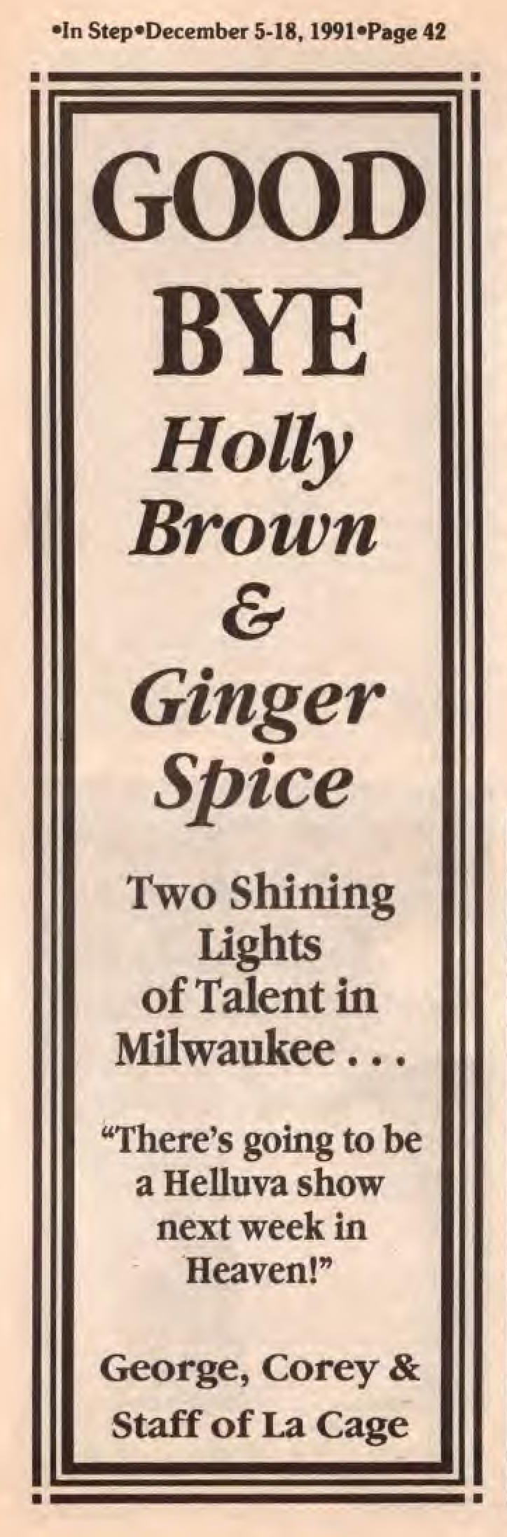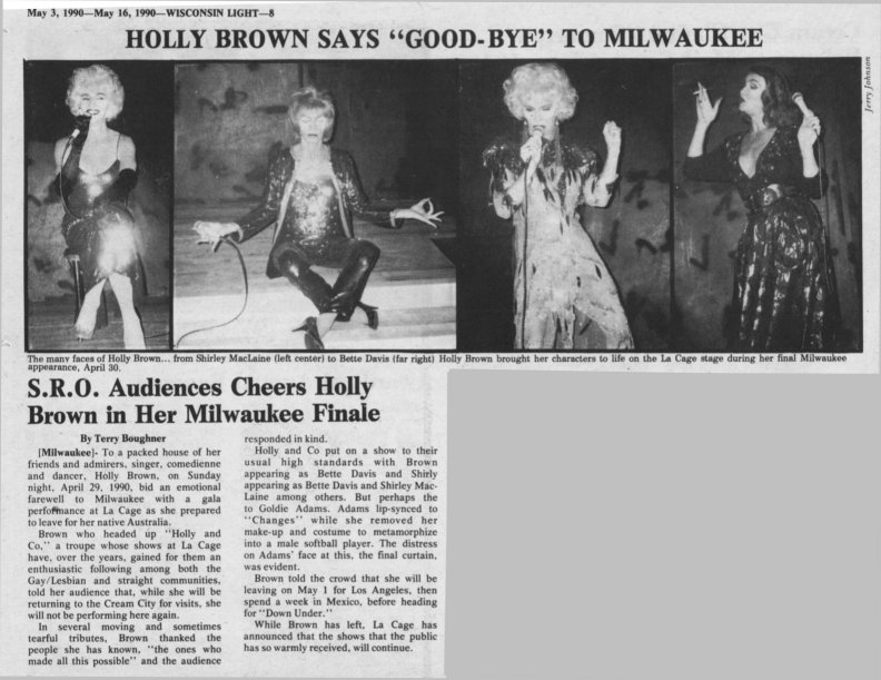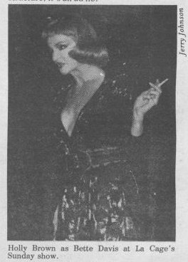 Recollections: The following are recollections of others who have been kind enough to submit their personal memories to the webmaster. You are welcome to do the same! For Halloween 1989, I built Holly a Victorian style coffin so she could "lie in state" as Bette Davis for the La Cage "Holly Brown & Co." Halloween show (Bette had died a couple of weeks prior.) She was amazing: she laid in repose through the entire show, and just as they were playing the show's closing overture (remember, the opening and closing overture for her show?) she sat up in the coffin and shouted "Wait a minute (a-la Davis)" and then climbed out of the coffin and did a parody version of Madonna's "Like a Virgin" ("Dead for the very first time, you know" she sang.) I am so glad I have those memories and thanks for stirring them for me... Holly was brought to Milwaukee by Ginger Spice, who met her in Chicago. She lived with Ginger(Richard Wyatt RIP) in Libertyville for quite a while before they both moved to Milwaukee. She was part of the 219 shows for a long time, before going to LaCage down the street to do her own thing. We toured together with the 3 of us for a summer in the mid-'80s. She was an accomplished painter as well as a performer who adored classic films.