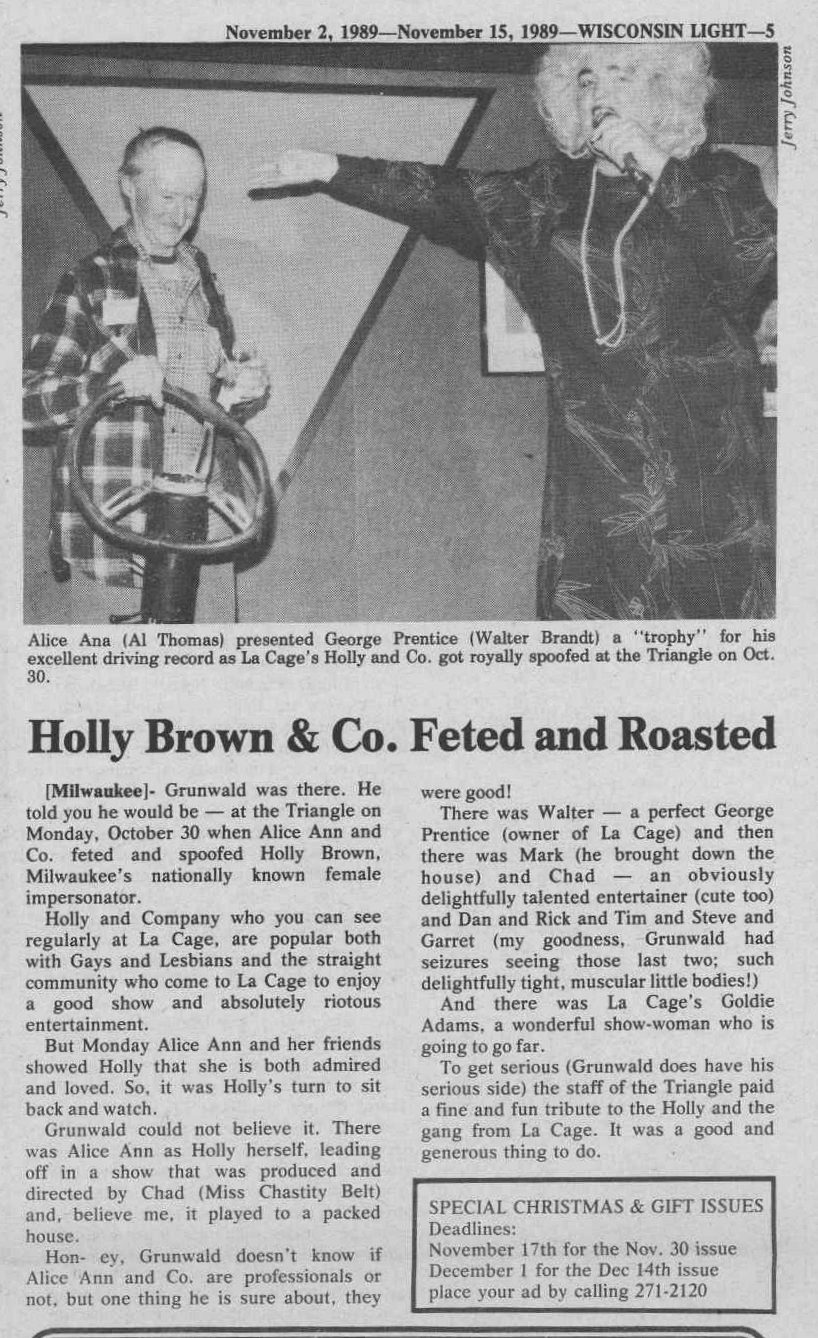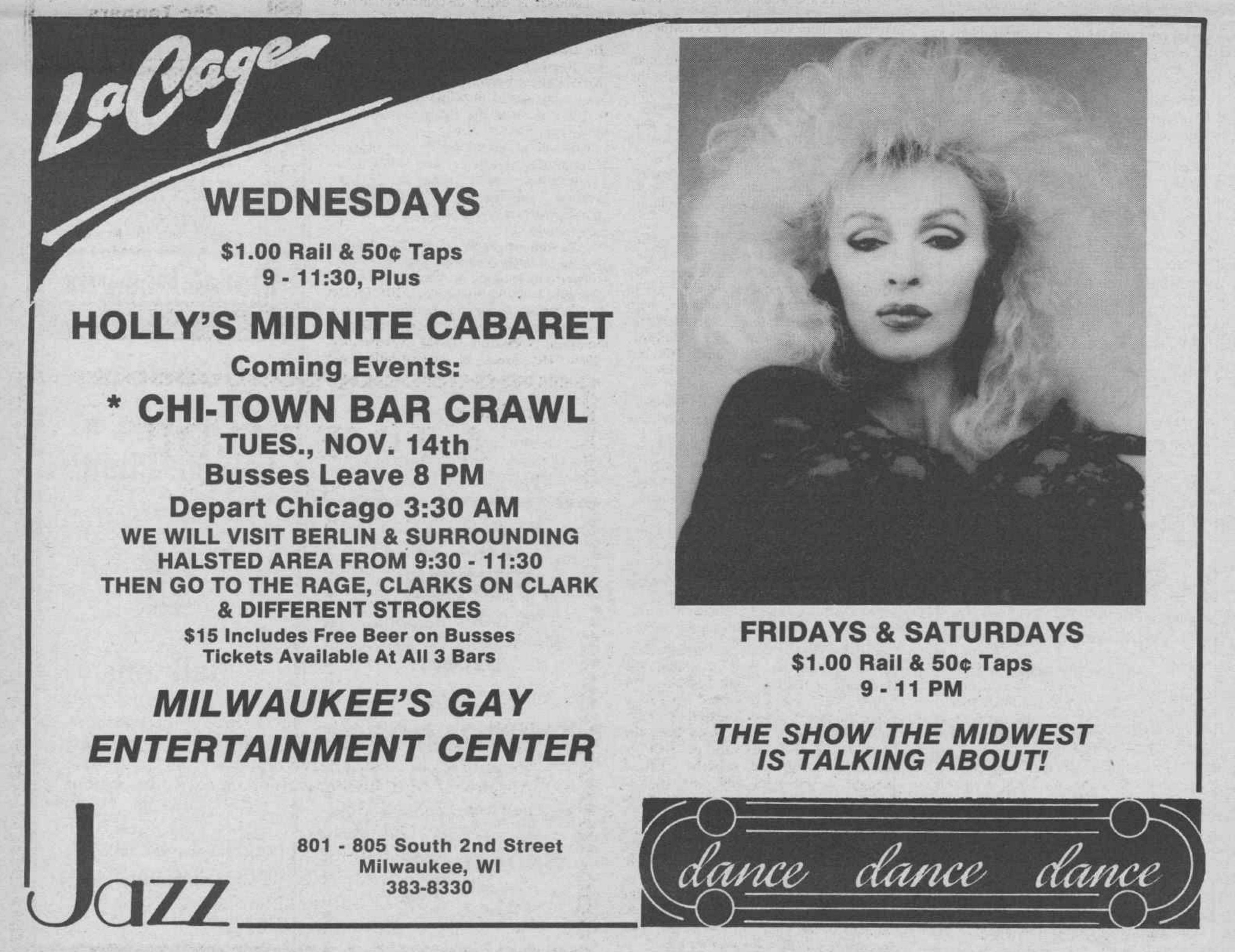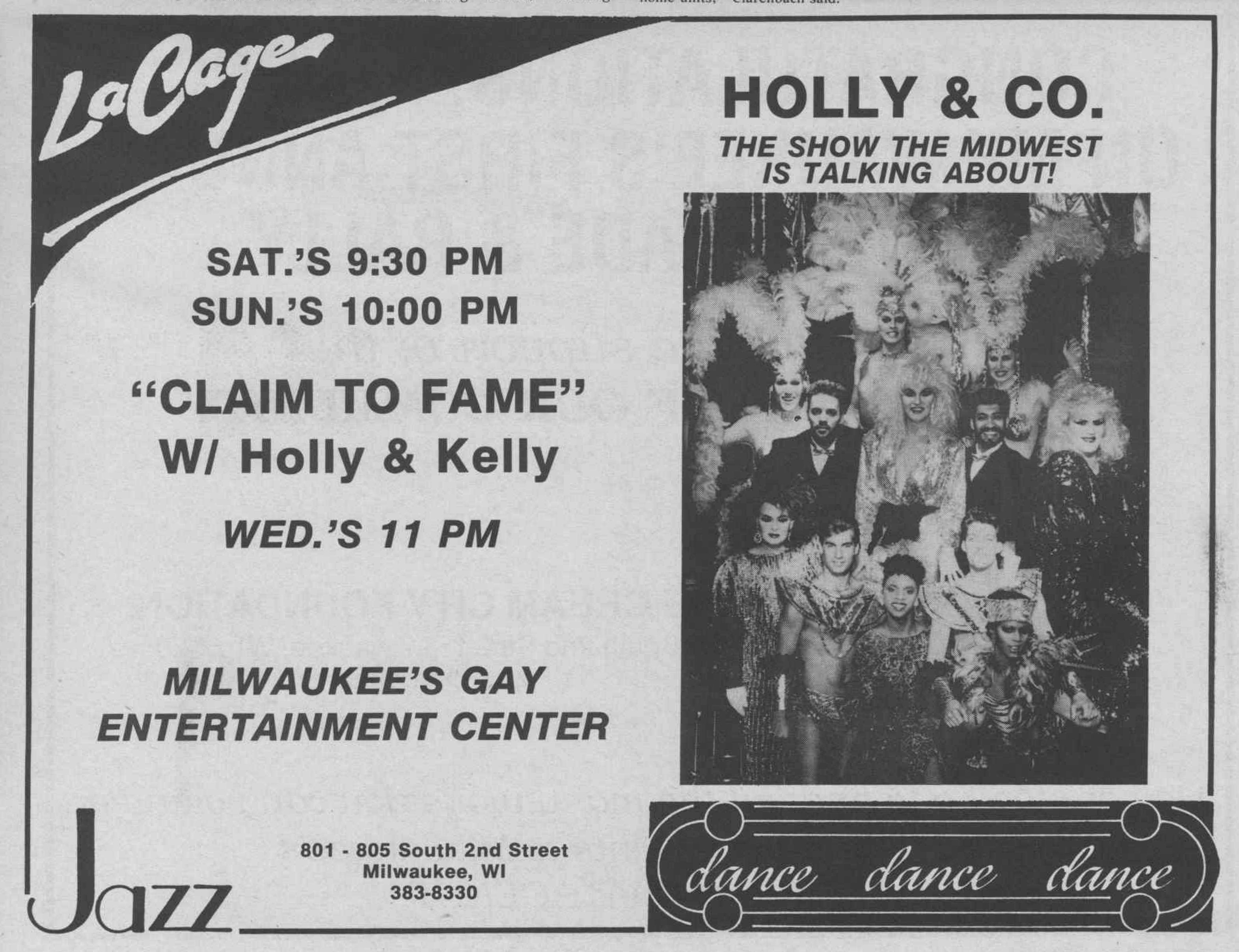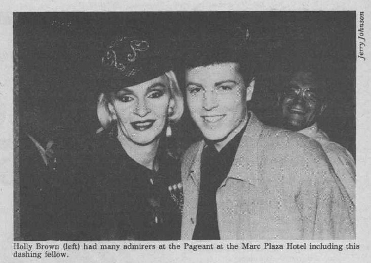 Going to the Sunday night Holly Brown Revue was my first exposure to gay nightlife/culture when I was young and just coming out. So many great memories 🙂. Can anyone confirm a few things that I heard back then? — that (a) she was once a Rockette, (b) during that time she spent an evening with Lily Tomlin & they slept together, and (c) that she wrote an autobiography called “Oh Boy!” and a sequel called “Oh Man!” Thanks! (And thank you, Holly 💜) Truly had the time of my life with Holly and the show. Blessed to have been a part of it. Holly was amazing inside and out. Miss her. She was so much fun. I spent a very memorable afternoon with Holly and our mutual friend, Andy. I never laughed to hard in my life! Who remembers when they had a water feature on stage at Club 219? (Photo below is of) me, Holly Brown, Erica Stevens, and Ginger Spice in the mid-1980s. I cannot tell you how much I miss all of these people. Trailblazers all of them. Erica was the first person of color to be Miss Gay Wisconsin, Ginger was Miss Gay WI too, and so was I. Holly was an artist, literally whose paintings graced restaurants and my own wall at home today. It was the best of times, it was the worst of times... |