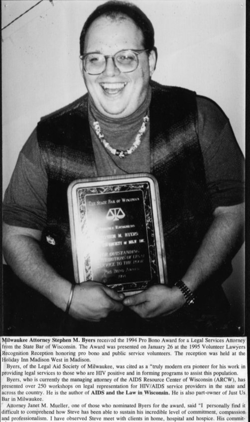 Stephen Byers, managing attorney of the AIDS Resource Center of Wisconsin (ARCW), as of 1995 had already presented over 250 workshops on legal representation for AIDS/HIV providers in the state and across the country. He is the author of the book, "AIDS and the Law in Wisconsin". He was also part owner of the Just Us bar in Milwaukee.