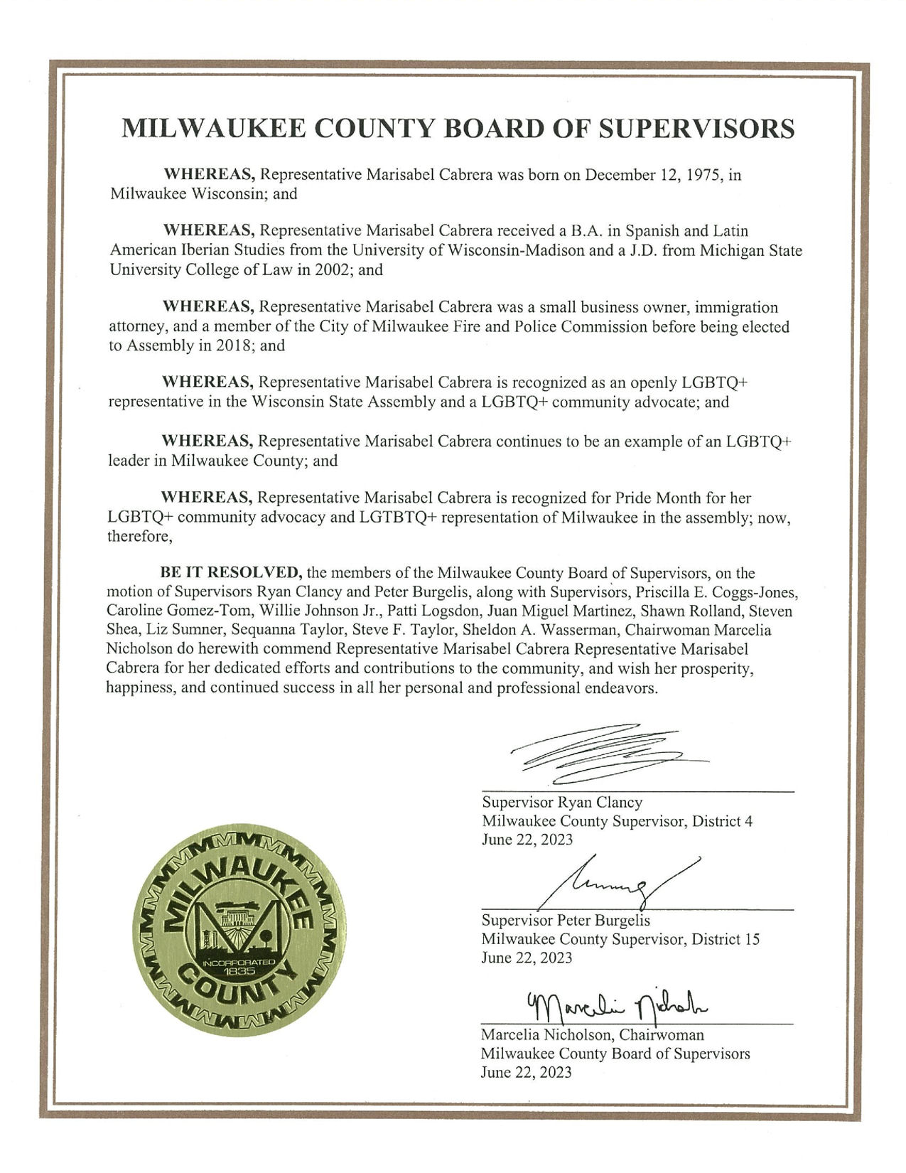 Marisabel Cabrera is a lawyer and Democratic politician from Milwaukee, Wisconsin. She is a member of the Wisconsin State Assembly, representing Wisconsin's 9th Assembly district since 2019. Cabrera was recognized by the Milwaukee County Board of Supervisors in June 2023. By the initiative of Chairwoman Marcelia Nicholson and Supervisor Peter Burgelis, some forty individuals and organizations were recognized by the Milwaukee County Board of Supervisors and presented citations in a special meeting on June 22, 2023. "Today, we recommit Milwaukee County to supporting and uplifting the LGBTQ+ community, celebrating those who make a substantial positive impact on the LGBTQ+ community in Milwaukee County," Supervisor Burgelis stated. "Today we are making up for lost time. We have dozens of people to recognize, not because so much has been done in the past year, but because decades and even years ago, there was little to no recognition of the LGBTQ+ community. I am thankful to work with a Chairperson who enables our County Board to honor these well-deserving individuals." Recognitions were made in the categories of "Community Leaders and Activists," "Government Leaders," "Business and Cultural Leaders," and "Health and Wellness Leaders". Cabrera's citation (in which they are largely self-described) read as follows: