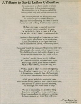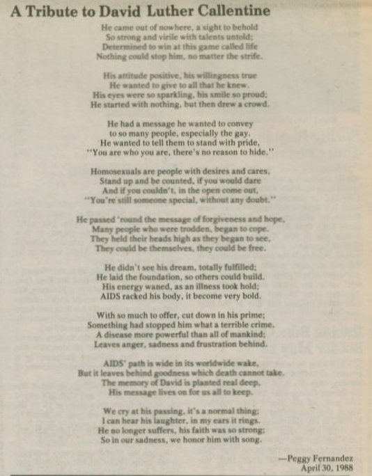 Reverend David Luther Callentine was the Pastor of New Hope Metropolitan Community Church of Milwaukee when he died at the age of 38. He passed away on Saturday, April 30, 1988 at Milwaukee's Columbia Hospital of complications due to AIDS. According to a statement by the MCC at the time of his death: "David's vision and commitment lead to the formation of a congregation that attempts to minister to all people, but has a special ministry to the Gay and Lesbian community of Milwaukee. David believed and taught that God's love included Gay and Lesbian people. David's God celebrated committed, loving, emotional and sexual unions between same-sex couples. This same God has called us all-- rich and poor, young and old, white and black, straight and Gay-- to serve others who are hurting, and in the name of Jesus, help raise people beyond crippling labels to their status of children of God." David was a regular columnist for Wisconsin Light newspaper, having written articles on religion for the paper since its founding. David left behind his spouse, Victor Reichmann, family and many friends. |