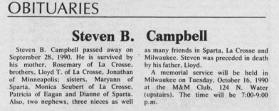 Steven B. Campbell passed away on September 28, 1990. He was survived by his mother, brothers, sisters, nephews, nieces and many friends in Sparta, La Crosse and Milwaukee. A memorial service was held for him on Tuesday, October 16, 1990 at the M&M Club in Milwaukee.