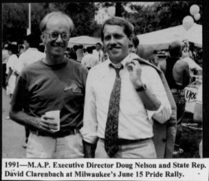 In 1982, then Wisconsin State Rep. David Clarenbach along with Milwaukee gay activist Leon Rouse and others were widely credited with helping push through the first law in the country which prohibited discrimination in employment, housing and public accommodations on the basis of sexual orientation. It was a landmark achievement for Wisconsin and the nation. Clarenbach and Rouse were regarded as the two most important figures in that historic drive for equal rights in Wisconsin. David E. Clarenbach was born September 26, 1953 in St. Louis, Missouri, the son of National Organization for Women co-founder Kathryn F. Clarenbach. He was educated in Madison public schools, and studied politics at the University of Wisconsin–Madison from 1971 to 1976. He was elected to the Dane County Board of Supervisors in 1972, at age 18. In 1974, he was elected a Madison alderman, before being elected to the Wisconsin State Assembly that same year at the age of 21. In 1981, David worked with Leon Rouse and others to have Wisconsin's Gay Rights bill, known as AB70 (Assembly Bill 70), passed by first the State Assembly, and then the State Senate. Despite a last ditch effort to have the bill vetoed, it was signed into law by Governor Lee Dreyfus in February 1982. Thus Wisconsin became the first state in the nation to make discrimination by sexual preference law. This is the single achievement that makes David's name well known throughout within the state's LGBT population. Clarenbach eventually served nine terms in the Wisconsin State Assembly. He represented the 78th Assembly District in Madison from 1975 to 1993 as a Democrat. In 1983 he was elected Speaker pro tempore of the Assembly. His legislative papers are on deposit with the Wisconsin Historical Society. Clarenbach did not seek re-election in 1992 but ran for Congress in Wisconsin's 2nd congressional district. In the Democratic primary election held on September 8, Clarenbach faced Ada E. Deer and lost with 31,961 votes (40.1%) to Deer's 47,777 (59.9%). Deer went on to lose to incumbent Republican Scott L. Klug in the general election. He was succeeded in the assembly by Tammy Baldwin, who ran as the first openly gay legislative candidate in Wisconsin history. After three terms, Baldwin vacated the seat to mount a successful bid for Congress in 1998 and was succeeded by Mark Pocan who, like Clarenbach and Baldwin, is gay and is a former member of the Dane County Board of Supervisors. Pocan remains in that position through 2010. Clarenbach is now openly gay, although he was not open during his political career in Madison. He told a reporter in 2001, "It was a different era. There were no openly gay elected officials... Even in the liberal stronghold of Madison, it would have done more than raise eyebrows. It would’ve hampered a person’s electability. Yet I think it’s safe to say that every member of the Legislature and every member of the Capitol press corps knew I was gay.... The general consensus was not to intrude into one’s personal life." He served as a mentor for fellow gay Assemblyman Tim Carpenter of Milwaukee. Clarenbach served as executive director of the Gay and Lesbian Victory Fund from 1996 to 1997. He now works as a political consultant and lives in Madison, Wisconsin.
