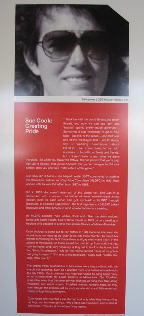 Sue Cook did it twice - she helped create LGBT community in Milwaukee by starting the Milwaukee Lesbian and Gay Pride Committee (MLGPC) in 1987, then worked with the new PrideFest from 1997 to 1999.
