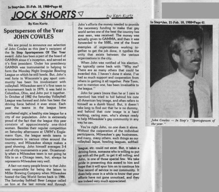 John M. Cowles was an active and vibrant member of the LGBT community. John was happy and proud to be gay, and was proactive in LGBT issues. He was a founder and first president of GAMMA, a board member of the Cream City Foundation (CCF), and was active in AIDS awareness and prevention programs as early as 1982. John was extremely active in every type of sport. He was active in the GAMMA Rays volleyball league, but also played softball, football, bowling, and anything else that came his way. In February 1988 InStep named John "Sportsman of the Year". In Step listed others of John's contributions; (paraphrased:) "Under his presidency GAMMA was instrumental in helping to form the Monday Night Irregular Bowling League... But, John's real forte has been his involvement with volleyball. Milwaukee sent its first team to a tournament back in 1979, in Columbus Ohio, and John put it together. In October 1982 the Saturday Volleyball League was formed and John was the driving force behind it." John was one of the most charismatic and friendly of people, and he put that talent to good use in championing gay causes, encouraging involvement and volunteering in gay groups and causes by other individuals. He was also the ideal sportsman and athlete, competitive but enjoying himself whether he won or lost a game. John was one of those rare people who seldom displayed anything but a wide smile and a friendly greeting. John's professional passions were scientific research and the teaching of science. He attended Marquette University and received a Ph.D. in Organic Chemitsry in 1983. John first worked as an organic chemist at the University of California, San Francisco. At his untimely death he was a Senior Research Chemist at Miller Brewing Company in Milwaukee, where he had obtained two US patents for hops chemistry. John was responsible for being the laison to the Miller Brewing Company when Milwaukee hosted the Gay World Series in 1986. The Saturday Softball Beer League called on him at the last minute and through John's efforts, Miller made a major contribution, channeled through GAMMA which passed the funds on to the SSBL. As a board member of the Cream City Foundation (CCF), John was one of the key individuals behind the establishment of the Foundation Community Center, and served on its steering committee as well. John died of complications of AIDS on January 12, 1990 at the age of 36, leaving a generous gift to the CCF's Endowment Fund. In remembrance of John's involvement in the community and his devotion to science, the John M. Cowles Memorial Scholarship was initiated in the fall of 1990. The John M. Cowles Scholarship Fund is a special fund established within Cream City Foundation. Scholarships assist deserving LGBT students in Southeastern Wisconsin at the undergraduate level to develop careers in natural sciences; a fitting legacy to John's continued memory. |