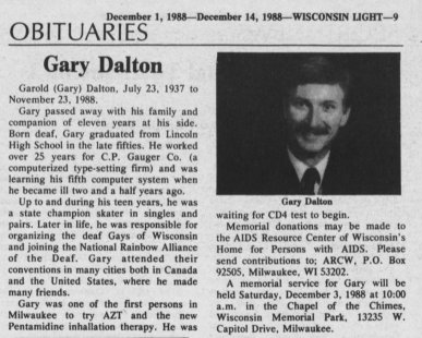 Born deaf, Garold Dalton, known as Gary, graduated from Lincoln High School in the late fifties. Up to and during his teen years, Gary, was a state champion skater in singles and pairs. Later in life, he was responsible for organizing the Deaf Gays of Wisconsin and joining the National Rainbow Alliance of the Deaf. Gary attended their conventions in many cities both in Canada and the United States, where he made many friends.