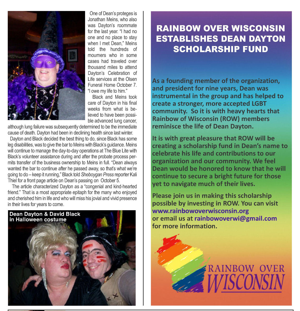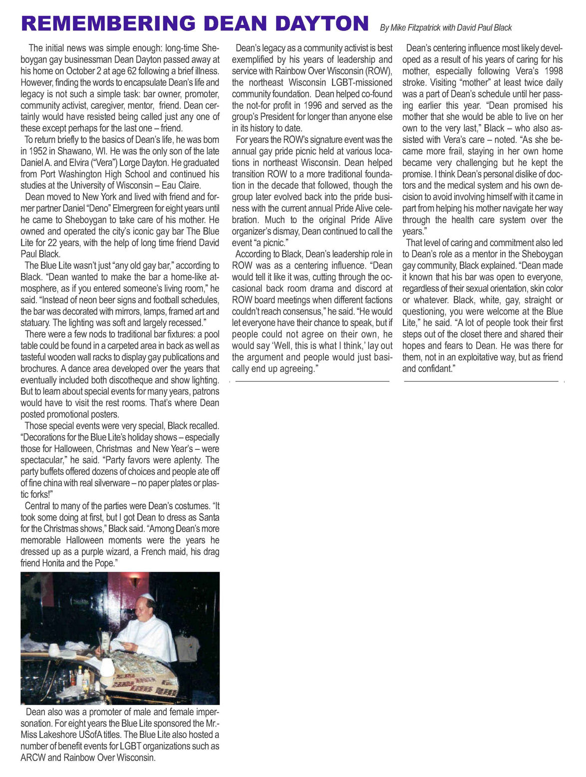 Dean Dayton was best known to many as owner and operator of the Blue Lite gay bar in downtown Sheboygan. To others he was best known for his work with Rainbow Over Wisconsin (ROW), the LGBTQ activist organization in northeast Wisconsin. His life was well summarized in the article "Remembering Dean Dayton" written by Mike Fitzpatrick and David Paul Black, and published in Quest magazine (Quest vol. 221-11, Nov. 2014) after his death: The initial news was simple enough: long-time Sheboygan gay businessman Dean Dayton passed away at his home on October 2 at age 62 following a brief illness. However, finding the words to encapsulate Dean's life and legacy is not such a simple task: bar owner, promoter, community activist, caregiver, mentor, friend. Dean certainly would have resisted being called just any one of these except perhaps for the last one — friend. To return briefly to the basics of Dean's life, he was born in 1952 in Shawano, WI. He was the only son of the late Daniel A. and Elvira ("Vera") Lorge Dayton. He graduated from Port Washington High School and continued his studies at the University of Wisconsin — Eau Claire. Dean moved to New York and lived with friend and former partner Daniel "Deno" Elmergreen for eight years until he came to Sheboygan to take care of his mother. He owned and operated the city's iconic gay bar The Blue Lite for 22 years, with the help of long time friend David Paul Black. The Blue Lite wasn't just "any old gay bar," according to Black. "Dean wanted to make the bar a home-like atmosphere, as if you entered someone's living room," he said. "Instead of neon beer signs and football schedules, the bar was decorated with mirrors, lamps, framed art and statuary. The lighting was soft and largely recessed." There were a few nods to traditional bar fixtures: a pool table could be found in a carpeted area in back as well as tasteful wooden wall racks to display gay publications and brochures. A dance area developed over the years that eventually included both discotheque and show lighting. But to learn about special events for many years, patrons would have to visit the rest rooms. That's where Dean posted promotional posters. Those special events were very special, Black recalled. "Decorations for the Blue Lite's holiday shows- especially those for Halloween, Christmas and New Year's- were spectacular," he said. "Party favors were aplenty. The party buffets offered dozens of choices and people ate off of fine china with real silverware-- no paper plates or plastic forks!" Central to many of the parties were Dean's costumes. "It took some doing at first, but I got Dean to dress as Santa for the Christmas shows," Black said. "Among Dean's more memorable Halloween moments were the years he dressed up as a purple wizard, a French maid, his drag friend Honita and the Pope." Dean also was a promoter of male and female impersonation. For eight years the Blue Lite sponsored the Mr.- Miss Lakeshore USofA titles. The Blue Lite also hosted a number of benefit events for LGBT organizations such as ARCW and Rainbow Over Wisconsin. Dean's legacy as a community activist is best exemplified by his years of leadership and service with Rainbow Over Wisconsin (ROW), the northeast Wisconsin LGBT-missioned community foundation. Dean helped co-found the not-for profit in 1996 and served as the group's President for longer than anyone else in its history to date. For years the ROW's signature event was the annual gay pride picnic held at various locations in northeast Wisconsin. Dean helped transition ROW to a more traditional foundation in the decade that followed, though the group later evolved back into the pride business with the current annual Pride Alive celebration. Much to the original Pride Alive organizer's dismay, Dean continued to call the event "a picnic." According to Black, Dean's leadership role in ROW was as a centering influence. "Dean would tell it like it was, cutting through the occasional back room drama and discord at ROW board meetings when different factions couldn't reach consensus," he said. "He would let everyone have their chance to speak, but if people could not agree on their own, he would say 'Well, this is what I think,' lay out the argument and people would just basically end up agreeing." Dean's centering influence most likely developed as a result of his years of caring for his mother, especially following Vera's 1998 stroke. Visiting "mother" at least twice daily was a part of Dean's schedule until her passing earlier this year. "Dean promised his mother that she would be able to live on her own to the very last," Black-- who also assisted with Vera's care-- noted. "As she became more frail, staying in her own home became very challenging but he kept the promise. I think Dean's personal dislike of doctors and the medical system and his own decision to avoid involving himself with it came in part from helping his mother navigate her way through the health care system over the years." That level of caring and commitment also led to Dean's role as a mentor in the Sheboygan gay community, Black explained. "Dean made it known that his bar was open to everyone, regardless of their sexual orientation, skin color or whatever. Black, white, gay, straight or questioning, you were welcome at the Blue Lite," he said. "A lot of people took their first steps out of the closet there and shared their hopes and fears to Dean. He was there for them, not in an exploitative way, but as friend and confidant." One of Dean's proteges is Jonathan Meins, who also was Dayton's roommate for the last year. "I had no one and no place to stay when I met Dean," Meins told the hundreds of mourners who in some cases had traveled over a thousand miles to attend Dayton's Celebration of Life services at the Olsen Funeral Home October 7. "I owe my life to him." Black and Meins took care of Dayton in his final weeks from what is believed to have been possible advanced lung cancer