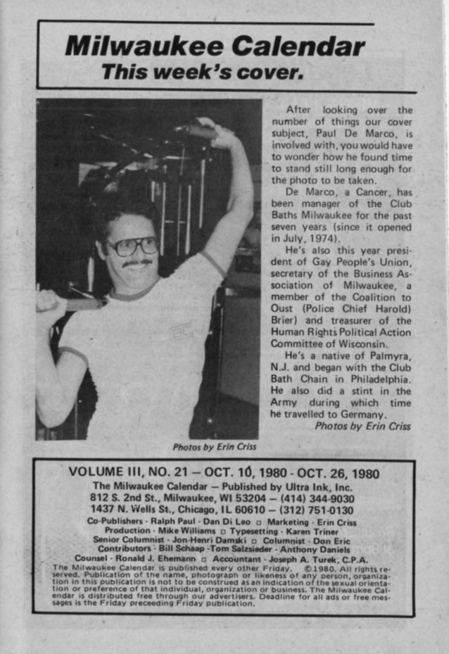 Paul DeMarco was active in various community organizations and businesses. He moved to Milwaukee to manage the local Club Bath from the time it opened in July 1974.