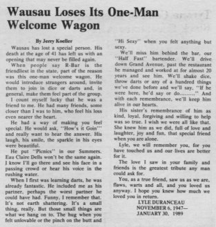 In the late 1980's, when people say R-Bar in Wausau is the friendliest bar in the state, part of the reason was this one-man welcome wagon: Lyle Duranceau. Called the "Half Fast bartender", he would introduce strangers around, invite them to join in dice or darts, and, in general, make them feel part of the group. Lyle also managed and worked at a restaurant on Grand Avenue in Wausau for almost 20 years. |