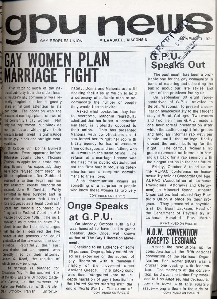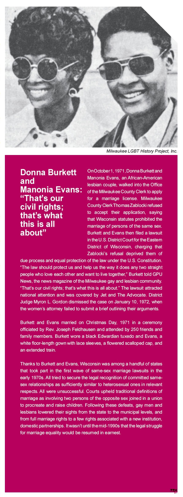 A biographical panel was created by the Milwaukee LGBT History Project about Manonia Evans and Donna Burkett, and was featured in a display first appearing at PrideFest 2011. The text from that display is as follows: Donna Burkett and Manonia Evans: “That’s our civil rights; that’s what this is all about” On October 1, 1971, Donna Burkett and Manonia Evans, an African-American lesbian couple, walked into the Office of the Milwaukee County Clerk to apply for a marriage license. Milwaukee County Clerk Thomas Zablocki refused to accept their application, saying that Wisconsin statutes prohibited the marriage of persons of the same sex. Burkett and Evans then filed a lawsuit in the U.S. District Court for the Eastern District of Wisconsin, charging that Zablocki’s refusal deprived them of due process and equal protection of the law under the U.S. Constitution. “The law should protect us and help us the way it does any two straight people who love each other and want to live together,” Burkett told GPU News, the news magazine of the Milwaukee gay and lesbian community. “That’s our civil rights; that’s what this is all about.” The lawsuit attracted national attention and was covered by Jet and The Advocate. District Judge Myron L. Gordon dismissed the case on January 10, 1972, when the women’s attorney failed to submit a brief outlining their arguments. Burkett and Evans married on Christmas Day, 1971 in a ceremony officiated by Rev. Joseph Feldhausen and attended by 250 friends and family members. Burkett wore a black Edwardian tuxedo and Evans, a white floor-length gown with lace sleeves, a flowered scalloped cap, and an extended train. Thanks to Burkett and Evans, Wisconsin was among a handful of states that took part in the first wave of same-sex marriage lawsuits in the early 1970s. All tried to secure the legal recognition of committed same-sex relationships as sufficiently similar to heterosexual ones in relevant respects. All were unsuccessful. Courts upheld traditional definitions of marriage as involving two persons of the opposite sex joined in a union to procreate and raise children. Following these defeats, gay men and lesbians lowered their sights from the state to the municipal levels, and from full marriage rights to a few rights associated with a new institution, domestic partnerships. It wasn’t until the mid-1990s that the legal struggle for marriage equality would be resumed in earnest. |