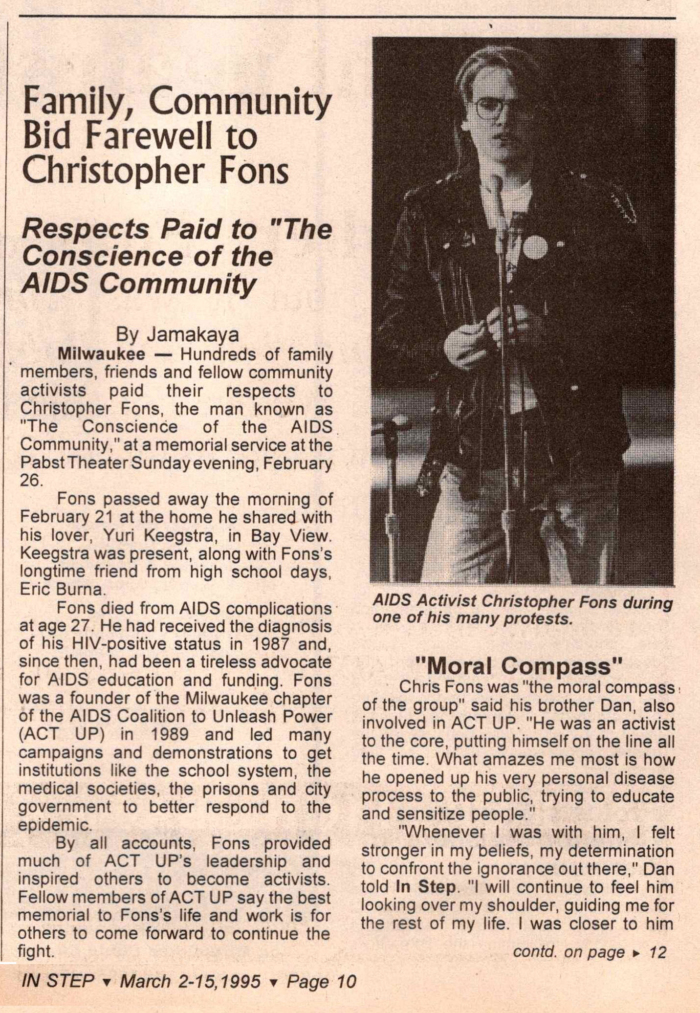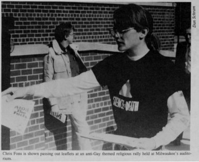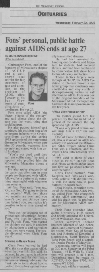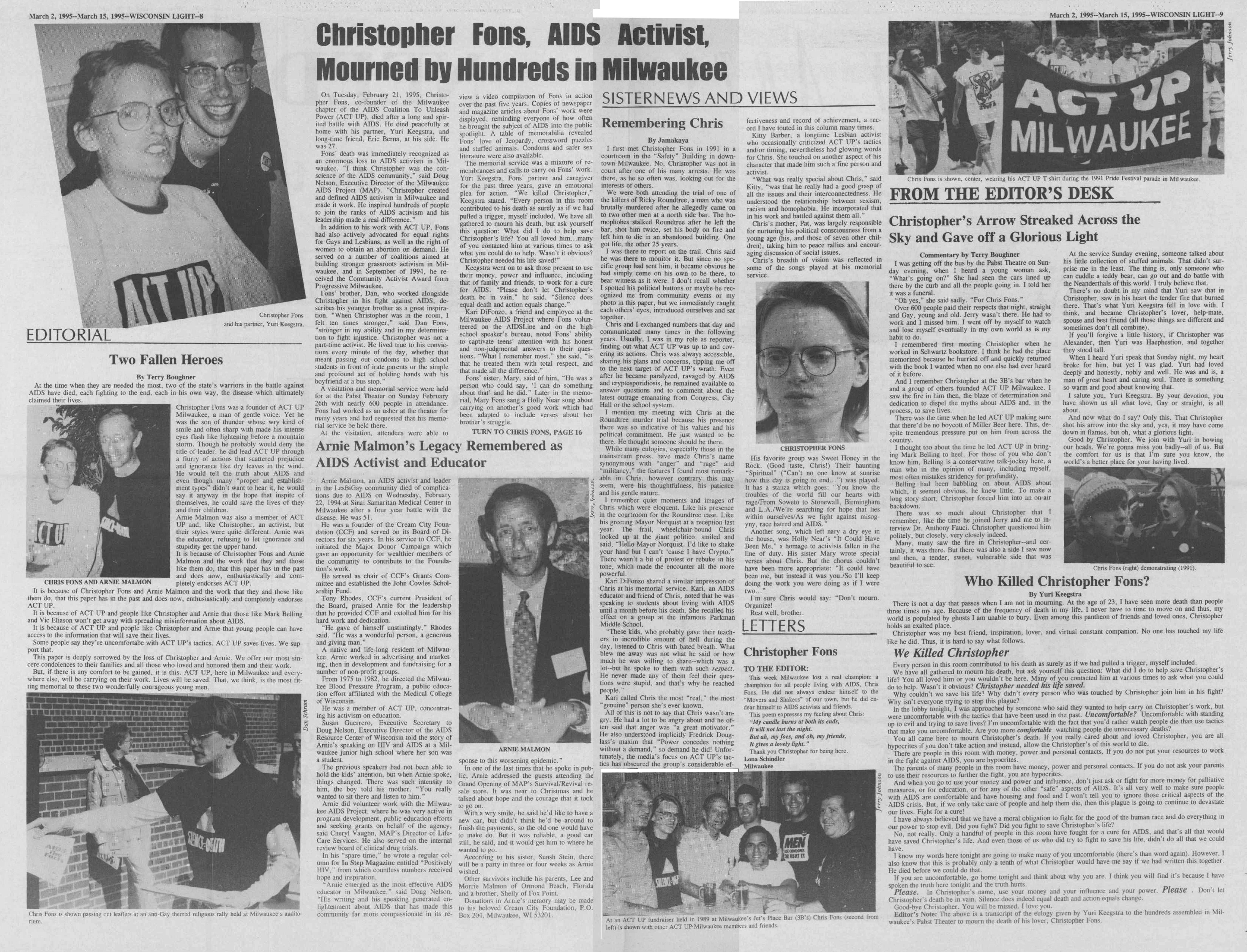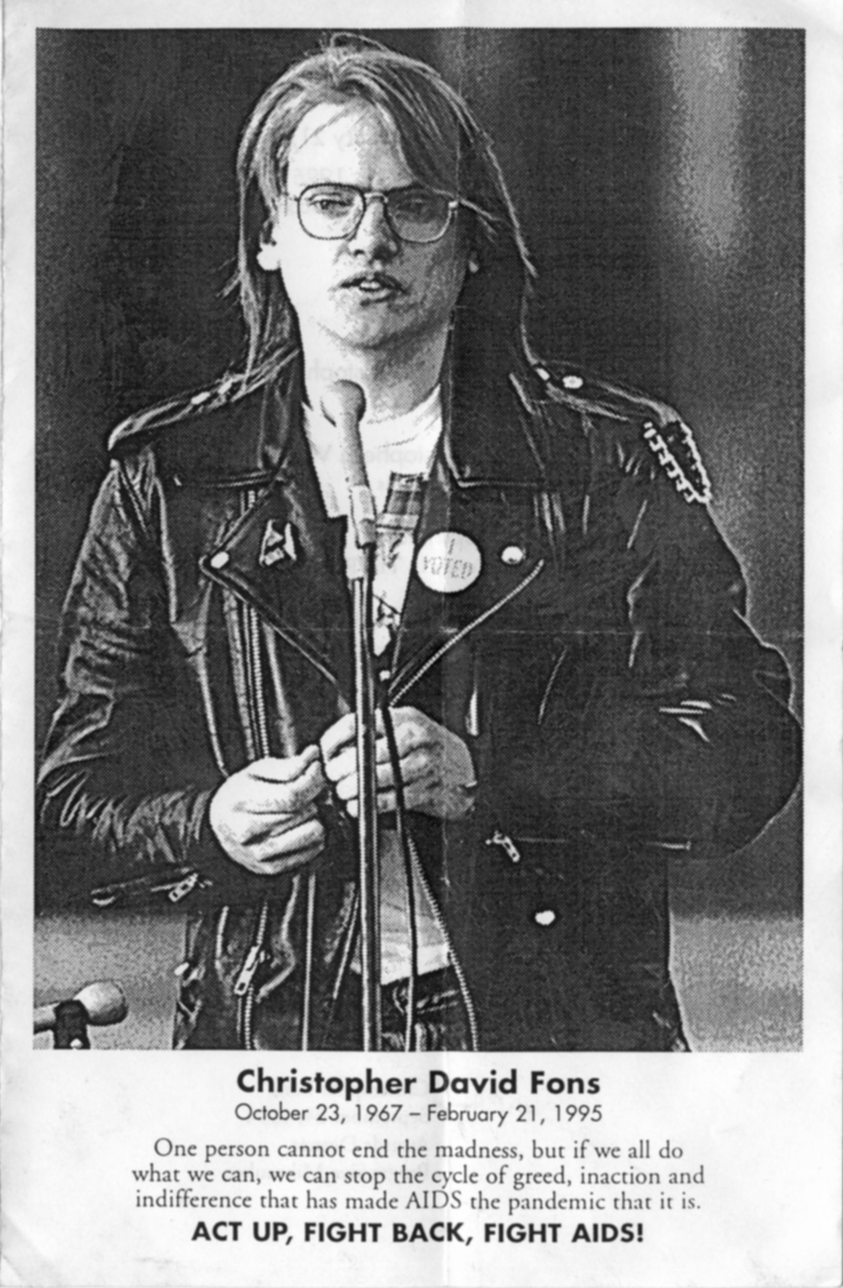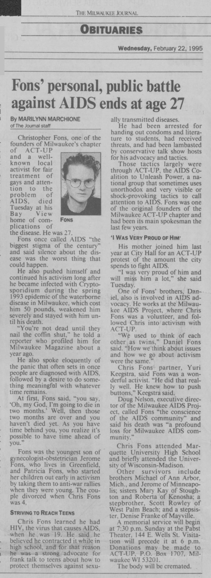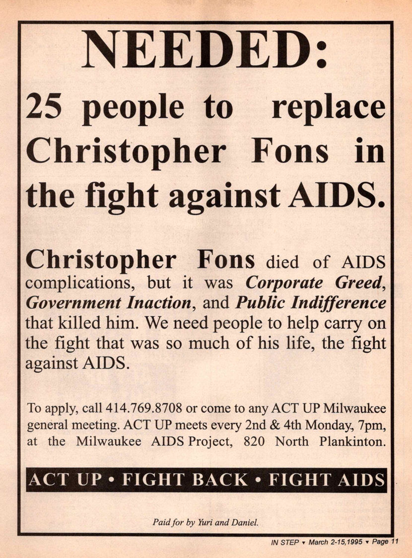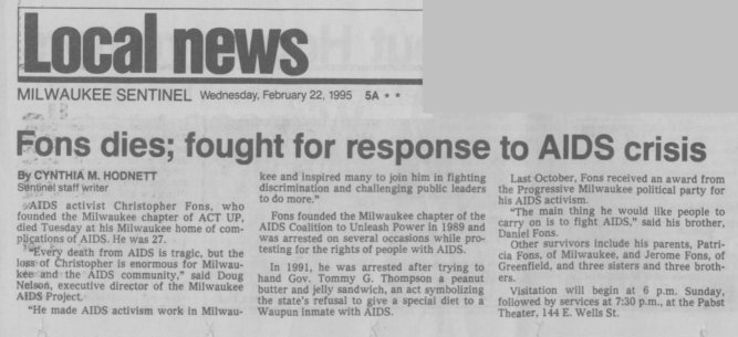 Christopher Fons was co-founder of the Milwaukee chapter of the AIDS Coalition to Unleash Power (ACT UP). "I think Christopher was the conscience of the AIDS community", said Doug Nelson, Executive Director of the Milwaukee AIDS Project (MAP). "Christopher created and defined AIDS activism in Milwaukee and made it work. He inspired hundreds of people to join the ranks of AIDS activism and his leadership made a real difference." In addition to his work with ACT UP, Fons had also actively advocated for equal rights for gays and lesbians, as well as the right of women to obtain abortion on demand. He served on a number of coalitions aimed at building stronger grassroots activism in Milwaukee, and in September of 1994, he received the Community Activist Award from Progressive Milwaukee. Fons' brother, Dan Fons, who worked alongside Christopher in his fights against AIDS, describes his younger brother as a great inspiration. "When Christopher was in the room, I felt ten times stronger", said Dan Fons, "stronger in my ability and in my determination to fight injustice. Christopher was not a part-time activist. He lived true to his convictions every minute of every day, whether that meant passing out condoms to high school students in front of irate parents or the simple and profound act of holding hands with his boyfriend at a bus stop". On Tuesday, February 21, 1995, Christopher died after a long and spirited battle with AIDS. He died peacefully at home with his partner, Yuri Keegstra, and long-time friend, Eric Berna, at his side. He was 27. (In an eerie coincidence, his friend Arnie Malmon, another very active AIDS victim who worked with Chris in the local ACT UP chapter, passed away just one day after Chris.) A visitation and memorial service were held for Christopher at the Pabst Theatre on Sunday February 26th with nearly 600 people in attendance. Fons had worked as an usher at the theatre for many years and had requested that his memorial service be held there. (Read the full text of Wisconsin Light's tribute to Christopher Fons and Arnie Malmon in the Vol. 8 No. 5 Issue of Wisconsin Light. Recollections: The following are recollections of others who have been kind enough to submit their personal memories to the webmaster. You are welcome to do the same! I knew Chris personally (and his brother Dan, and his boyfriend Yuri). I was involved in ACT UP Milwaukee in 1992-1994 and Chris was an inspiration. He was fearless. I remember picking him up at the police station at midnight because he'd been arrested for pasting flyers on bus shelters. I was a teenage baby queer at that point and he and others taught me to be unashamed.