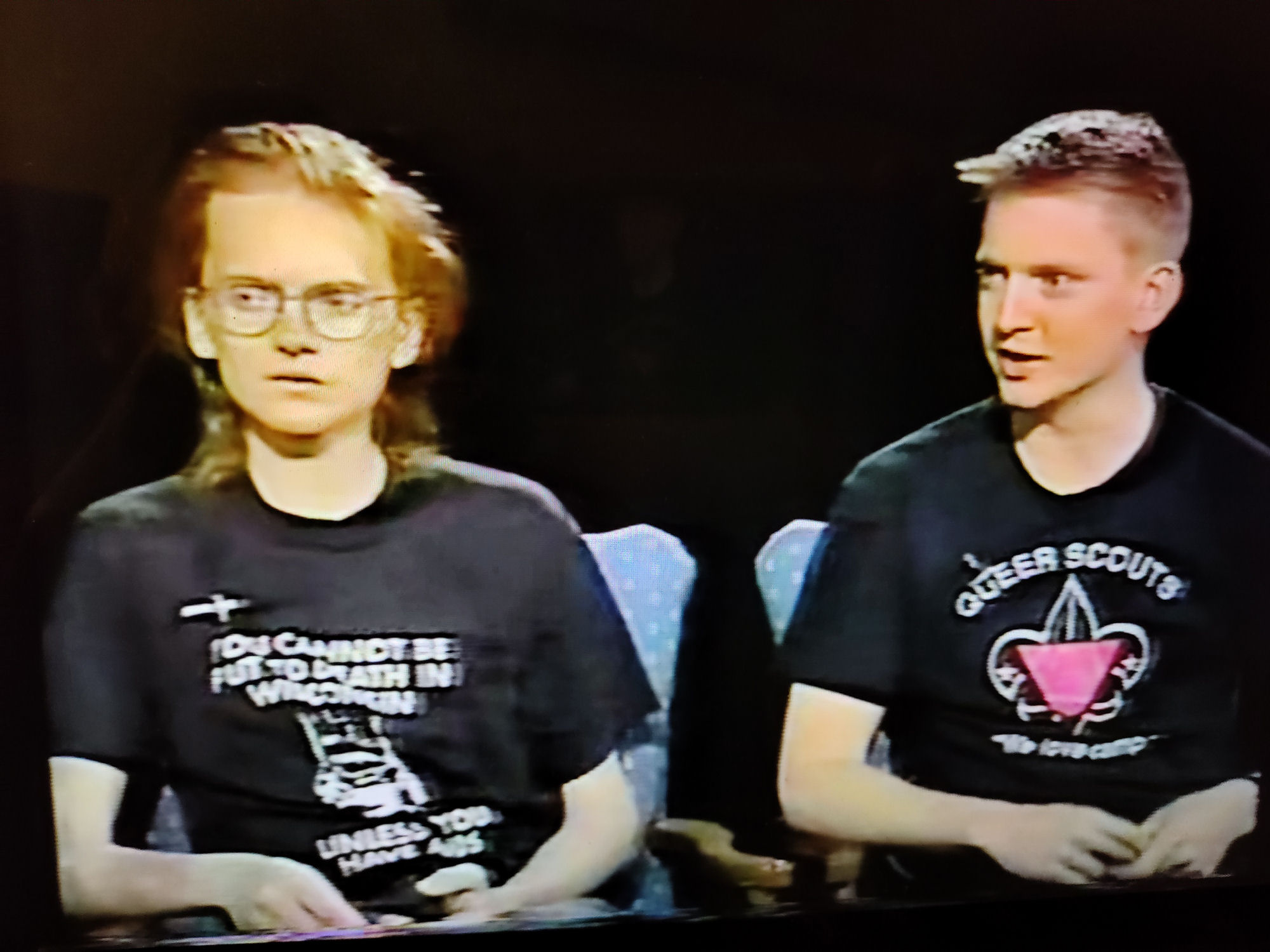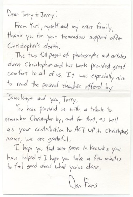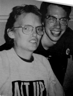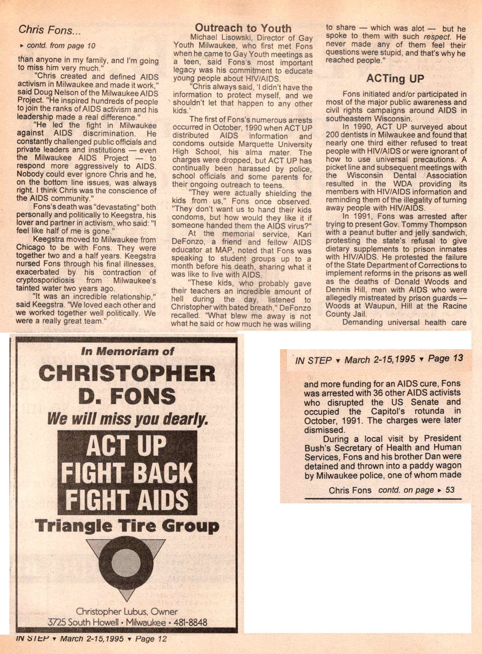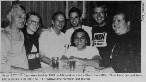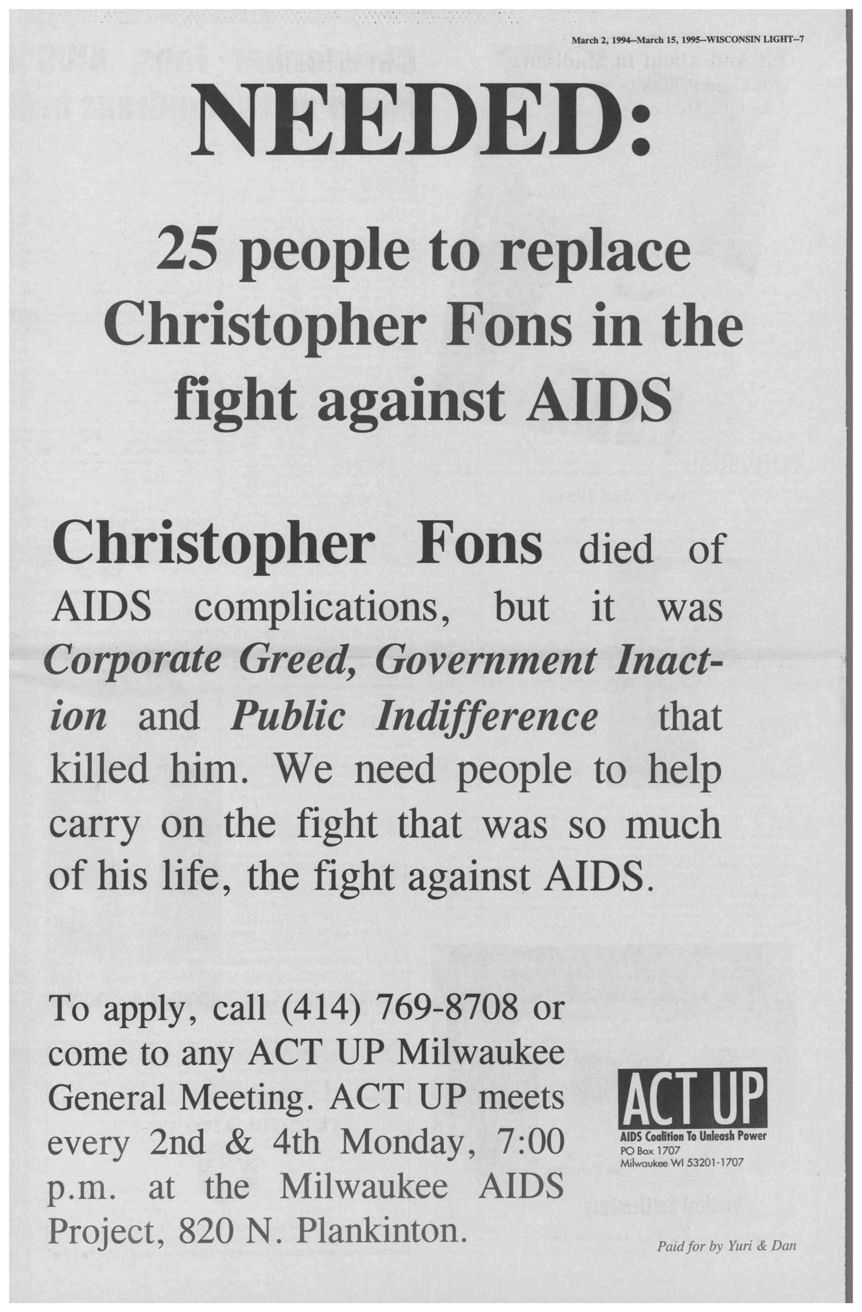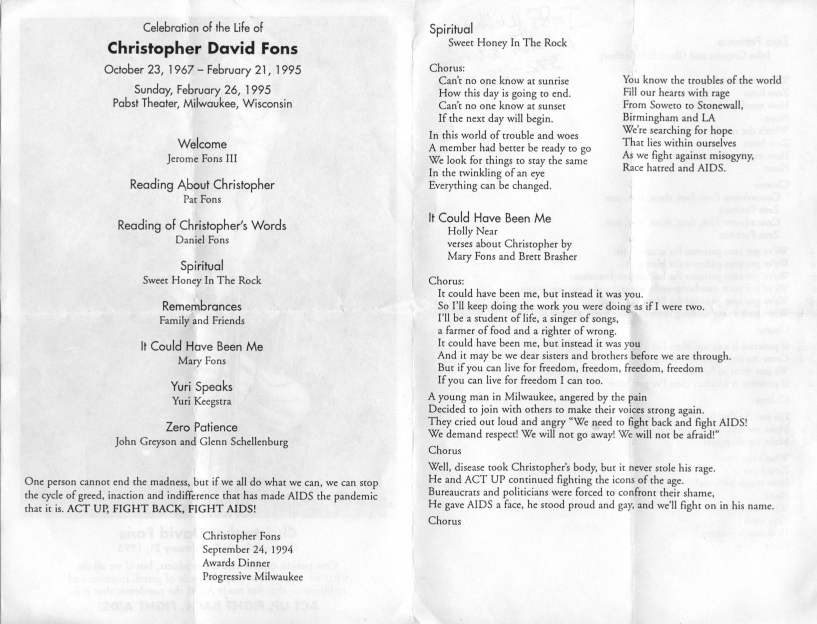 Christopher Fons was co-founder of the Milwaukee chapter of the AIDS Coalition to Unleash Power (ACT UP). "I think Christopher was the conscience of the AIDS community", said Doug Nelson, Executive Director of the Milwaukee AIDS Project (MAP). "Christopher created and defined AIDS activism in Milwaukee and made it work. He inspired hundreds of people to join the ranks of AIDS activism and his leadership made a real difference." In addition to his work with ACT UP, Fons had also actively advocated for equal rights for gays and lesbians, as well as the right of women to obtain abortion on demand. He served on a number of coalitions aimed at building stronger grassroots activism in Milwaukee, and in September of 1994, he received the Community Activist Award from Progressive Milwaukee. Fons' brother, Dan Fons, who worked alongside Christopher in his fights against AIDS, describes his younger brother as a great inspiration. "When Christopher was in the room, I felt ten times stronger", said Dan Fons, "stronger in my ability and in my determination to fight injustice. Christopher was not a part-time activist. He lived true to his convictions every minute of every day, whether that meant passing out condoms to high school students in front of irate parents or the simple and profound act of holding hands with his boyfriend at a bus stop". On Tuesday, February 21, 1995, Christopher died after a long and spirited battle with AIDS. He died peacefully at home with his partner, Yuri Keegstra, and long-time friend, Eric Berna, at his side. He was 27. (In an eerie coincidence, his friend Arnie Malmon, another very active AIDS victim who worked with Chris in the local ACT UP chapter, passed away just one day after Chris.) A visitation and memorial service were held for Christopher at the Pabst Theatre on Sunday February 26th with nearly 600 people in attendance. Fons had worked as an usher at the theatre for many years and had requested that his memorial service be held there. (Read the full text of Wisconsin Light's tribute to Christopher Fons and Arnie Malmon in the Vol. 8 No. 5 Issue of Wisconsin Light. Recollections: The following are recollections of others who have been kind enough to submit their personal memories to the webmaster. You are welcome to do the same! I knew Chris personally (and his brother Dan, and his boyfriend Yuri). I was involved in ACT UP Milwaukee in 1992-1994 and Chris was an inspiration. He was fearless. I remember picking him up at the police station at midnight because he'd been arrested for pasting flyers on bus shelters. I was a teenage baby queer at that point and he and others taught me to be unashamed.