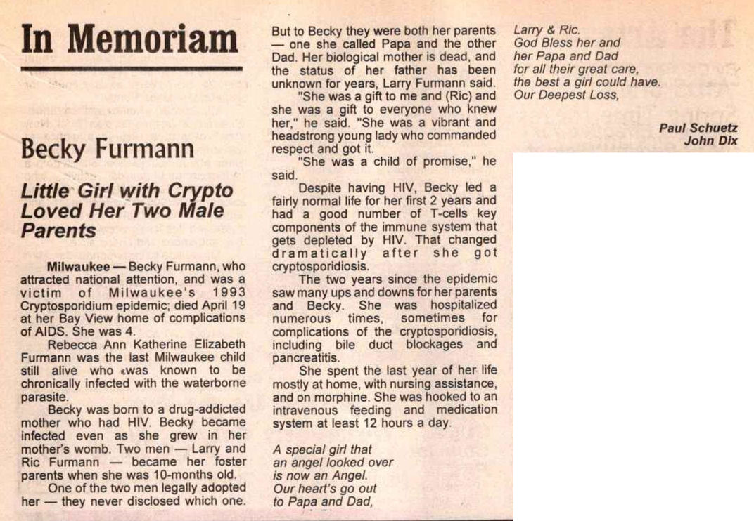 Rebecca Ann Katherine Elizabeth Furmann was the adopted child of one of the men in the gay couple of Larry and Ric Furmann. Becky had been born to a drug-addicted mother who also had HIV. Two men- Larry and Ric Furmann- became her foster parents when she was 10 months old. Despite having HIV, she led a fairly normal life for the first 2 years. That changed after she got cryptosporidiosis when in 1993 a problem in the City of Milwaukee's water supply caused a Cryptosporidium outbreak or epidemic that devastated many people already having immune system issues, including many in Milwaukee's gay community suffering from HIV and AIDS. On her death, she was believed to be the last Milwaukee child still alive who was known to have been chronically infected with the waterborne parasite from the City's water supply problem. ![]() (In Step vol. 12-08, April 1995) |