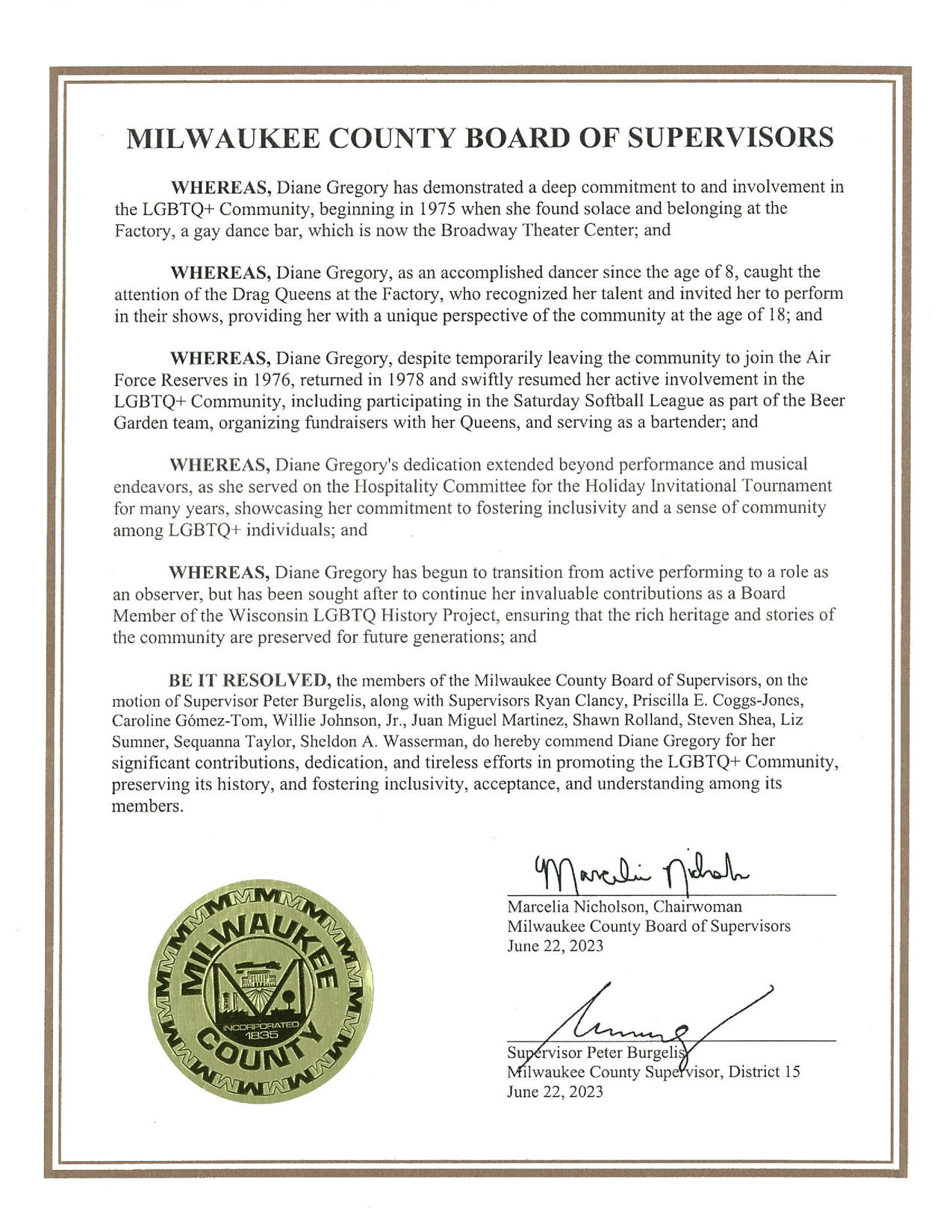 Diane Gregory, known by many simply as 'Legs', was a pioneering and popular member of Milwaukee's women's community: as a stage performer, as a bartender, as a sports team member, as an activist and fundraiser, from the 1970s to the 2020's. She was involved with some of the most well known LGBT bars of that 50-plus-year period, including The (original) Factory, D.K.'s and Kathy's Nut Hut. Late in 2023, Gregory was invited to join the Board of Directors of the Wisconsin LGBTQ History project, and has contributed immensely to the expanded efforts of the Project in that role. By the initiative of Chairwoman Marcelia Nicholson and Supervisor Peter Burgelis, some forty individuals and organizations were recognized by the Milwaukee County Board of Supervisors and presented citations in a special meeting on June 22, 2023. "Today, we recommit Milwaukee County to supporting and uplifting the LGBTQ+ community, celebrating those who make a substantial positive impact on the LGBTQ+ community in Milwaukee County," Supervisor Burgelis stated. "Today we are making up for lost time. We have dozens of people to recognize, not because so much has been done in the past year, but because decades and even years ago, there was little to no recognition of the LGBTQ+ community. I am thankful to work with a Chairperson who enables our County Board to honor these well-deserving individuals." Recognitions were made in the categories of "Community Leaders and Activists," "Government Leaders," "Business and Cultural Leaders," and "Health and Wellness Leaders". Gregory's citation (in which they are largely self-described) read as follows: