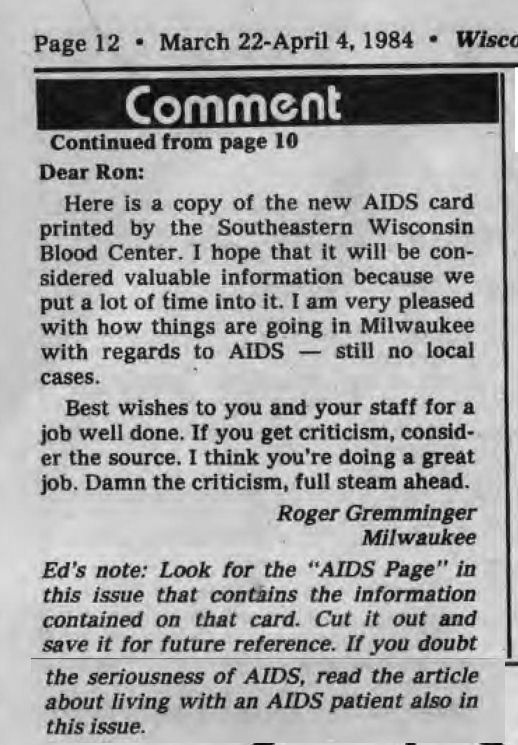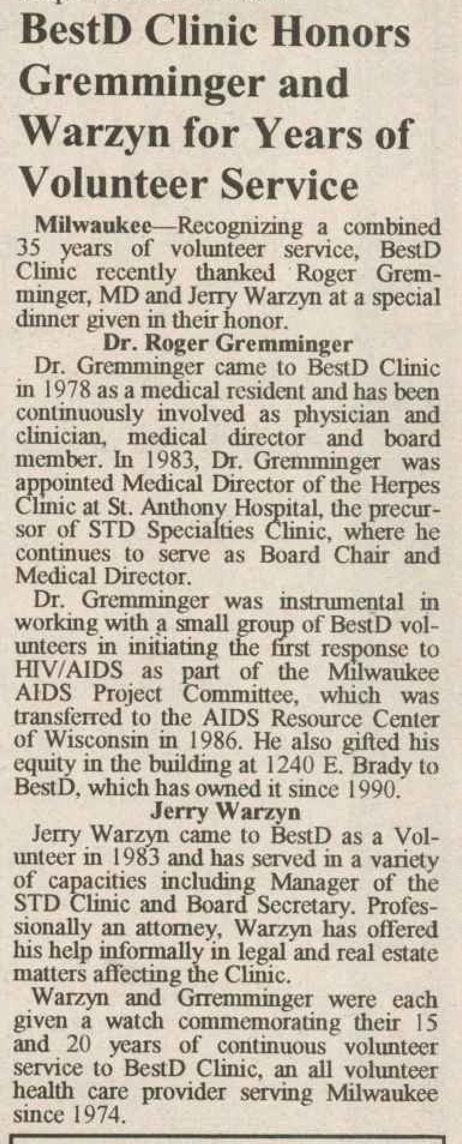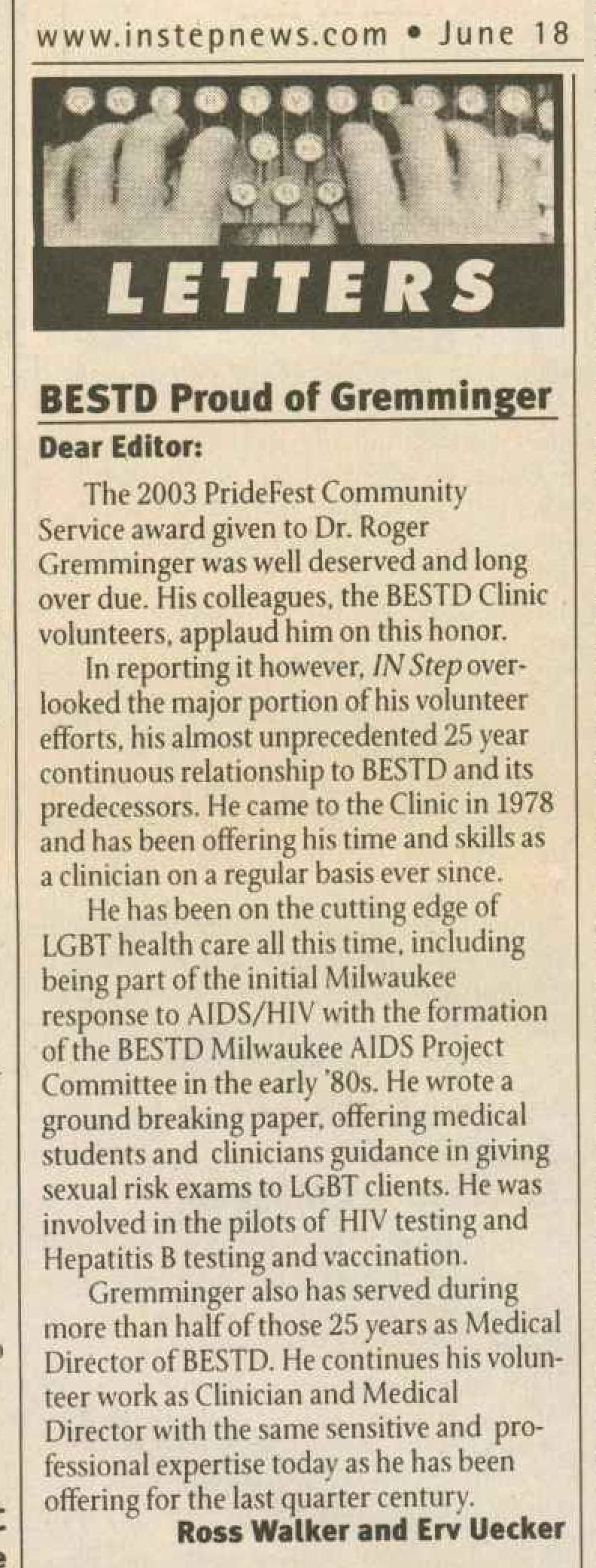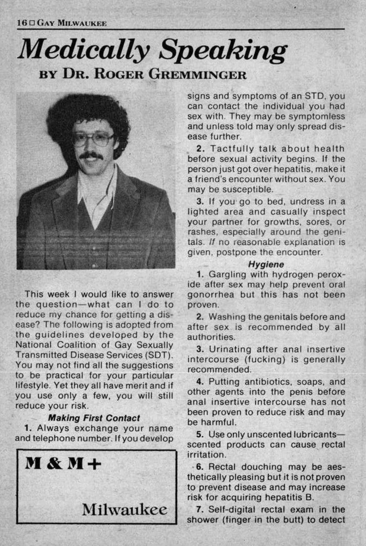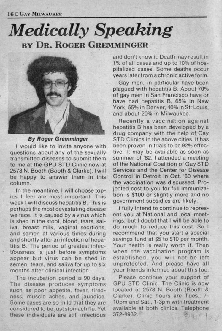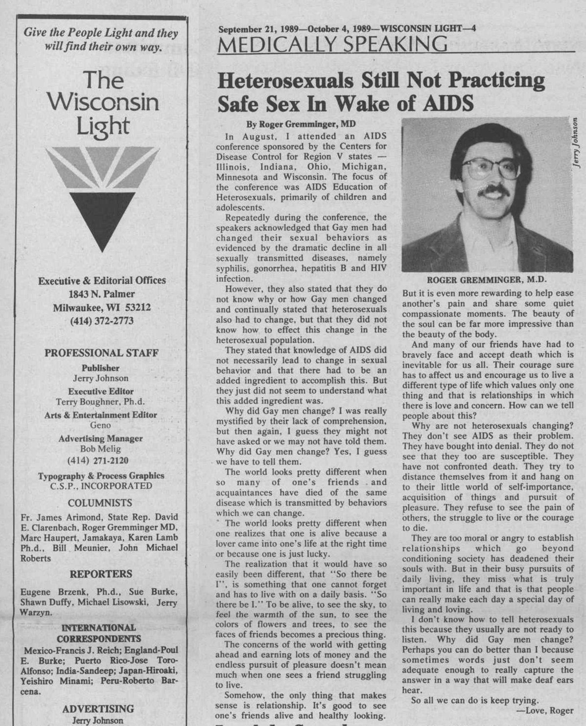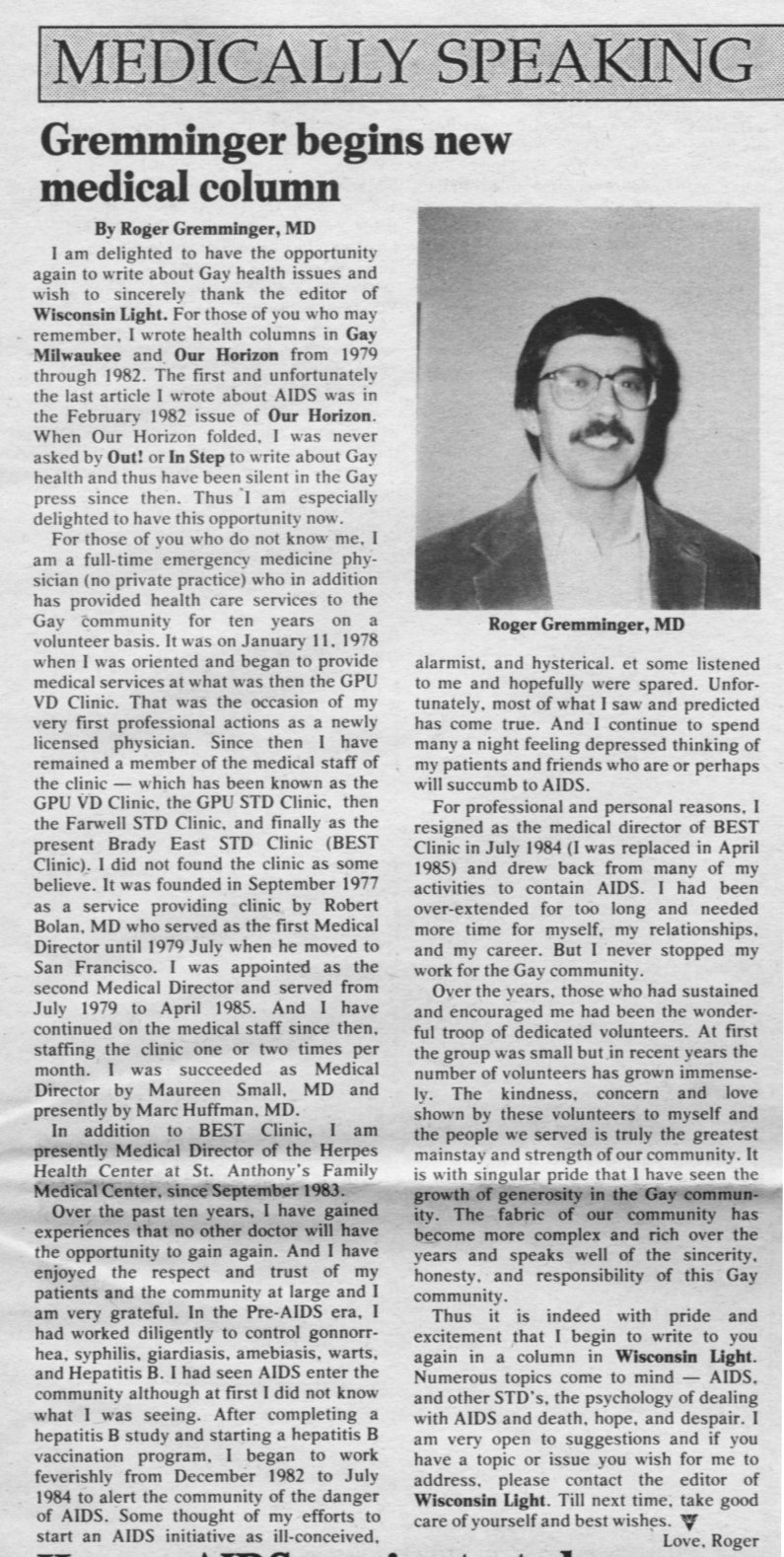Roger contributed articles to the local LGBT community media on a regular basis. He wrote health columns in Gay Milwaukee and Our Horizon from 1979 until February 1982, when Our Horizon ceased publication. But when Wisconsin Light began publishing late in 1987, Dr. Gremminger was asked to contribute, and thus began appearing his "Medically Speaking" column in that newspaper.