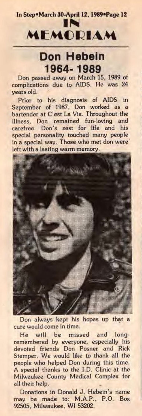 Don Hebein was a bartender at C'est La Vie bar in Milwaukee. He passed away of complications due to AIDS. |