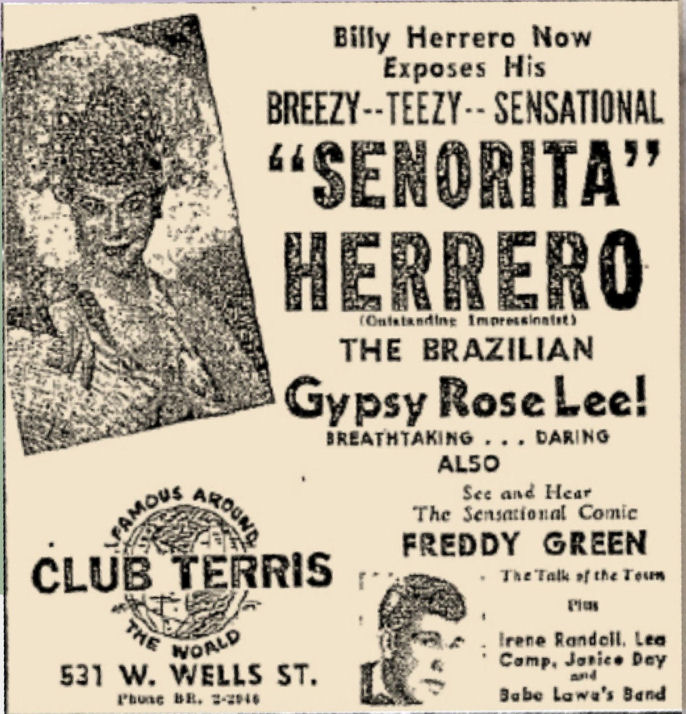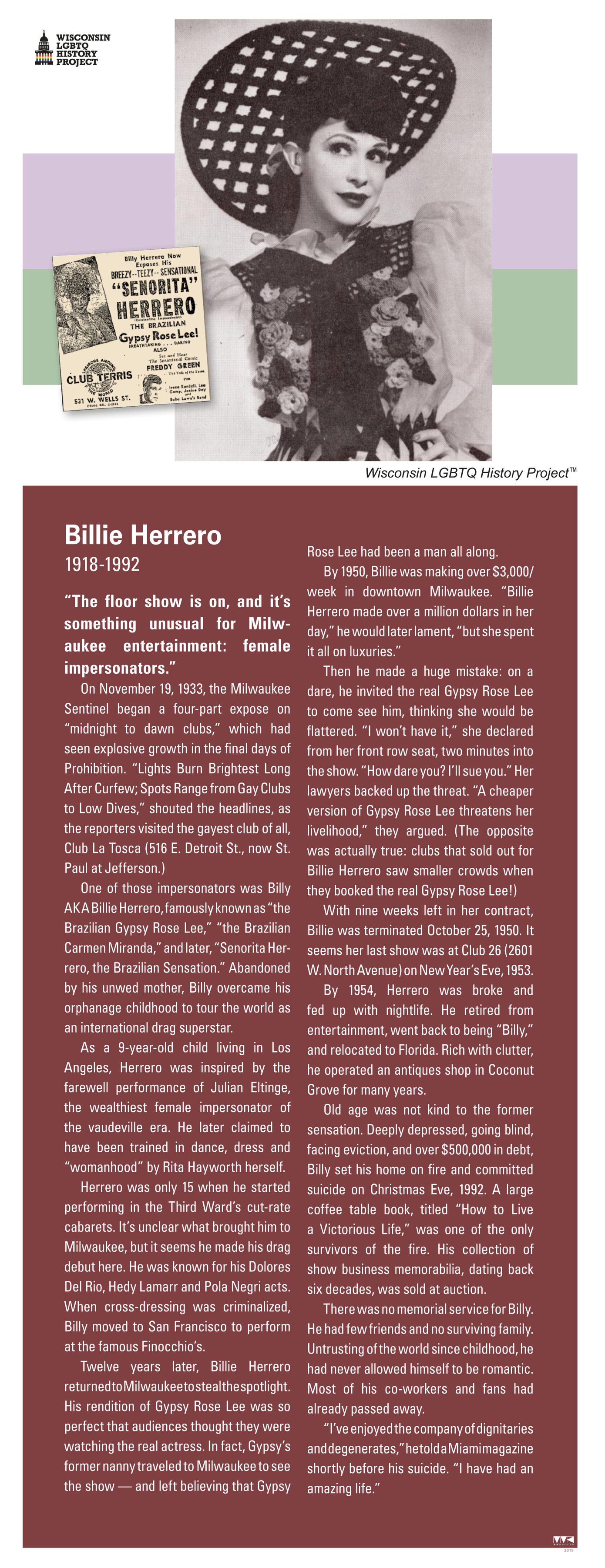(Text and photos by Michail Takach, for an historical panel created by this project in 2019. The panel is on loan to the 'This Is It' bar in downtown Milwaukee.) "The floor show is on, and it’s something unusual for Milwaukee entertainment: female impersonators." On November 19, 1933, the Milwaukee Sentinel began a four-part expose on "midnight to dawn clubs," which had seen explosive growth in the final days of Prohibition. "Lights Burn Brightest Long After Curfew; Spots Range from Gay Clubs to Low Dives," shouted the headlines, as the reporters visited the gayest club of all, Club La Tosca (516 E. Detroit St., now St. Paul at Jefferson.) One of those impersonators was Billy (aka Billie) Herrero, famously known as "the Brazilian Gypsy Rose Lee," "the Brazilian Carmen Miranda," and later, "Senorita Herrero, the Brazilian Sensation." Abandoned by his unwed mother, Billy overcame his orphanage childhood to tour the world as an international drag superstar. As a 9-year-old child living in Los Angeles, Herrero was inspired by the farewell performance of Julian Eltinge, the wealthiest female impersonator of the vaudeville era. He later claimed to have been trained in dance, dress and "womanhood" by Rita Hayworth herself. Herrero was only 15 when he started performing in the Third Ward’s cut-rate cabarets. It’s unclear what brought him to Milwaukee, but it seems he made his drag debut here. He was known for his Dolores Del Rio, Hedy Lamarr and Pola Negri acts. When cross-dressing was criminalized, Billy moved to San Francisco to perform at the famous Finocchio’s. Twelve years later, Billie Herrero returned to Milwaukee to steal the spotlight. His rendition of Gypsy Rose Lee was so perfect that audiences thought they were watching the real actress. In fact, Gypsy’s former nanny traveled to Milwaukee to see the show — and left believing that Gypsy Rose Lee had been a man all along. By 1950, Billie was making over $3,000 per week in downtown Milwaukee. "Billie Herrero made over a million dollars in her day," he would later lament, "but she spent it all on luxuries." Then he made a huge mistake: on a dare, he invited the real Gypsy Rose Lee to come see him, thinking she would be flattered. "I won’t have it," she declared from her front row seat, two minutes into the show. "How dare you? I'll sue you." Her lawyers backed up the threat. "A cheaper version of Gypsy Rose Lee threatens her livelihood," they argued. (The opposite was actually true: clubs that sold out for Billie Herrero saw smaller crowds when they booked the real Gypsy Rose Lee!) With nine weeks left in her contract, Billie was terminated October 25, 1950. It seems her last show was at Club 26 (2601 W. North Avenue) on New Year's Eve, 1953. By 1954, Herrero was broke and fed up with nightlife. He retired from entertainment, went back to being "Billy," and relocated to Florida. Rich with clutter, he operated an antiques shop in Coconut Grove for many years. Old age was not kind to the former sensation. Deeply depressed, going blind, facing eviction, and over $500,000 in debt, Billy set his home on fire and committed suicide on Christmas Eve, 1992. A large coffee table book, titled "How to Live a Victorious Life," was one of the only survivors of the fire. His collection of show business memorabilia, dating back six decades, was sold at auction. There was no memorial service for Billy. He had few friends and no surviving family. Untrusting of the world since childhood, he had never allowed himself to be romantic. Most of his co-workers and fans had already passed away. "I've enjoyed the company of dignitaries and degenerates," he told a Miami magazine shortly before his suicide. "I have had an amazing life." |